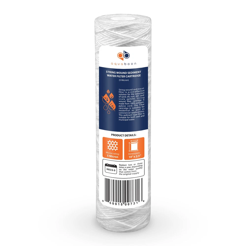 Crystal Clear Filtration at Its Best: Experience superior filtration with Aquaboon's string wound water filter. Our 10 inch water filter cartridge captures even finer particles of rust and dirt, with its innovative winding density. Perfect Fit, Perfect Performance: Our whole house filter seamlessly integrates with your whole house water filter system. This 5 micron water filter 10 x 2.5 is universally compatible with under-sink, countertop, and reverse osmosis systems. Longer Life, Less Fuss: Our whole house water filter replacement features enhanced dirt-holding capacity, meaning fewer changes. With graded density, the water filter cartridge traps more debris, extending the life of your house water filter. Extended Protection, Lasting Purity: With an optimized design, our water filter 10 x 2.5 cartridge works harder and lasts longer. Enjoy up to 6 months of effective sediment removal with whole house filter cartridge, depending on the well water quality. Pure Taste, Clean Water: Eliminate unpleasant tastes and odors with our string wound water filter cartridges. Enjoy every drop from your whole house water filter system for well water without worrying about contaminants. Consistent Flow, No Pressure Drop: Our 5 micron water filter ensures optimal water flow with minimal pressure drop, even in high-sediment environments. This rope filter keeps your home’s water running smoothly, ensuring efficiency and performance. Easy Installation, Quick Maintenance: Designed for easy setup, whole house water filter cartridge fits standard 10 inch water filter housings, making installation a breeze. The quick cartridge replacement process ensures your system remains effective. Versatile Filtration for Every Home: Whether filtering municipal or well water, our whole house filter is ideal for any house water filter system. Its adaptability ensures clean, filtered water across various applications and setups. Compatible 10 inch Water Filter Cartridges: Compatible with Aqua Pure AP110 water filter cartridge, AP010, Culligan P5, 155186-52, American Plumber W5W, Ametek WP-5, Bruner WP-5, ClearChoice 84621, Whirlpool WHKF-WHSW, Cuno CFS110, Dupont WFPFC4002, etc. Compatible 10x2.5 Water Filter Housings: Compatible with OmniFilter RS5, Neo-Pure WPP-25098-05, Pentair DEV910908, Pentek WP-5, CW-MF, WP5, CW-5, etc. Fits most Standard 10 inch size housings like Dupont PF 2800, PF 3800 Series, WFPF38001C.