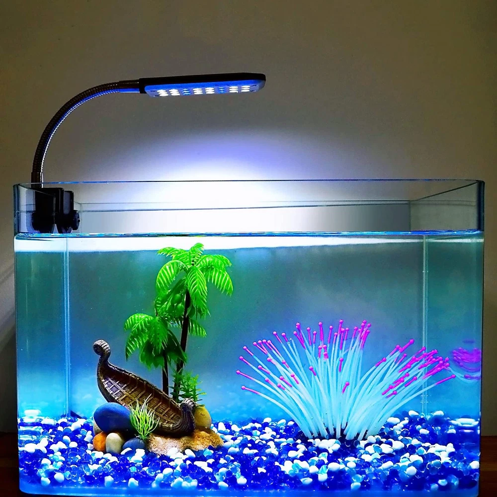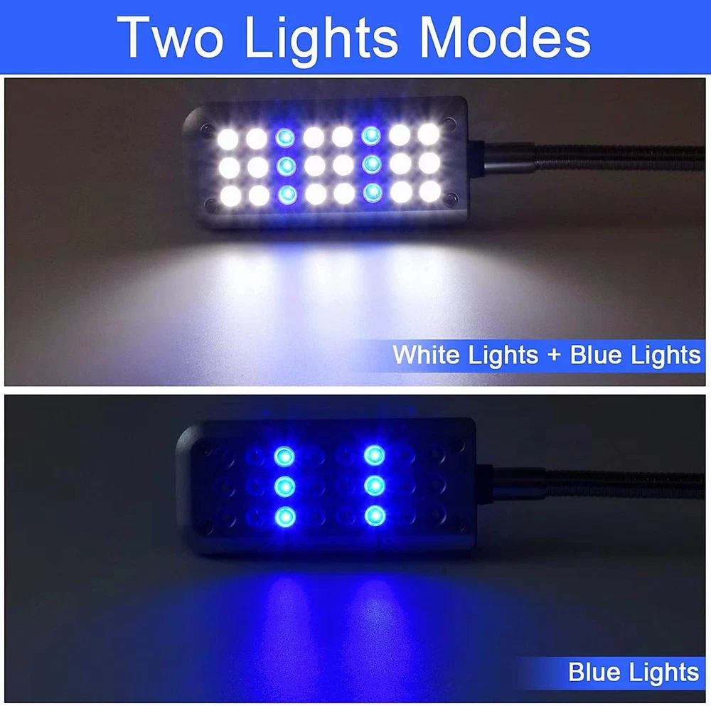 Two Light Modes: the small aquarium light has twenty-four LEDs in total, including eighteen white LEDs and six blue LEDs, in day mode, all lights on; in night mode, blue lights on, the aquarium lights for fish tank suitable for both freshwater and saltwater Super Bright and Energy Saving: with power 1.5 watt, this aquarium LED light gives off very bright crisp light for fish tanks below 10 gallon water; low power consumption, the small fish tank light is 40% energy saving than ordinary LED lights Easy to Use: just clip the aquarium lamp on and adjust the screw on a suitable tightness, and the flexible metal tubing help to adjust the nano aquarium light to any desirable direction and angle Long Lifespan: the service life of the aquarium clip light is 20,000 hours, durable and long lasting, don’t bother you to change your aquarium lights frequently Suggested Aquarium Size: the length of the clip on aquarium light body is 3.54 inches, which is suggested to be used for 6 - 15 inches long fish tanks or 2 - 10 gallon tank Product Description Small Fish Tank Light Clip on Led Light for Fish Tank Below 5 Gallon Goehiaul clip on led light for aquarium has 24 LEDs in total, including 18 white LEDs and 6 blue LEDs, in day mode, all lights on; in night mode, blue lights on, the power is 1.5 watt, suitable for fish tanks below 5 gallon. Adjustable Arm The arm of the fish bowl light is made from high quality metal hose, which help to adjust the light to any desirable direction. 2 Light Modes The small aquarium lighting has two light modes, which is all lights on and blue lights on, to meet different light needs for day and night. High Quality LEDs This LED aquarium light is made of high quality LEDs, no flickering, long lifespan and energy efficient. Customer Application Cases For Fish Bowl For Rectangle Tank For Circular Tank Notes: Please do not tighten the light to much in case it cracking the glass. Only suit for fish tanks with wall thickness smaller than 0.39 inches.