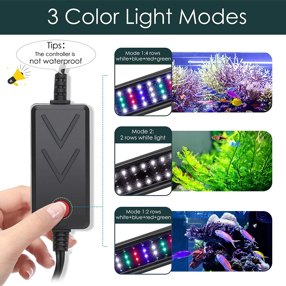< ul >< li >ππγ 14W Classic Aquarium Light γ 14W light suitable 12inch - 18inch fish tank , input votage is AC100 - 240V , Output votage is DC24 - 72V , 40pcs LEDs ( White - 24pcs Blue - 6pcs Red - 6pcs Green - 4pcs ), Power cord is 5 . 9ft ( 1 . 8m ), Lumen is 773lm , Kelvin is 6500K white LED < li >ππγ 3 Color Light Modes , Independent Controller γ 3 light modes can be set : β White β‘2 rows light White + Blue + Red + Green β’4 rows lightWhite + Blue + Red + Green οΌ Press the switch once to turn on white light , press the switch again to turn off the light , press the switch for the third time to turn on mode 2 white + blue , press again to turn off the light , press the switch for the fifth time to turn on mode 3 white + blue + red + green , and that cycle repeats . Notes : this light cannot be fixed mode . < li >ππγ 5730 LEDs Fish Tank Light , High - definition Translucent γ All use 5730 high - brightness lamp beads , high color rendering , high clarity and transparency , bright colors . The light goes directly to the bottom of the fish tank , making the fish tank more translucent and more ornamental , restoration of primay colors of fish and aquatic plants , closer to nature visual enjoyment . can last up to 20000 hours of lighting . < li >ππγ 4 Rows of Lamp Beads , Adjustable Extendable Bracket γ Compared with ordinary lights , the widened panel , 4 rows of lamp beads , thicker height , speed up the heat dissipation of the lamp . Use 3 . 5mm diameter stainless steel bracket , Stable and durable , adjustable Extendable bracket can fit most fish tanks , Please choose the right fish tank light according to the length of the fish tank . < li >ππγ Full Spectrum Brightness , Sutable for Freshwater Plants γ full specturm ratio for aquarium , make aquatic plants more comprehensive photosynthesis and color development , which is helpful for plant growth and viewing . < br >< div > < div > < h2 > Product Description < div > < div > < div > < h3 > Welcome to AQQA < p > AQQA is a professional shop specializing in aquarium supplies and accessories , all products from this store the actual filming of goods < p > AQQA ----- Aquarium accessories , Quality A +