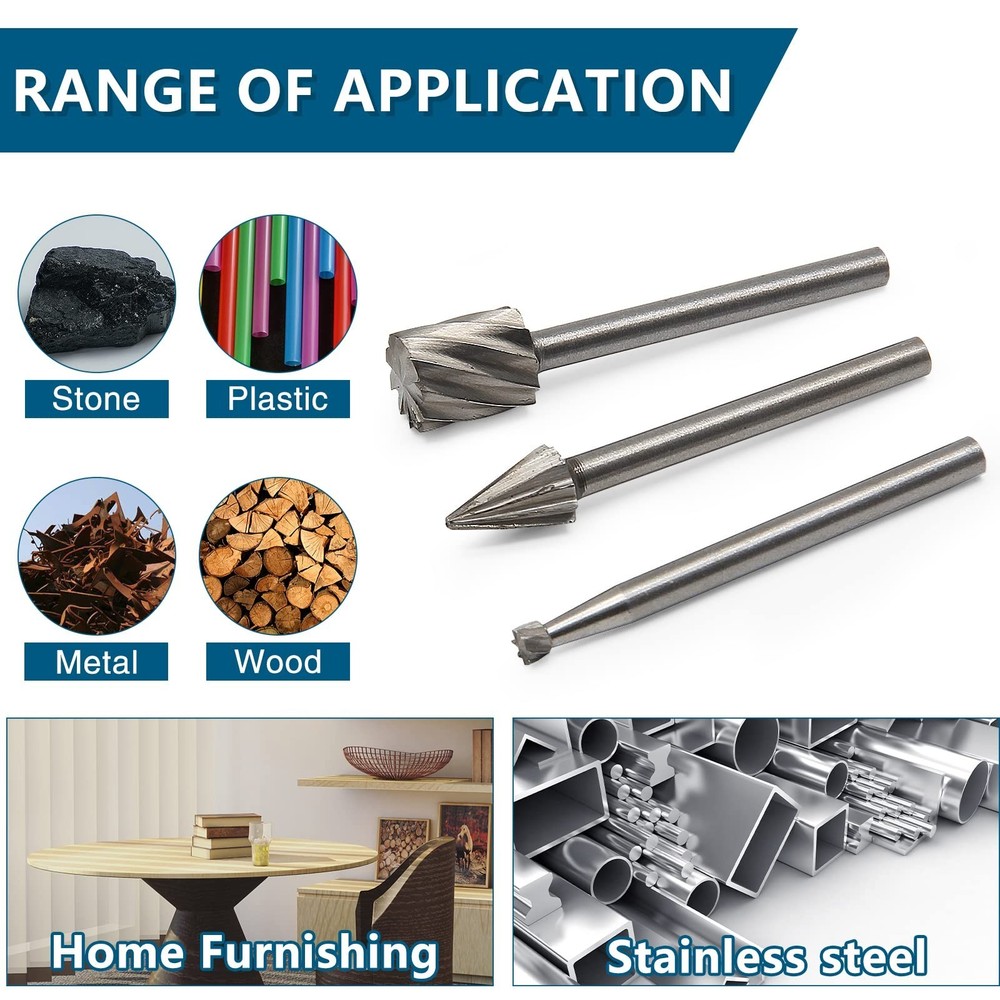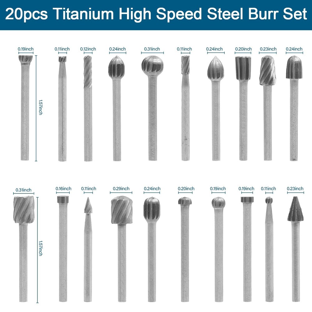 Aracombie 20pcs Tungsten Carbide Burr Set Rotary Grinding Bit, 1/8 Inch Shank Wood Carving Bits Rotary Engraving Bits, Drill Bit Deburring Bit Set for Wood, Plastic, Metal Product Details Brand: Aracombie Special Feature: Compact, Electric Style: Pencil Item dimensions L x W x H: 5.91 x 3.94 x 1.97 inches Manufacturer: Aracombie Part Number: AST220413-503 Item Weight: 1.76 ounces Product Dimensions: 5.91 x 3.94 x 1.97 inches Item model number: AST220413-503 Style: Pencil Special Features: Compact, Electric Batteries Included?: No Batteries Required?: No Date First Available: April 13, 2022 Premium Tungsten CarbideAracombie's rotary burrs are crafted from industrial-grade carbide material that maintains exceptional durability and heat resistance. The robust construction ensures long-lasting performance even under intensive use. Universal Shank CompatibilityFeatures standardized shank design that seamlessly fits most popular rotary tool brands. The secure grip prevents slippage during operation while allowing quick bit changes between different tasks. Efficient Double-Cut DesignCross-cut flute pattern provides aggressive material removal on various surfaces. The innovative design reduces clogging while delivering smoother finishes compared to conventional single-cut burrs. Versatile Application RangePerfect for detailed engraving, metal deburring, wood shaping, and plastic modification. The diverse burr shapes handle everything from fine detail work to heavy stock removal with consistent results. Professional PerformanceEngineered for vibration-free operation and precise control. The balanced weight distribution allows comfortable extended use while maintaining accuracy across different materials and applications. Products Features: Aracombie's rotary burrs are crafted from industrial-grade carbide material that maintains exceptional durability and heat resistance. The robust construction ensures long-lasting performance even under intensive use. Perfect for detailed engraving, metal deburring, wood shaping, and plastic modification. The diverse burr shapes handle everything from fine detail work to heavy stock removal with consistent results. Specification: Length: 1.57 inch Shank: 1/8 inch / 3mm Package Content: 20 x Rotary Grinding Bit