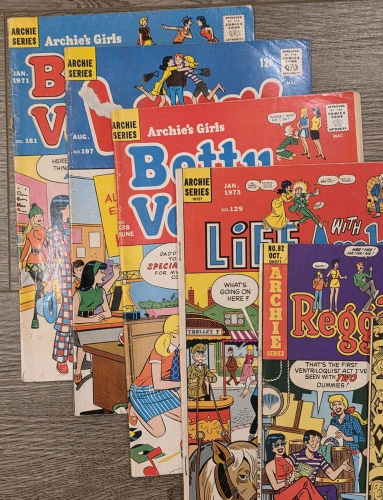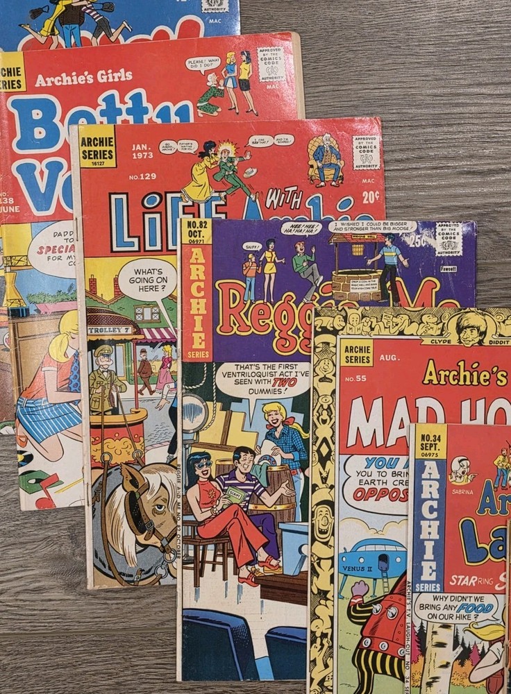 Archie Series (AS#) No. 21 Archie and Me (June 1968) No. 34 Archie's T.V. Laugh out (Sept 1975) AS#06975 No. 55 Archie's MAD HOUSE (August 1967) No. 82 Reggie and Me (Oct 1975) AS#06971 No. 129 Life with Archie (Jan 1973) AS#16127 No. 138 Archie's Girls Betty and Veronica (June 1967) No. 197 Laugh (Aug 1967) No. 181 Archie's Girls Betty and Veronica (Jan 1971) AS# This lot of 8 Archie Series comics features issues from the Silver Age era, focusing on beloved characters like Archie, Reggie, Veronica, and Betty. The comics are in English and published by Archie Comics in the United States. With a mix of humor and heartwarming moments, these comics are a must-have for any Archie fan looking to add to their collection of classic US comics. Get ready to relive the adventures of Archie and his friends in this delightful set of comics.