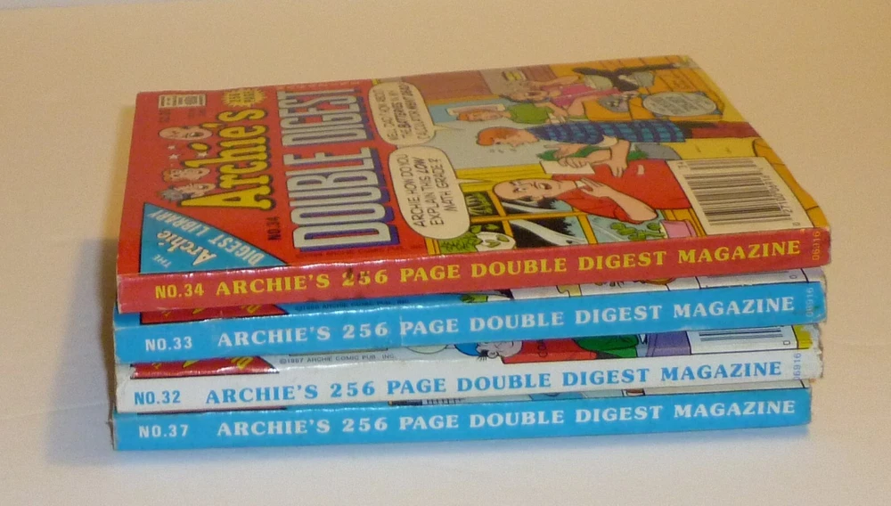 Archie's Double Digest magazine no. 33 vintage comics 1988 32, 34, 37. The four digests are in good vintage condition. Spine stain on No. 34. No.32 has corner wear. There is a slight musty smell from being stored. Please see the photos as they help with my description. Shipping ~ Ground advantage takes 2-5 business days. I like to ship in two business days. Combined shipping ~ Combined shipping cost is available when you order more than one listing from me. Thanks for looking. Returns~ Item may be returned within 30 days for refund. The refund will be issued once the item is received in original selling condition. Damage~ I package my sold items well but i f your item happens to be received damaged please provide me with photos of damage so I can file a damage claim with USPS. Please keep the box or envelope and all shipping materials for claim. Questions~ Feel free to message me. If there is any issue with order please contact me first so I can help you in a timely and friendly manner. International~ All items are shipped via eBay's global shipping program. You may want to c heck which customs and import charges may apply before you purchase or bid. Buyer is responsible to pay if there is any additional import charges, d uties, t ariffs, e xcise taxes, penalties, charges, v alue added taxes, etc. Check with your country's customs office for more specific details if you are not sure. Thank you.