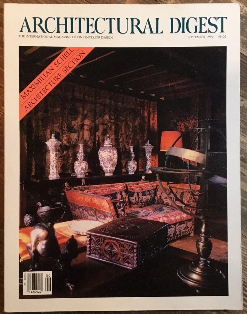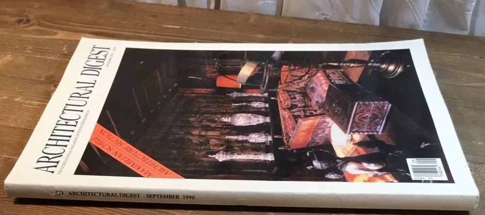 This issue of Architectural Digest magazine from September 1990 features the stunning Library of Chateau de Meautry, as well as a variety of other interesting topics. The magazine is written in English and is published monthly by Publishing Corp. It has dimensions of 8"x11" and is sleeved. In addition to the article about the Library of Chateau de Meautry, this issue covers a range of topics including Mughal style jewelry, the architecture of the East, flora and fauna, interior design, and artful living. It is a great resource for those interested in architecture, interior design, and art.