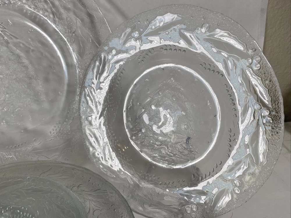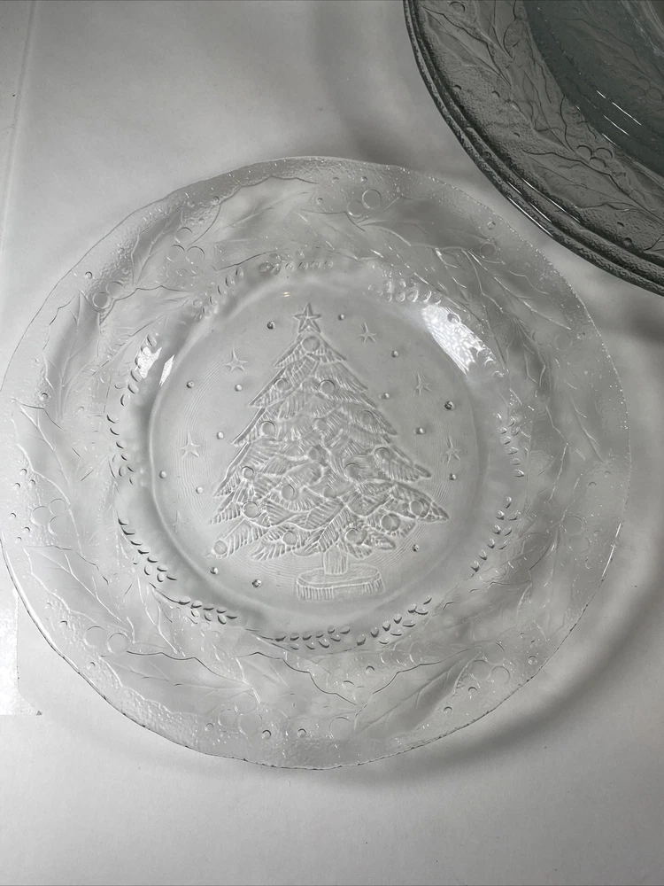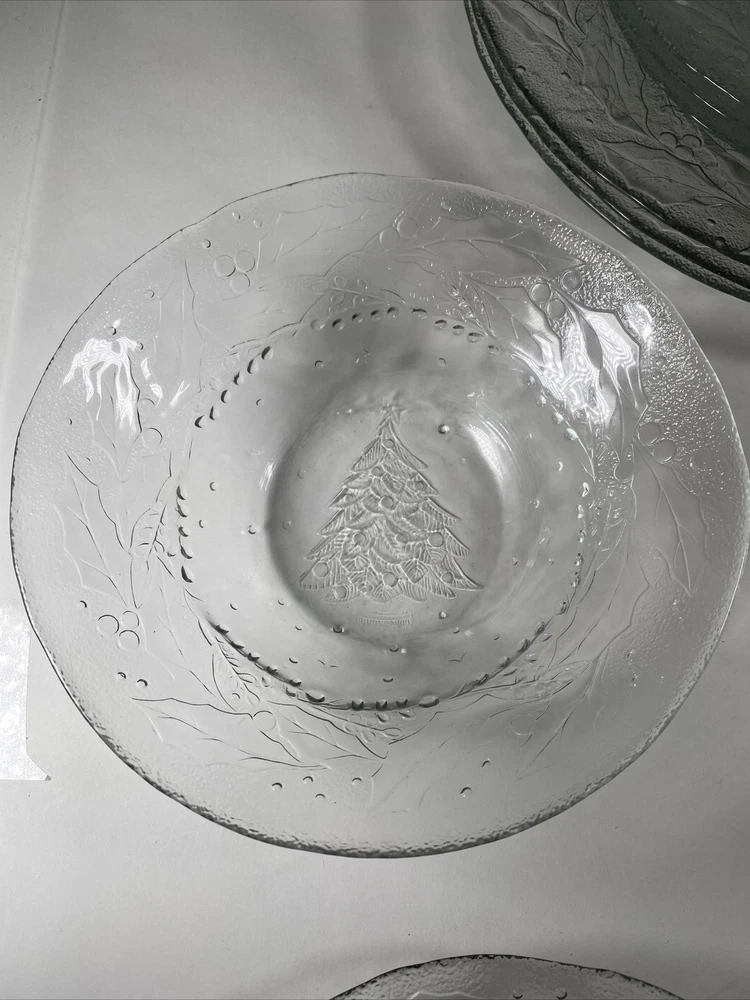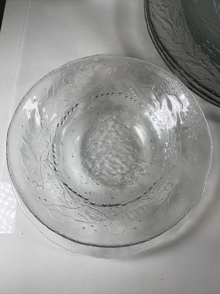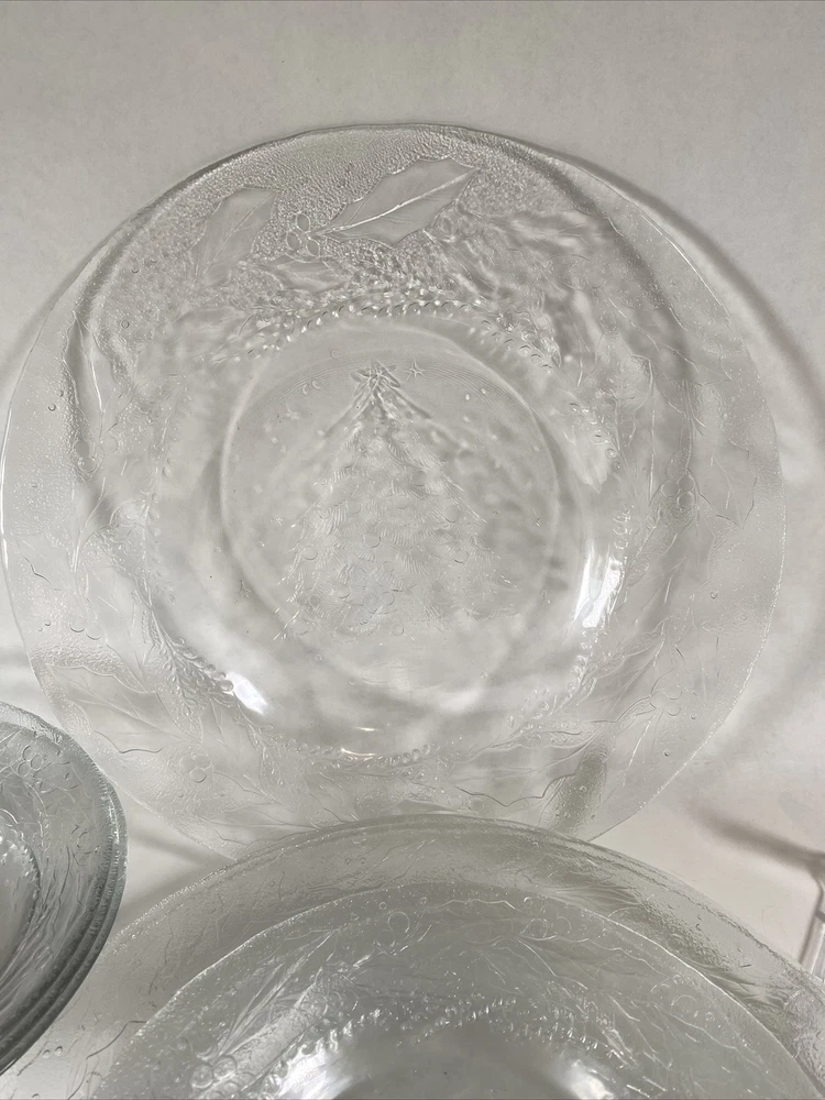 Arcoroc Christmas HOLLY TREE Soup Bowls & Plates Glass SET OF 12 PIECES TOTAL Retired Pattern 4 Bowls = 6.5” diameter x 2” deep 4 Salad Plates = 7.75” diameter 4 Dinner Plates = 10.75” diameter Stunning vintage set with no chips or cracks!