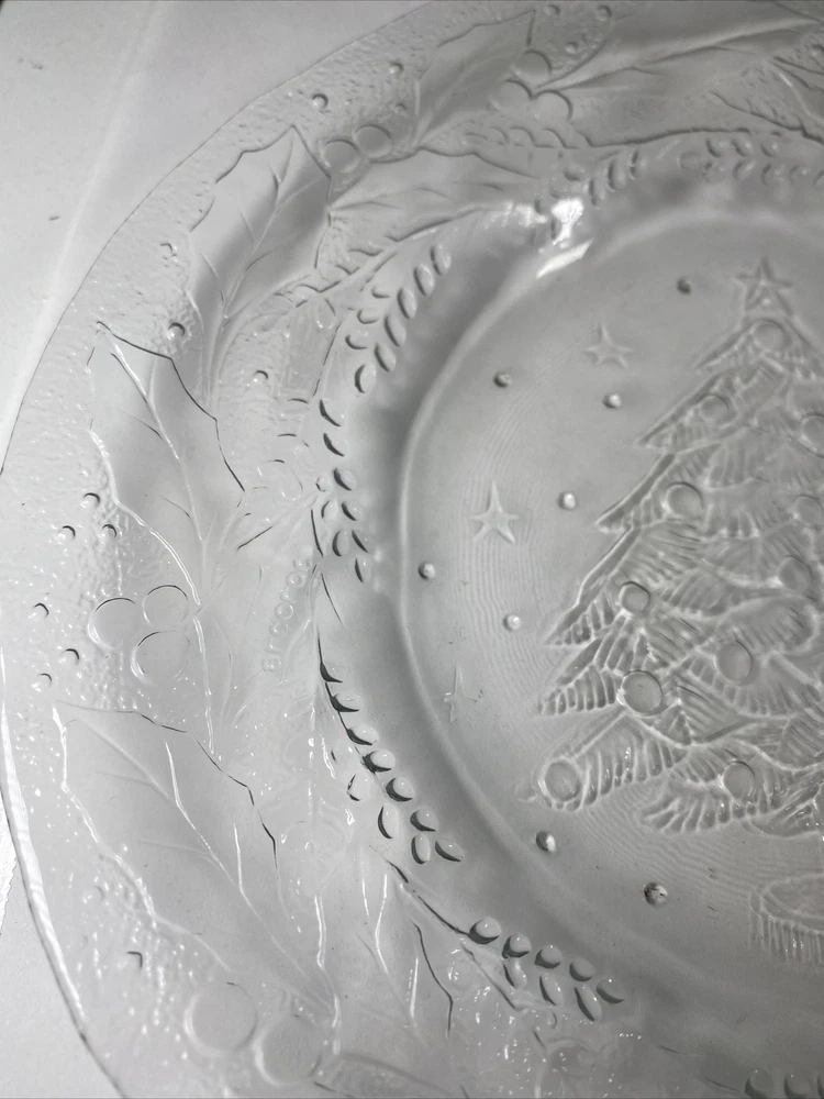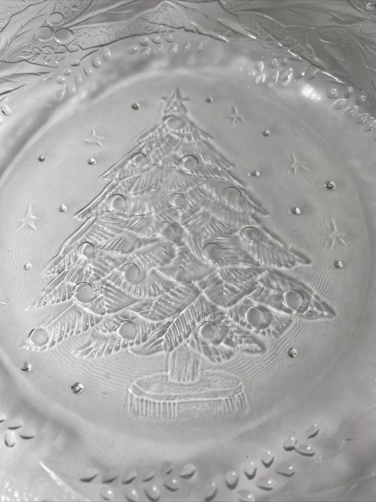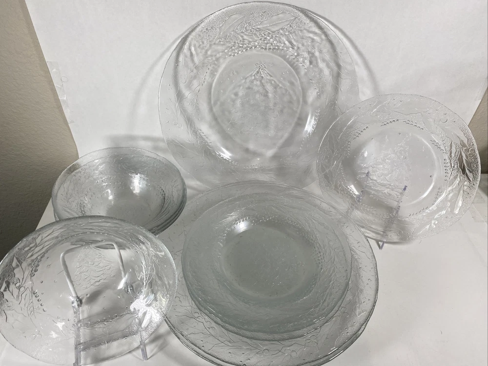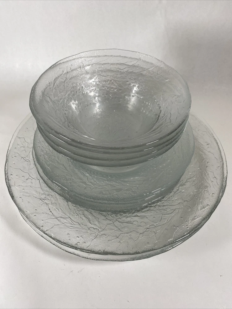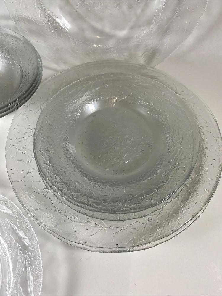 Arcoroc Christmas HOLLY TREE Soup Bowls & Plates Glass SET OF 12 PIECES TOTAL Retired Pattern 4 Bowls = 6.5” diameter x 2” deep 4 Salad Plates = 7.75” diameter 4 Dinner Plates = 10.75” diameter Stunning vintage set with no chips or cracks!