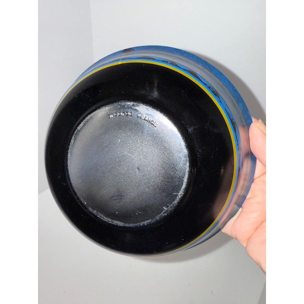 Striking geometric patterns dance across this Arcoroc France bowl, a captivating piece that elevates any table setting. The bowl features a deep black interior that contrasts beautifully with the vibrant blue exterior, adorned with a geometric design in shades of blue, yellow and black. The smooth, rounded shape feels comfortable in your hands, making it perfect for serving up your favorite dishes. Imagine using this bowl to present a colorful salad at a summer barbecue, or to serve a comforting soup on a chilly winter evening. It would also be perfect for displaying decorative items on a coffee table. Material: Glass Type: Serving Bowl Color: Blue Pattern: Geometric Keywords: Arcoroc France, bowl, serving bowl, geometric, patterned, black, blue, vintage, retro, kitchen, dining, tableware, dish, decorative bowl S