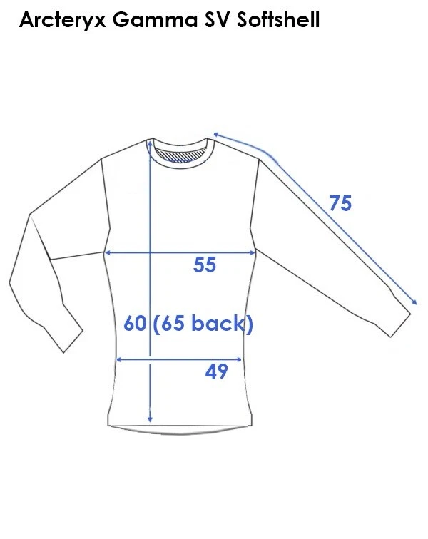 Arcteryx Gamma SV Softshell Polartec Full Zip Jacket Embroidered logo on the left side of the chest and on the back of the neck Inside Polartec fleece CONDITION very good, generally without defects, but there are a few very small spots SIZE Medium (8-10) MEASUREMENTS: Shoulders - raglan Sleeve (from the neck) - 75 cm Width under the armpits - 55 cm Width at the waist - 49 cm Length (from the neck) - 60 cm, behind 65 cm
