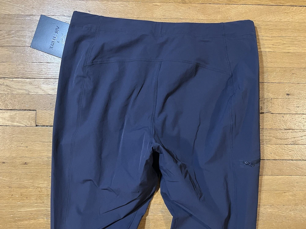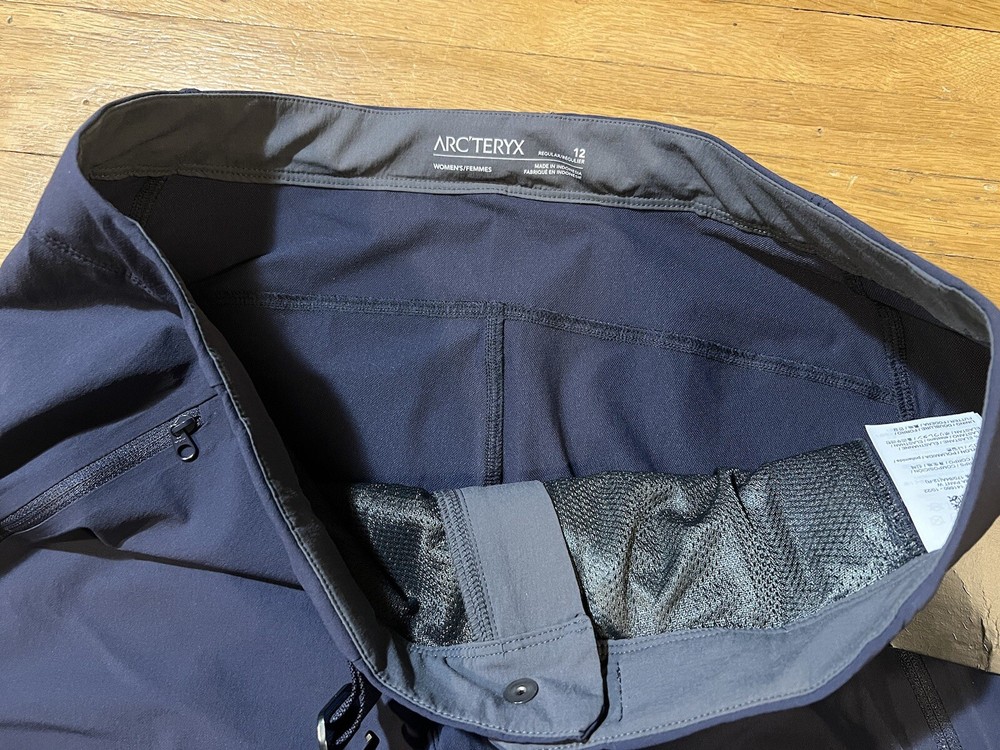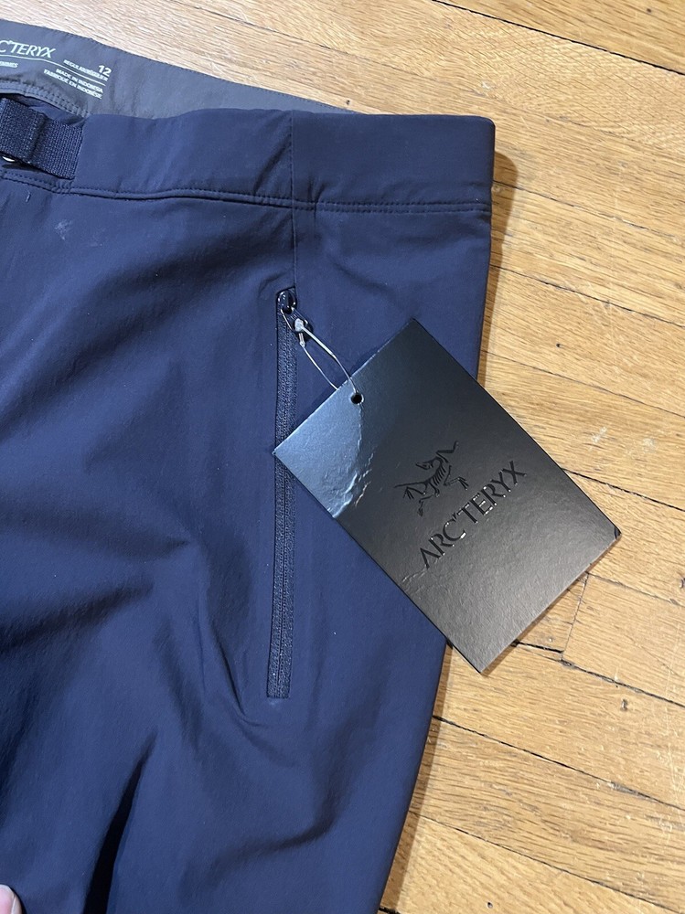 The product is a pair of Arc'teryx Gamma Pants for women in size 12 and a blue color. These pants are designed for hiking and trail activities, featuring a regular fit and a pant style. They are brand new with tags attached, indicating that they have not been previously worn. The Arc'teryx brand is known for producing high-quality outdoor clothing, suggesting that these pants are likely durable and well-suited for outdoor adventures.