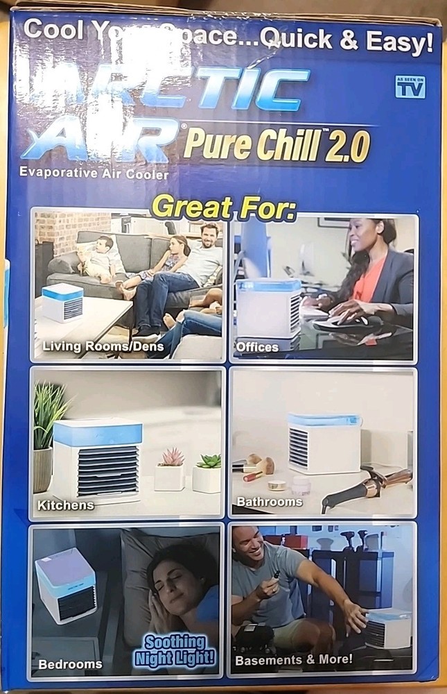 Arctic Air Pure Chill 2.0 About This Product Introducing Arctic Air Pure Chill, the compact, personal air cooler that helps cool and humidify your space. The secret is Hydro-Chill Technology that uses evaporative cooling to help turn hot air into cold refreshing air. It's so simple to set up and use - just pour water in the top fill tank, plug it in, and enjoy. Arctic Air Pure Chill has multi-directional air vents so you can point the cool air in the direction you want. Its sleek, compact design fits nicely on your desk, nightstand, or coffee table - wherever you need it. Use it in your home and work offices, garages, campers, dorm rooms, reading nooks, and more - It's even convenient for travel. Highlights Personal space cooler Adjustable - 4 speeds Quiet operation Lightweight and portable Holds 0.25 gallons of water Please look at the photo's.If there are more than one of the same item it will be a stock photo. Feedback is automatically given after you leave feedback for me. Shipping discount will be give in the form of a refund when buying more than 1 item after package is ready for shipping Thanks for looking.