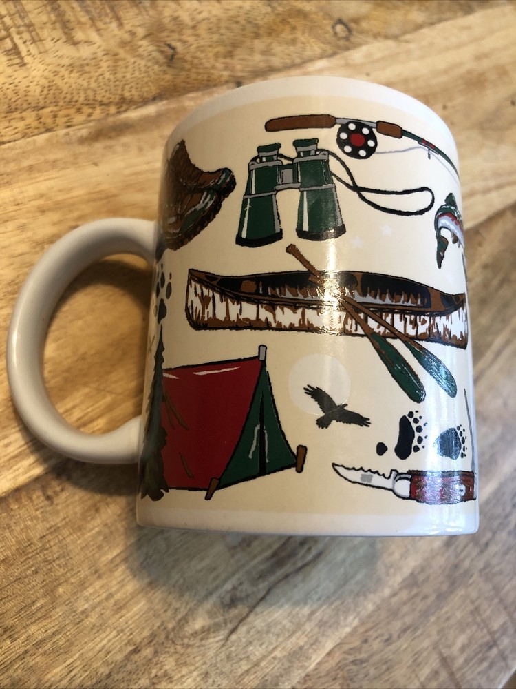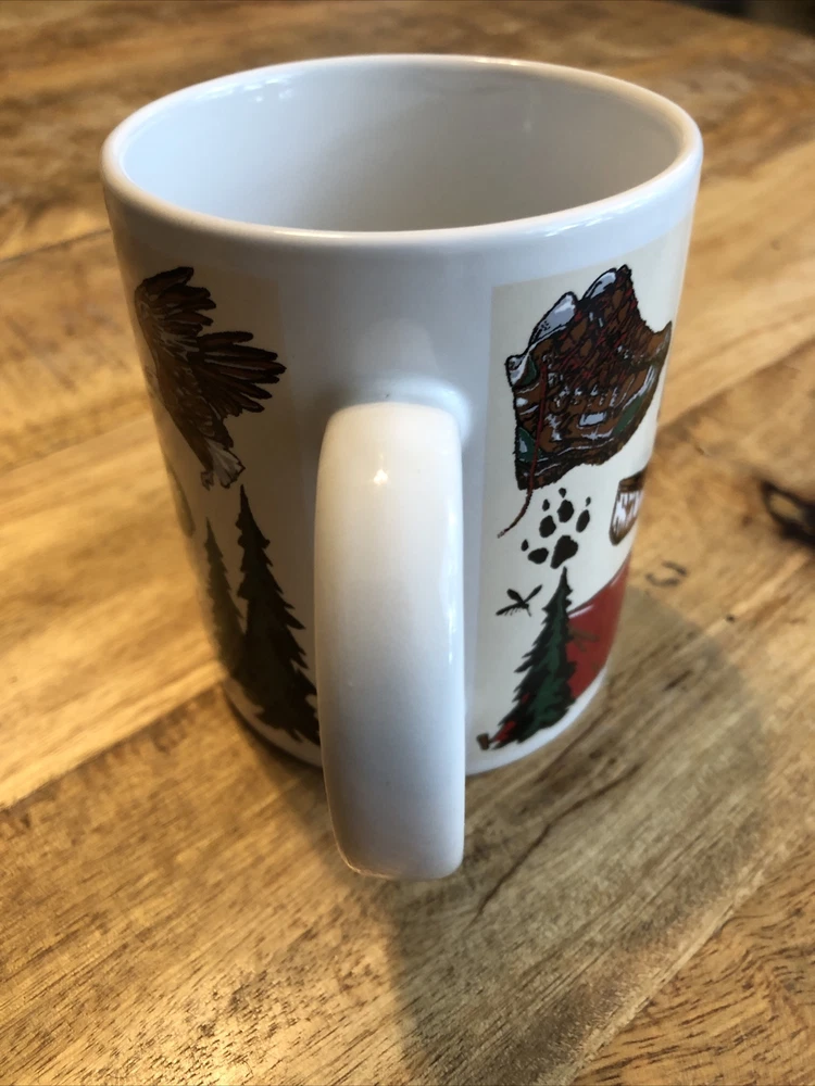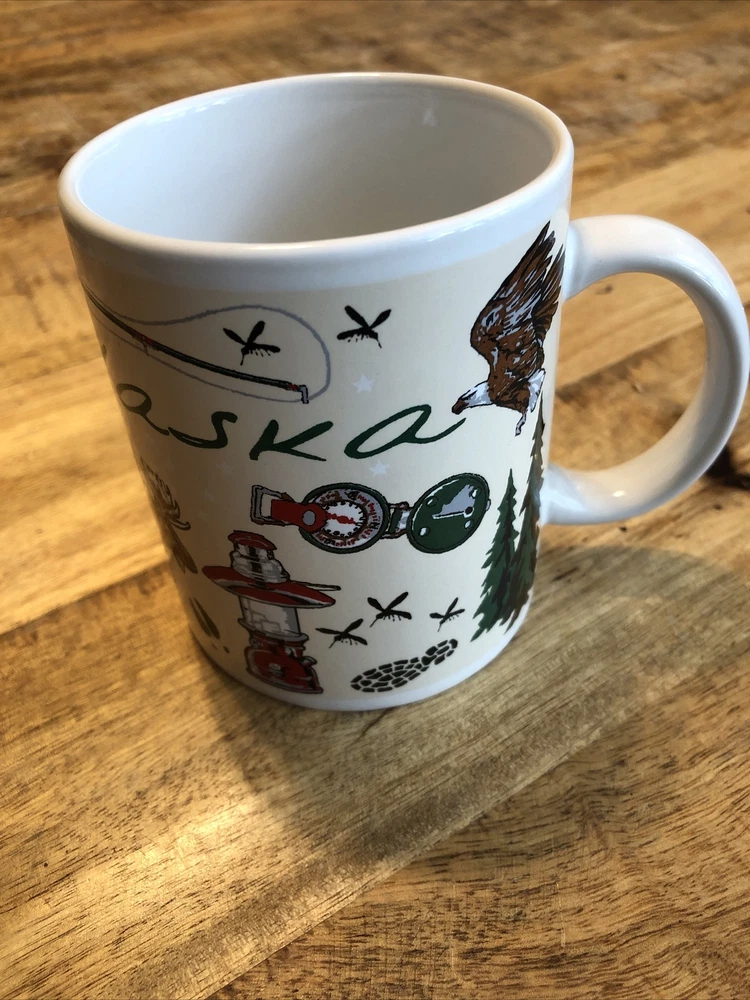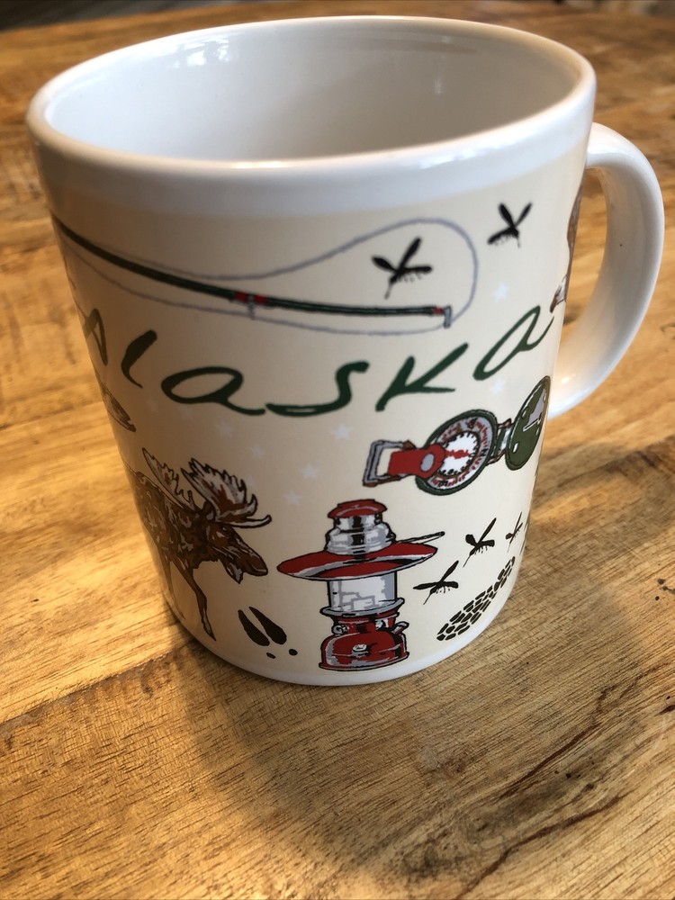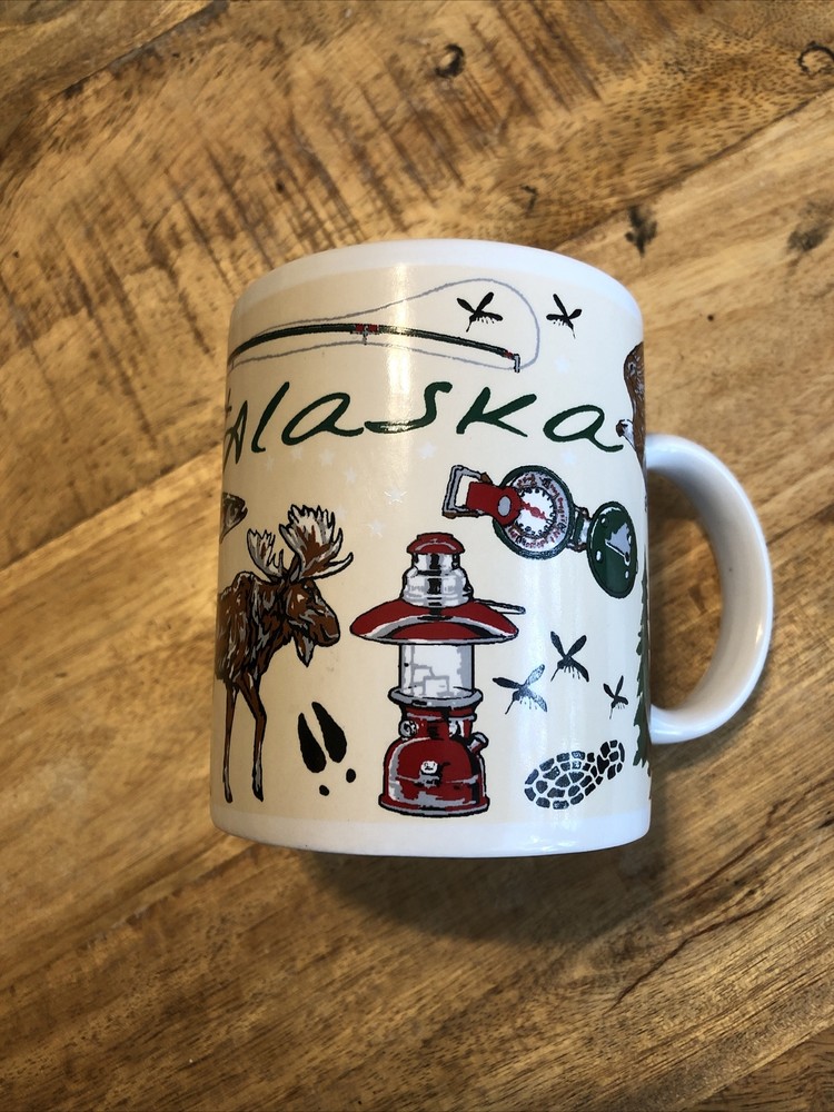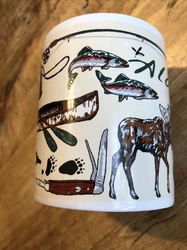 This medium-sized ceramic and porcelain mug features a round shape with a handle, suitable for hot or cold beverages. It has a capacity of 8 oz. and is designed with a multicolor pattern showcasing elements of the outdoors, fishing, wild animals, camping, and topographical themes, representing the Arctic Circle in Alaska. The mug is branded by Artic Circle Enterprises and is ideal for serving coffee, tea, or other hot beverages, making it a collectible piece for those who appreciate souvenir items.