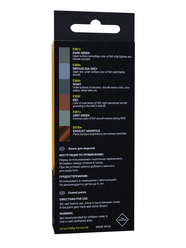 Arcus #E3009 Enamel Paint Set RAF Late WW2 Night Fighters Set 6 colors in set 10ml for Scale Plastic Model Kit Manufacturer: Arcus Colors Condition: New in Box Volume, ml: 6 х 10 ml. (6 x 0.33oz) Material: Enamel Paint Paint Type: Enamel Elevate your scale plastic model projects with the Arcus Enamel Paint Set. This thoughtfully curated set includes six essential colors in convenient 10ml bottles, meticulously designed for enhancing your scale plastic model kits. Experience precision and quality with Arcus enamel paints. Suitable for night fighter and intruder RAF aircraft camouflages (1942-1945) The set consists of 6 paints of 10 ml. Set contains: 387 Dark Green - Upper surface camouflage color of RAF night fighter and intruder aircrafts 380 Medium Sea Grey - Upper and under surface color of RAF night fighter aircraft 360 Night - Under-surfaces of intruders. Aircraft interior color, crew cabins, wheel wells, etc 358 Red - Color of code letters of RAF night-operational aircraft according to the AMO A.664/42 381 Grey Green - Common color of RAF aircraft interiors during WW2 078 Exhaust Manifold - Flame dampers (suppressors) and exhaust manifolds Suggested models: Bristol Beaufighter de Havilland DH.98 Mosquito Douglas A-20 Havoc Fairey Fulmar Hawker Hurricane etc. Features: Expertly formulated Arcus enamel paints tailored for scale plastic model enthusiasts. Specially curated set of 6 colors in practical 10ml bottles, perfect for intricate work and comprehensive coverage. Consistent color quality and smooth application ensure professional-grade results. Versatile paints suitable for various techniques and skill levels, catering to modelers of all expertise. Benefits: Achieve superior results with meticulously crafted colors. Efficient 10ml bottles prevent wastage and are easy to store. Versatile paints suitable for brush and airbrush techniques. Durable paint adheres effectively to plastic surfaces, ensuring long-lasting outcomes. Elevate your scale modeling skills and create captivating projects. The Arcus Enamel Paint Set is an essential tool for enhancing scale plastic model kits. Whether you're a novice or an experienced modeler, these Arcus enamel paints empower you to achieve stunning outcomes. Elevate your skills, infuse authenticity, and craft captivating scale models using this exceptional paint set.