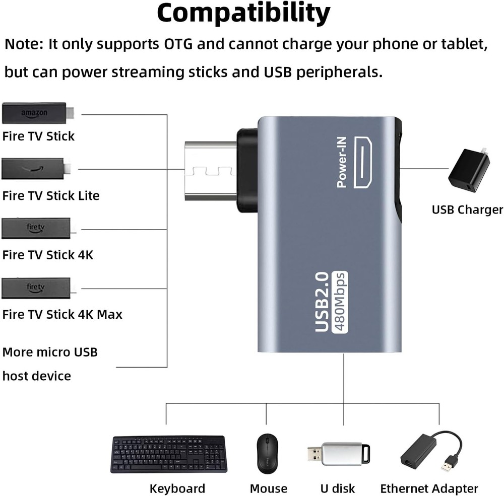 AreMe 2 Pack OTG Cable Adapter for Fire TV Stick 4K, 90 Degree Left and Grey Product Details Package Dimensions: 4.57 x 2.87 x 0.47 inches Item Weight: 0.317 ounces Manufacturer: AreMe Country of Origin: China Compatible Devices: Fire TV Stick, Fire TV Stick 4K, Fire TV Stick 4K Max, Fire TV Stick Lite, Chromecast, other streaming sticks and more host devices with micro USB Fire TV Stick, Fire TV Stick 4K, Fire TV Stick 4K Max, Fire TV Stick Lite, Chromecast, other streaming sticks and more host devices with micro USBFire TV Stick, Fire TV Stick 4K, Fire TV Stick 4K Max, Fire TV Stick Lite, Chromecast, other streaming sticks and more host devices with micro USB See more Specific Uses For Product: TV Connector Type: Micro USB Color: Grey Brand: AreMe 【Compatibility】The micro USB OTG adapter is designed for Fire TV Stick, Fire TV Stick 4K, Fire TV Stick 4K Max, Fire TV Stick Lite, Chromecast, other streaming sticks and more host devices with micro USB. 【Expansion Capability】Use this micro USB OTG adapter to add keyboard, mouse, U disk, USB flash drive, USB card reader, USB ethernet adapter and other USB peripherals to your streaming sticks or micro USB host device. 【Easy to Use】This adapter does not require additional drivers and software. Just connect the adapter to your streaming sticks or micro USB host device, and connect the USB power cable, then it works. 【Please Note】When you use it on a Micro USB phone or tablet, it only supports OTG and cannot charge your phone or tablet, but can power streaming sticks and USB peripherals. 【What you'll get】Micro USB OTG Adapter *2, Any questions, please feel free to contact us, we will reply you within 24 hours.