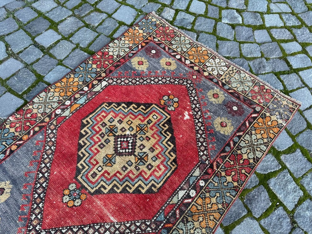 Material: 100% Cotton, 100% Wool Culture: Turkey Production Technique: Knotted Original/Licensed Reproduction: Original Item Length: 73 in Shape: Rectangle Weave: Hand-Knotted Pattern: Geometric Pile Type: Normal Item Width: 52 in Item Thickness: approximately 0.2" (0.5 cm) Theme: 1960s & 1970s Brand: Handmade Era: Mid 20th Century (1941-1969) Department: Boys, Girls, Teens, Adult Type: Area Rug Size: 4 x 6 ft Pile Height: 0.5 in Room: Bedroom, Dining Room, Home Office/Study, Kitchen, Living Room, Nursery Country of Origin: Turkey Color: Red Regional Design: Turkish Style: Bohemian Handmade: Yes Features: Hand-Knotted Time Period Manufactured: 1960-1969