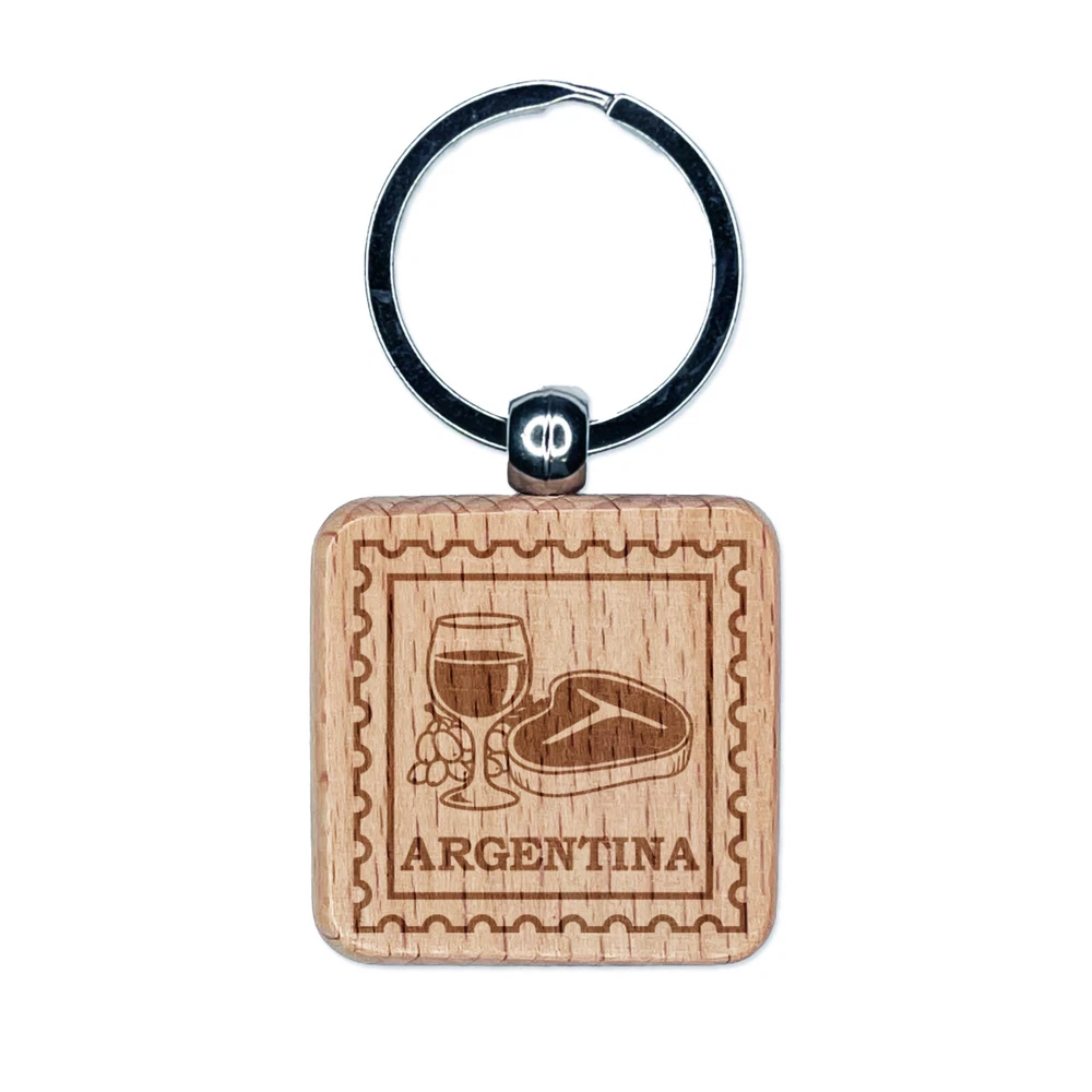 Argentina Travel Wine Glass Steak Engraved Wood Square Keychain Tag Charm