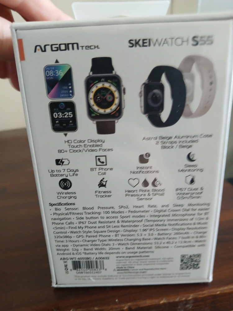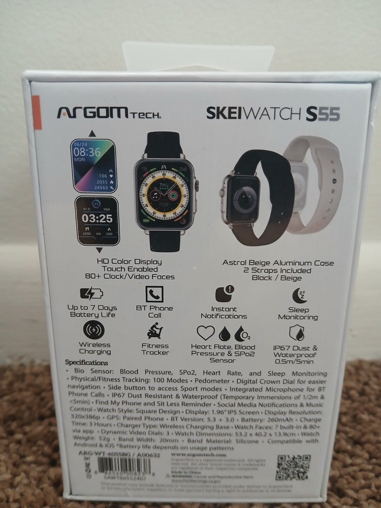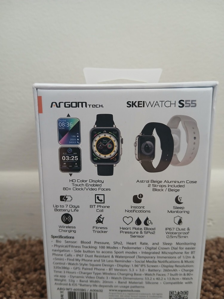 The Argomtech SkeiWatch S55 Smart Watch is a 20mm Smart Bracelet with Apple Watch OS, suitable for use with iOS and Android devices. It is unlocked and made in China.