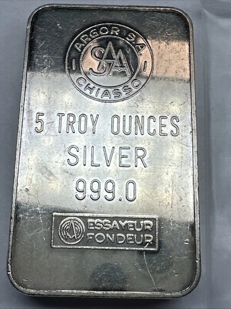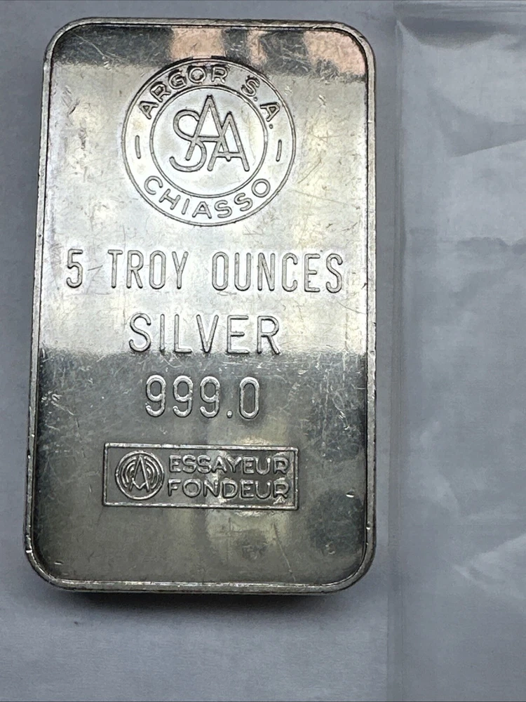This is a vintage Argor Chiasso 5 oz silver bar made of 0.999 fine silver. It features the "Essayer Fondeur" mark, indicating the bar's quality and authenticity. Produced in Switzerland by Argor S.A. Chiasso, this bar contains a total of 5 oz of precious metal content.