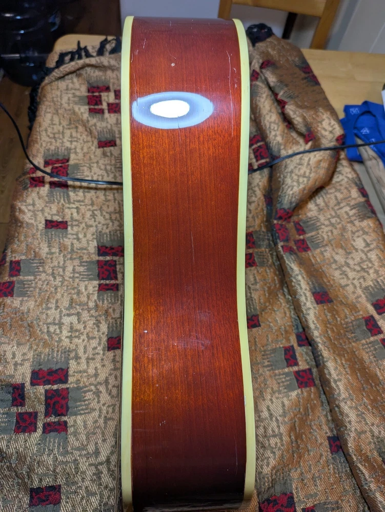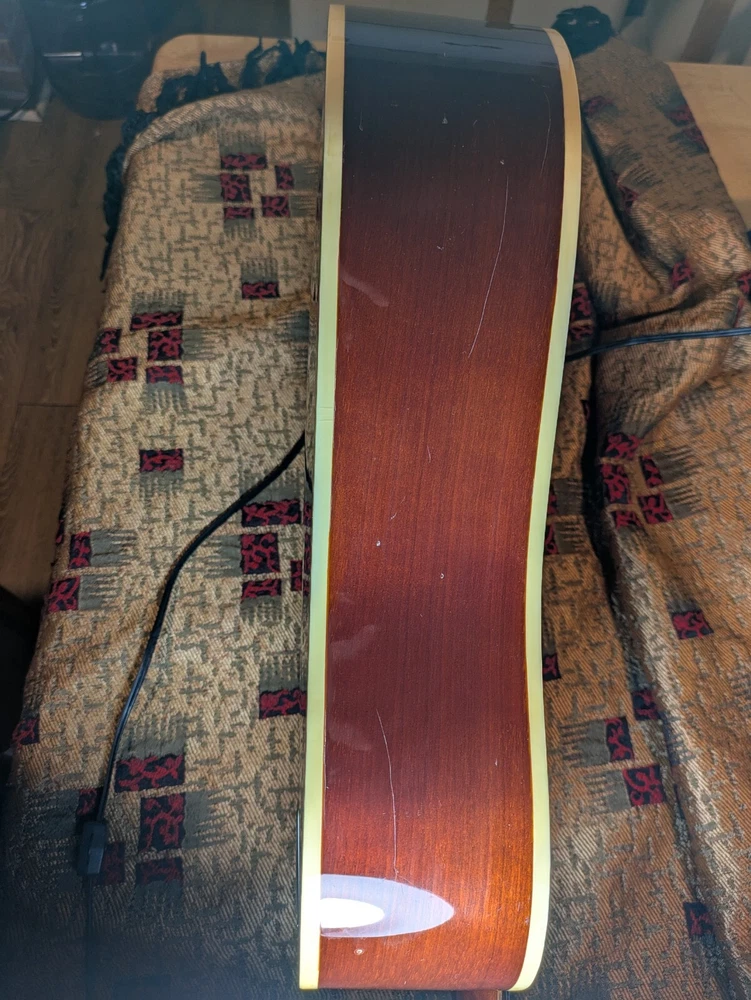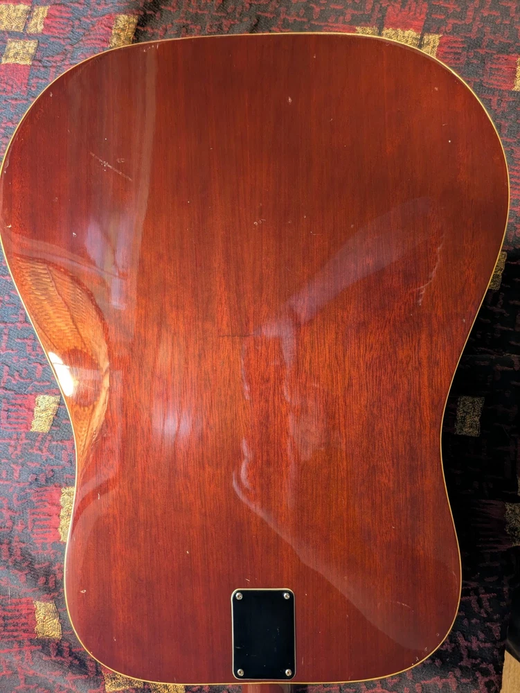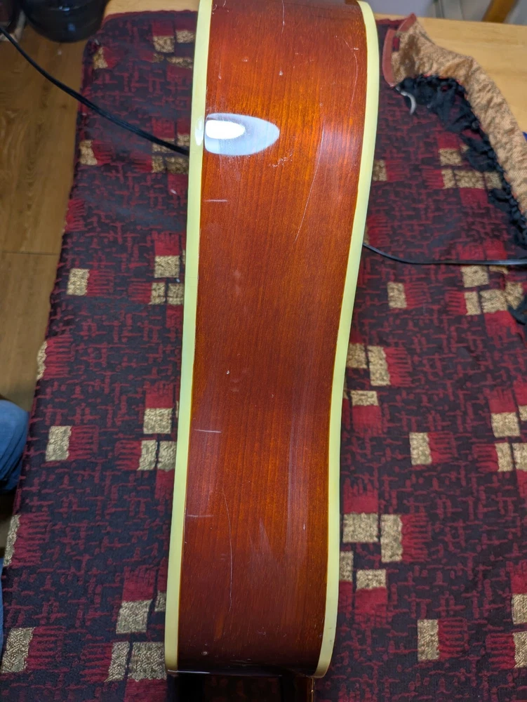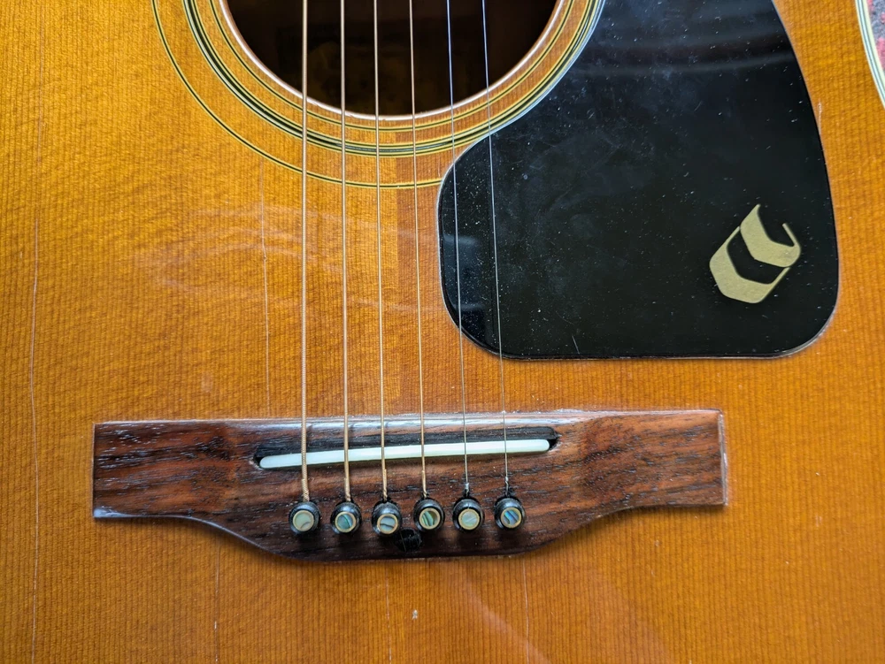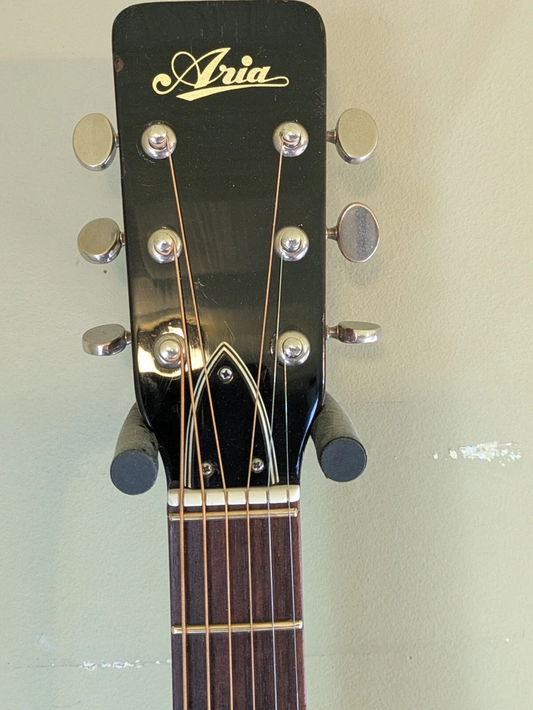 Great sounding guitar, loud with clarity, very good bass for a laminate top. An early model with a cedar top (from what it looks like and from what I read on the net). Also has V bracing instead of the typical X bracing, which I have only seen before on another early Aria orchestra model. Added Jescar gold EVO frets (harder than nichel silver) leveled crowned and polished. Slightly tapered the braces through the sound hole for more bass response. Slim neck, plays like an electric. Added a bone saddle and nut, ebony pins and filled the adjustable saddle slot with an ebony inlay. The original adjustable saddle comes with it. Added an Oak shim to increase saddle height and adjust action. Filled finish cracks with CA glue and wet sanded at least a third of the finish off to improve sound and remove most of the scratches. Looks great, plays great.