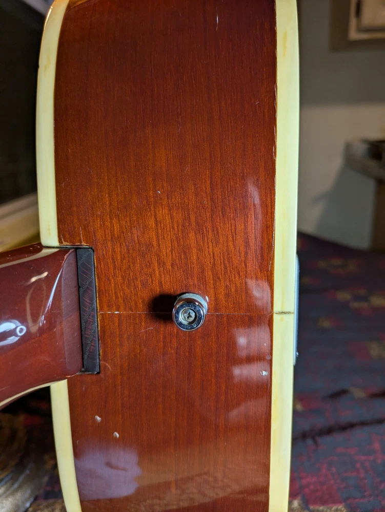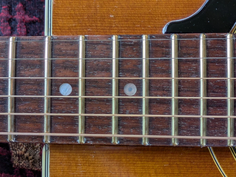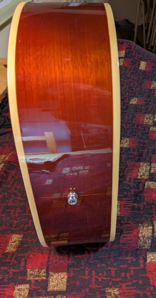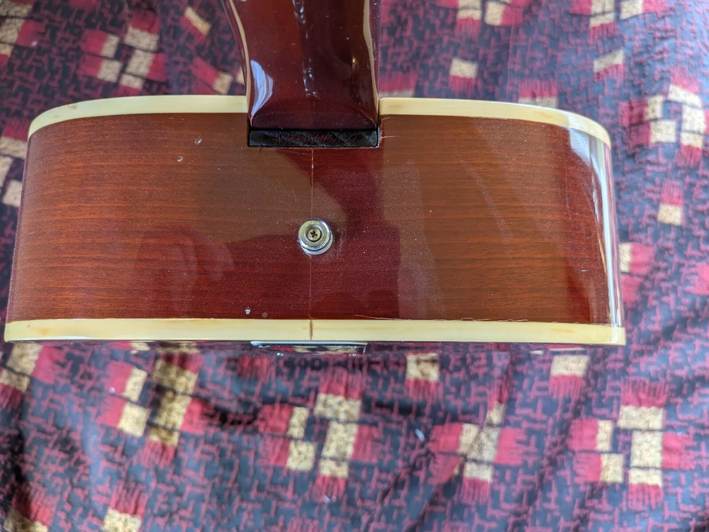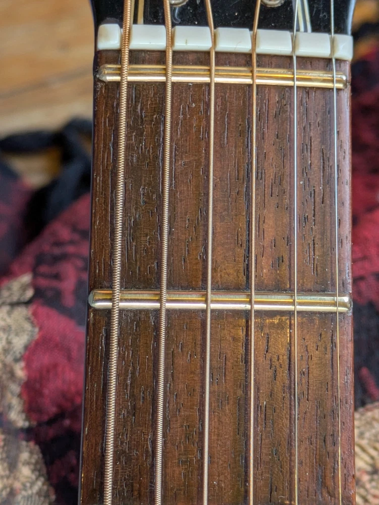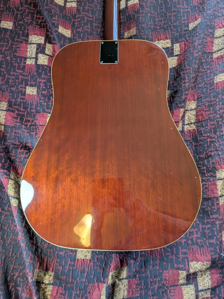 Great sounding guitar, loud with clarity, very good bass for a laminate top. An early model with a cedar top (from what it looks like and from what I read on the net). Also has V bracing instead of the typical X bracing, which I have only seen before on another early Aria orchestra model. Added Jescar gold EVO frets (harder than nichel silver) leveled crowned and polished. Slightly tapered the braces through the sound hole for more bass response. Slim neck, plays like an electric. Added a bone saddle and nut, ebony pins and filled the adjustable saddle slot with an ebony inlay. The original adjustable saddle comes with it. Added an Oak shim to increase saddle height and adjust action. Filled finish cracks with CA glue and wet sanded at least a third of the finish off to improve sound and remove most of the scratches. Looks great, plays great.