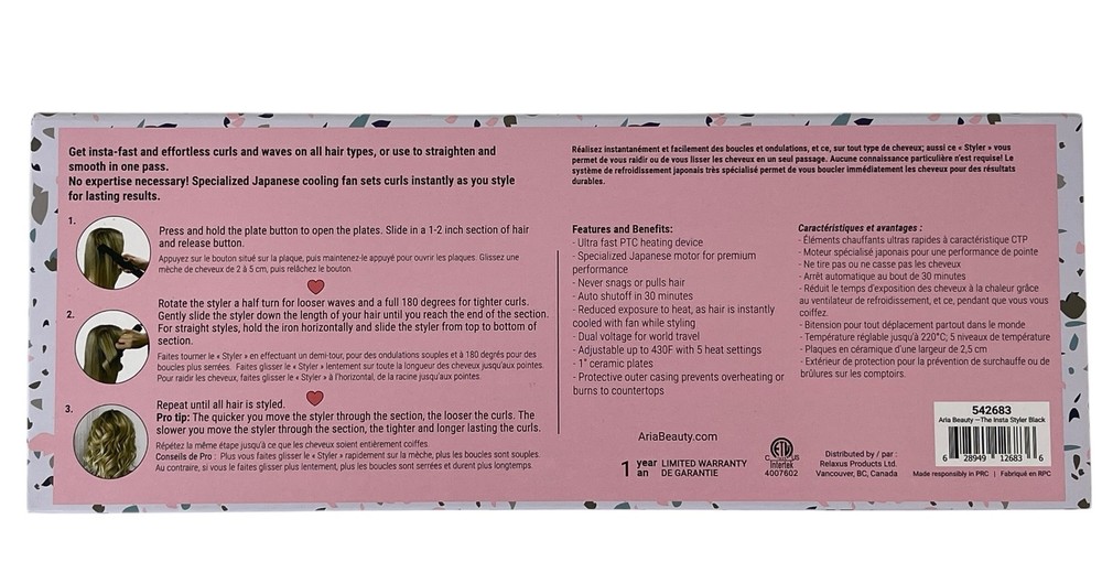 Country/Region of Manufacture: China UPC: 628949126836 gtin13: 628949126836 Model: The Insta Styler Number of Temperature Settings: 5 Heating Plate Material: Ceramic Barrel Size: 1 in Type: Curling Iron Features: Adjustable Heat Settings, Auto Shut-Off, Cool Tip Power Source: Electric Brand: Aria Beauty Color: Black Material: Ceramic, Plastic Hair Type: All Hair Types Seller Notes: “New / Never Used. Open Box” MPN: 542683 Maximum Temperature: 430 °F