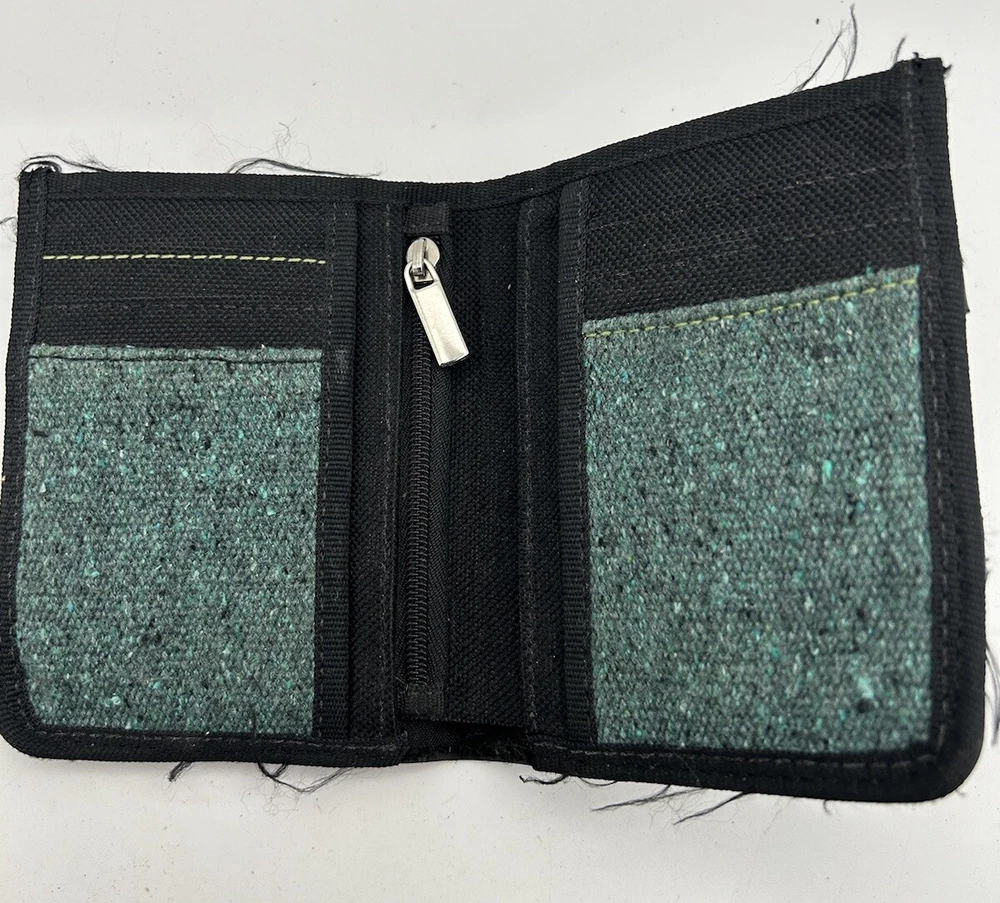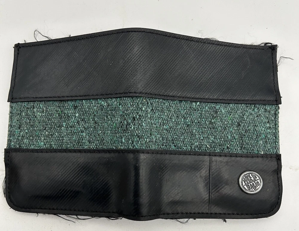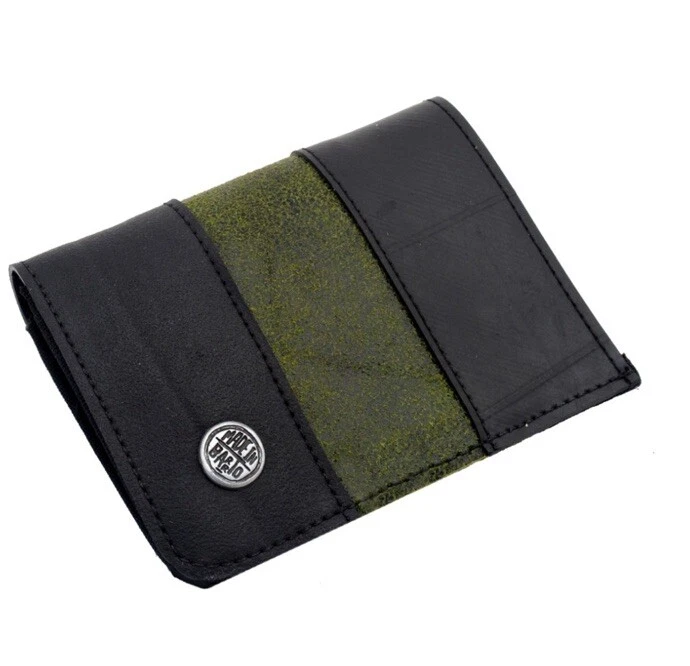This Aria Handmade wallet is a stylish and functional accessory for any woman. The wallet is made from distressed leather and recycled tire tube, making it an eco-friendly choice. The wallet features a snap closure and an outside zipper pocket, providing ample storage space. The tri-fold design is perfect for keeping cards and cash organized, while the green and black color scheme adds a touch of sophistication. The wallet is handmade in Colombia and has a unique bi-fold style, making it a must-have for any fashion-conscious woman.