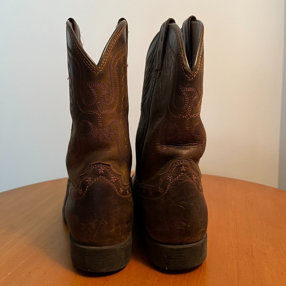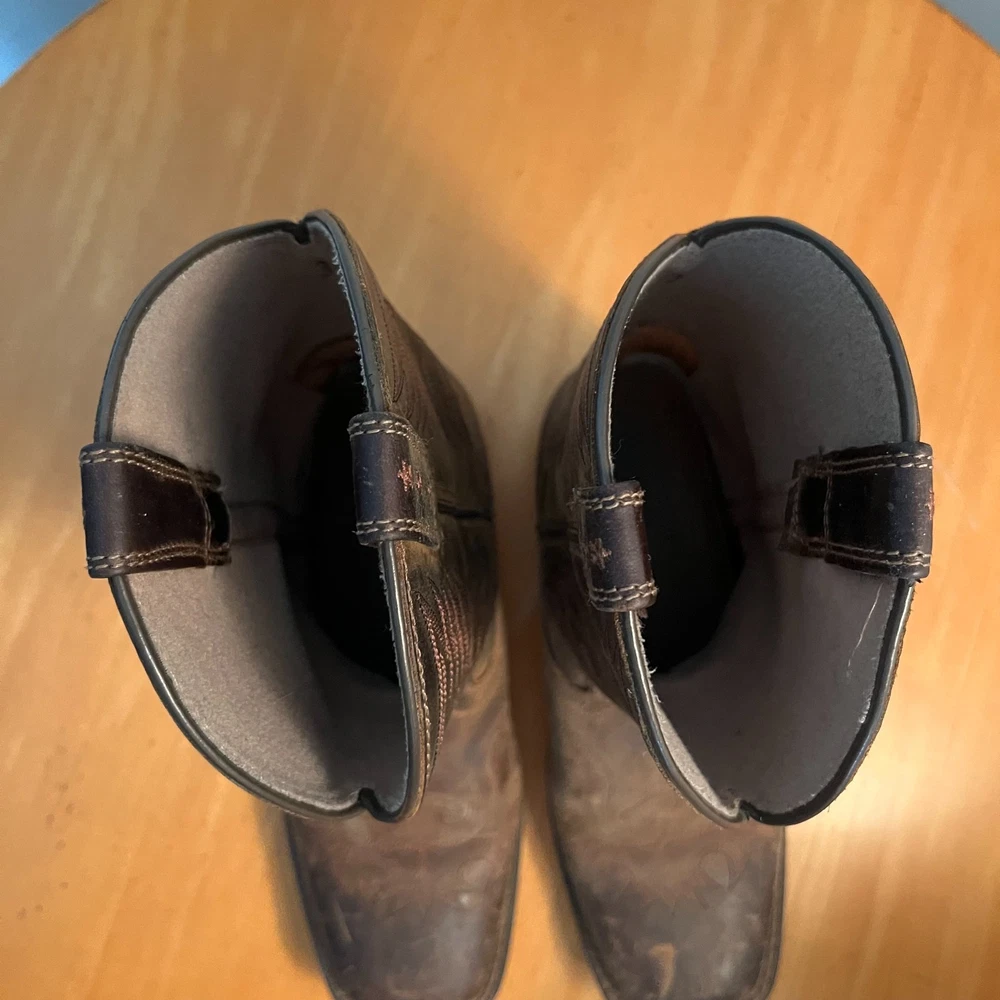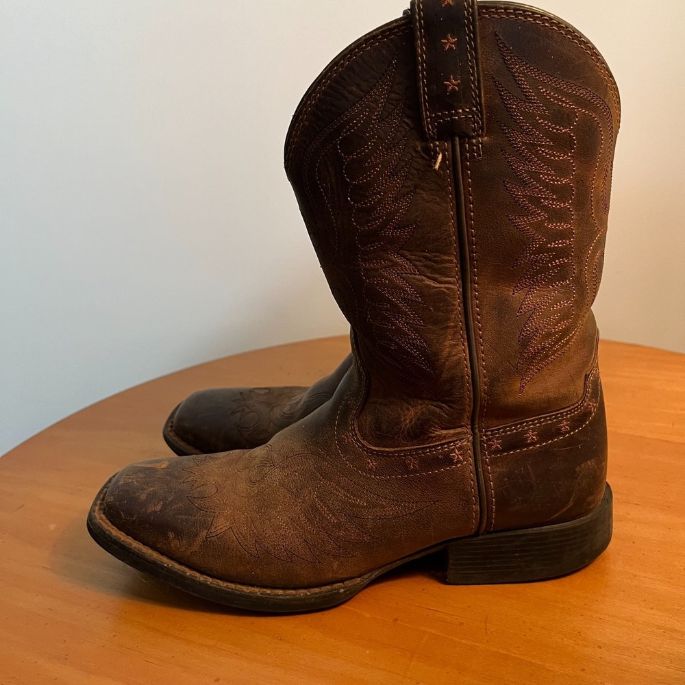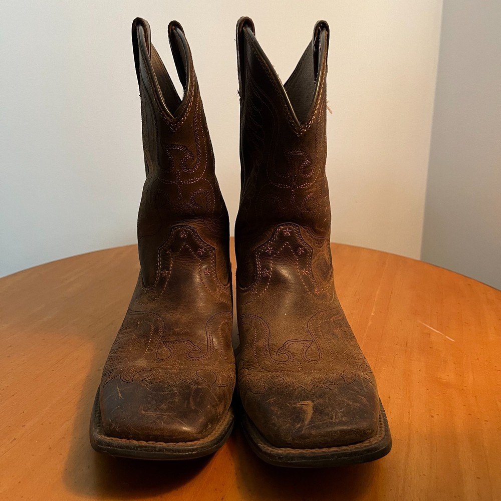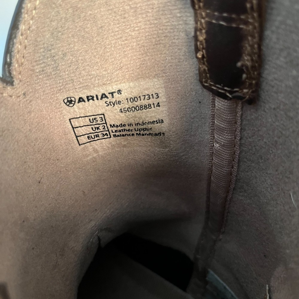 Season:Spring, Fall, Summer, WinterShoe Shaft Style:Mid-CalfToe Shape:Square ToeUK Shoe Size:2Color:BrownSeller Notes:“These are in very good shape. Great for farm work! Much life left in them.”Closure:Pull OnCharacter:BootsShoe Width:StandardType:BootBrand:AriatCountry/Region of Manufacture:IndonesiaVintage:NoPattern:SolidUS Shoe Size:3Theme:Western, CowboyProduct Line:AriatFabric Type:LeatherUpper Material:LeatherEU Shoe Size:34Occasion:CasualFeatures:ComfortCustomized:NoStyle:WesternDepartment:BoysPerformance/Activity:Fishing, Hunting, Riding, Walking