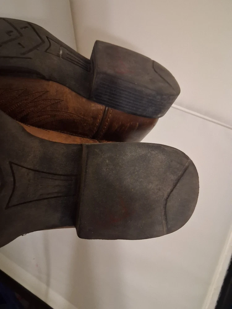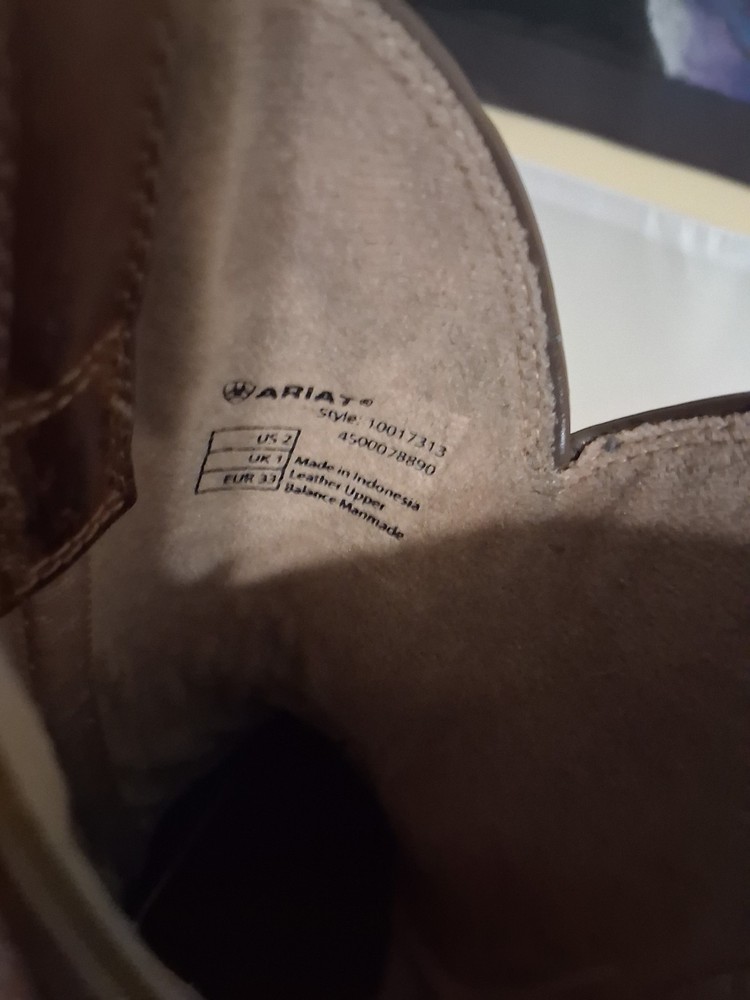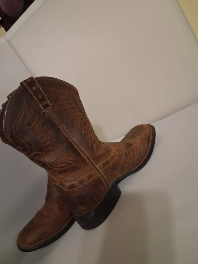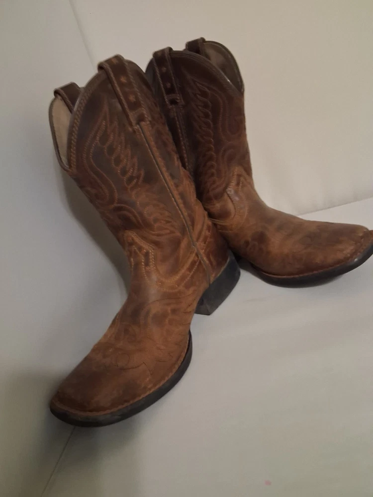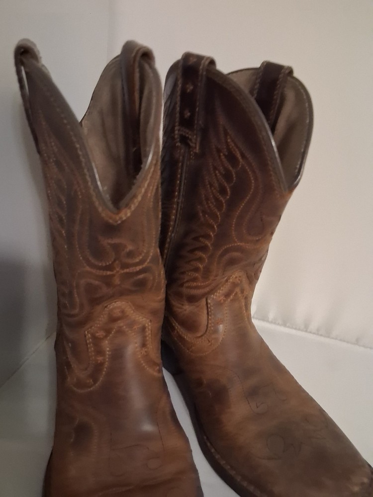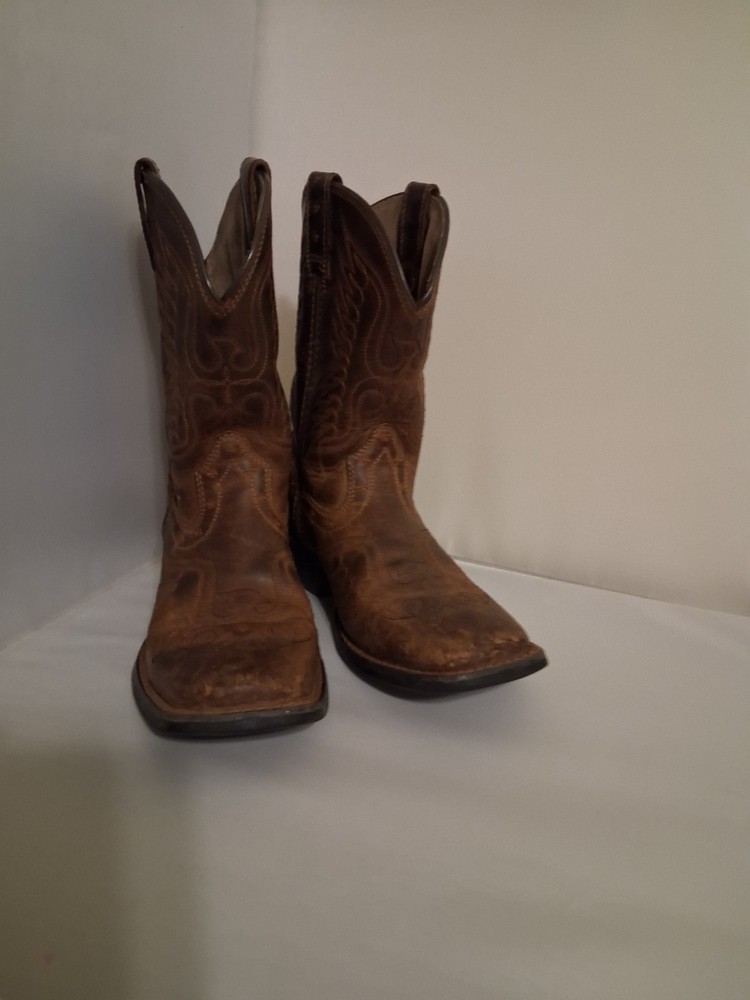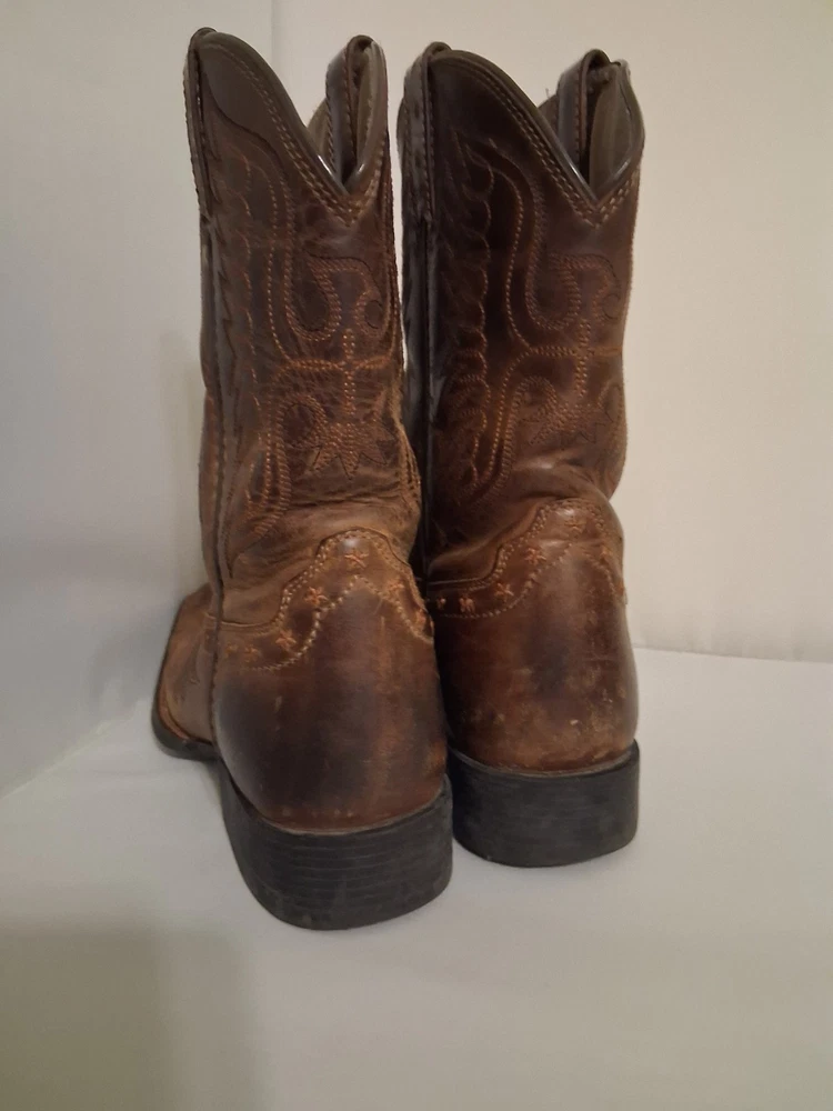 These Ariat Brown Leather Cowboy Boots in youth size 2 feature a square toe design and a comfortable low heel for everyday wear. Made with blended fabric lining and a rubber outsole, these boots have a pull-on closure and standard shoe width. The stylish Western design with boot pulls accents and a mid-calf shaft make them suitable for casual occasions in the summer, fall, and spring seasons. With a durable leather upper and foam insole, these cowboy boots are perfect for young adventurers looking to add a touch of Western flair to their wardrobe.