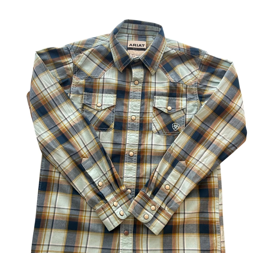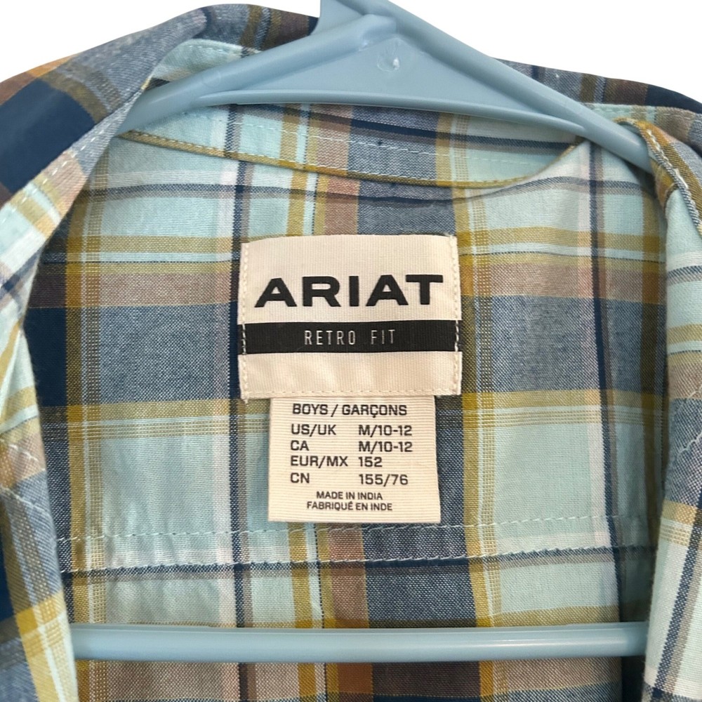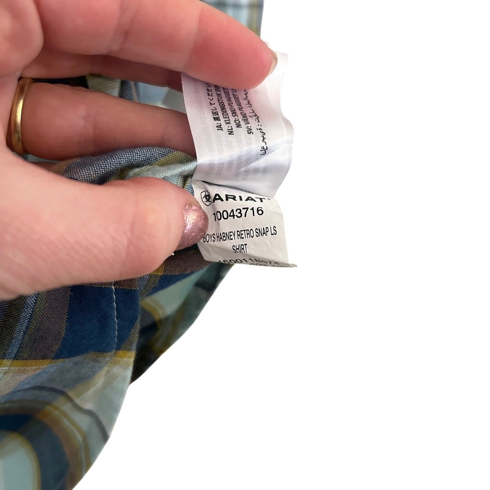 Ariat Habney Retro Snap long sleeve shirt features a classic plaid pattern in shades of blue, tan, and yellow. This Western-style top is designed with a retro fit, pointed yokes, and dual chest pockets with snap closures. The pearlized snap buttons and embroidered logo detail on the pocket add a touch of authentic cowboy style to this durable cotton-blend garment. This item is in good used condition. Keywords: Western, Cowboy, Rodeo, Plaid, Retro, Country, Southwestern, Pearl Snap, Workwear, Ranch, Casual, Habney, Rugged Brand: Ariat Product Type: Button-Up Shirt Style: Western / Retro Fit Sleeve Length: Long Sleeve Closure: Snap Button Pattern: Plaid Color: Blue, Tan, Yellow Material: Cotton Blend Features: Chest Pockets, Pointed Yoke Model: Habney 10043716 Measurements: • Chest (Pit-to-Pit): 17" (34" doubled) All items come from a smoke free, golden retriever dog friendly home. All of items unless NWT or Dry Clean Only are washed with Tide. We try our best to disclose any flaws with items, if we miss something please reach out and let us know.
