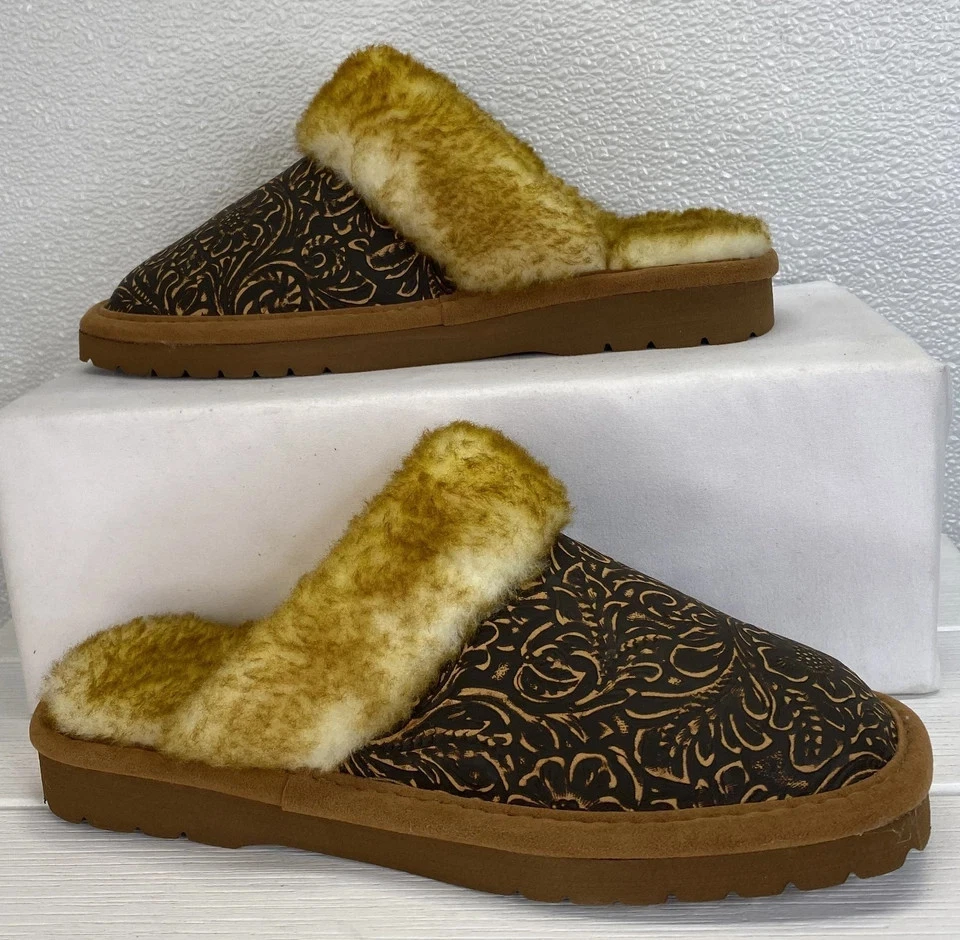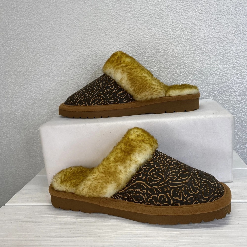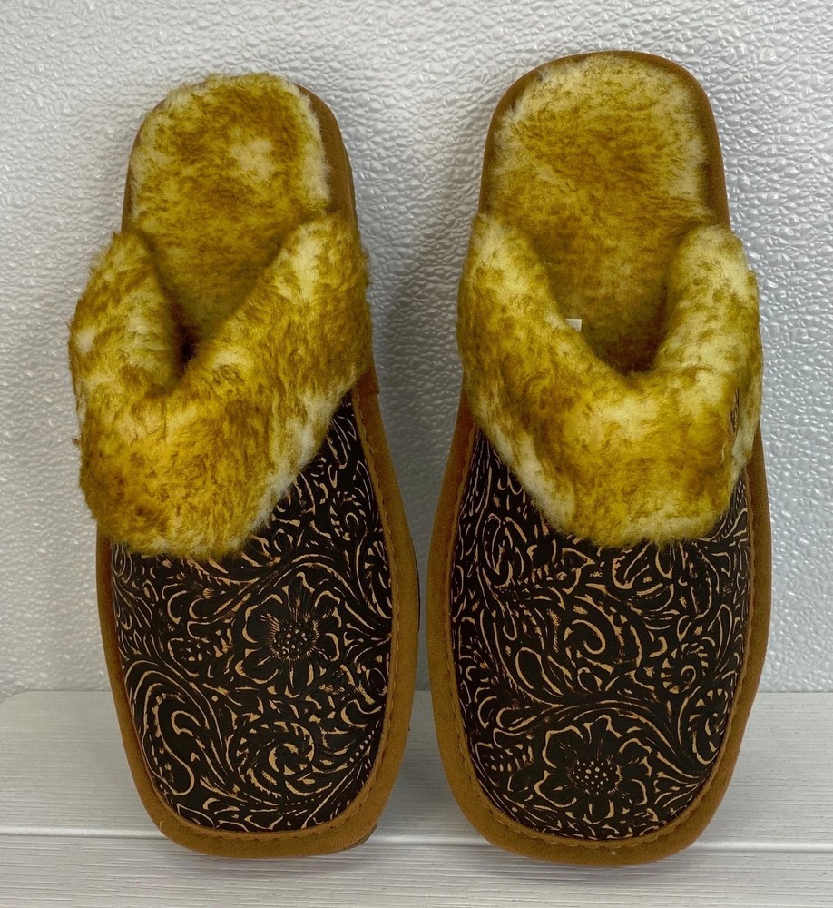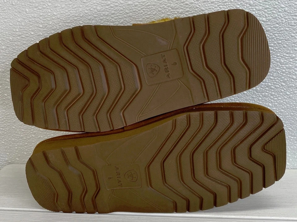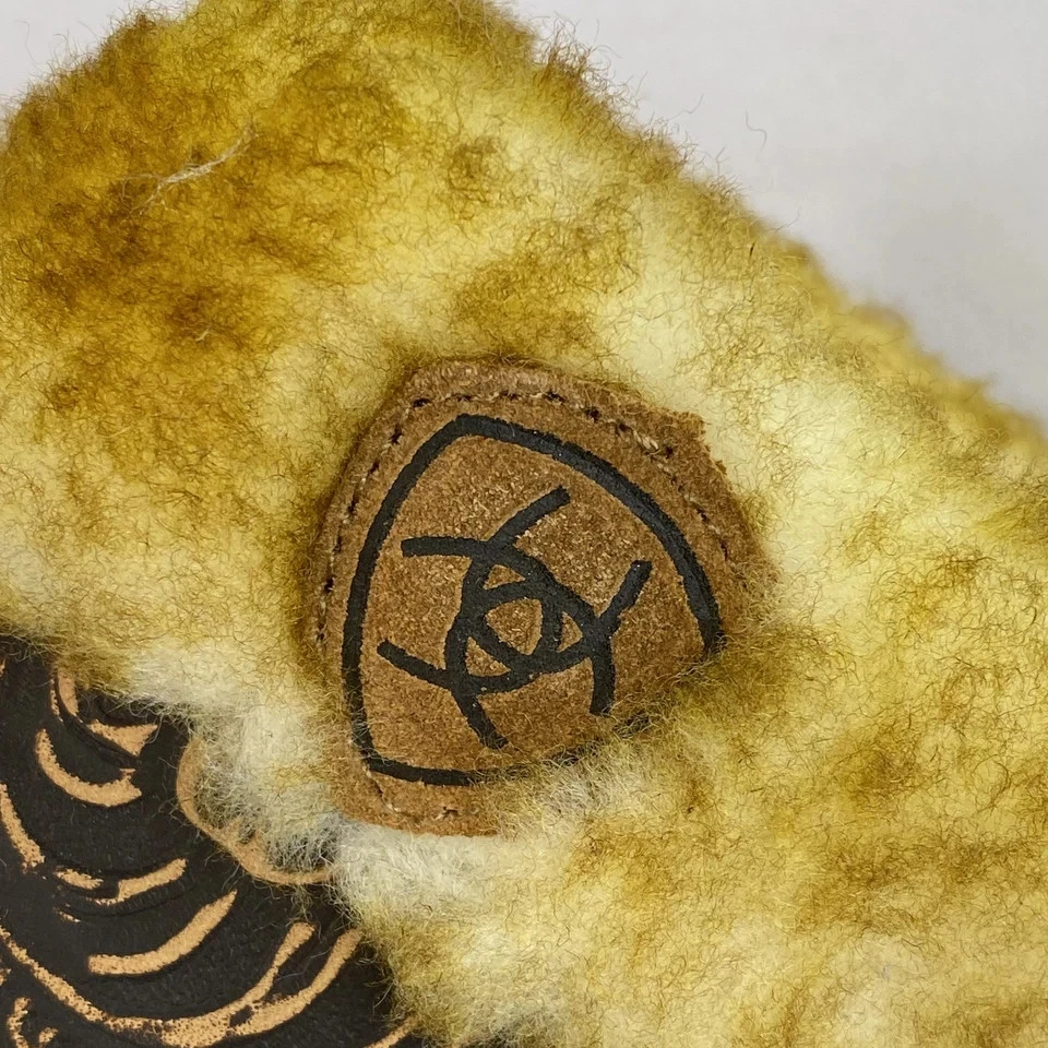 The Ariat Jackie Embossed Slippers in women's size 6 are a stylish and comfortable option for casual wear during the winter and fall seasons. The slip-on design, square toe shape, and suede brown color make them a versatile choice for everyday use. The faux fur lining and EVA outsole provide warmth and support, while the embroidered logo accents add a touch of detail. These slippers from the trusted brand Ariat are perfect for adding a trendy twist to your loungewear collection.