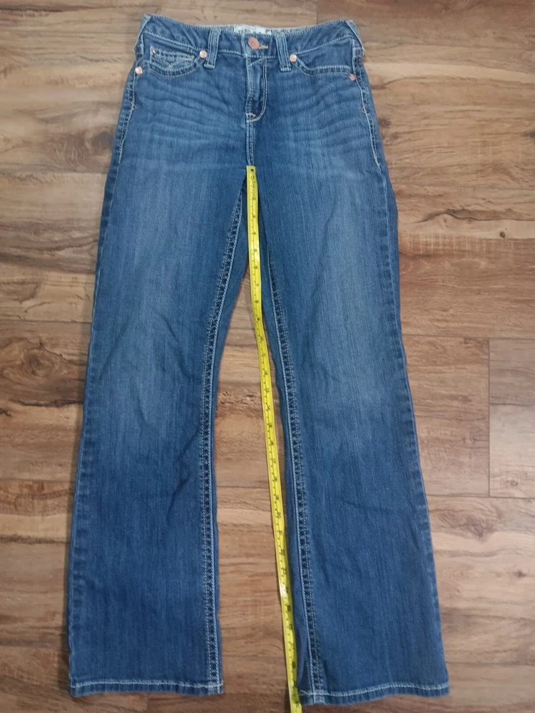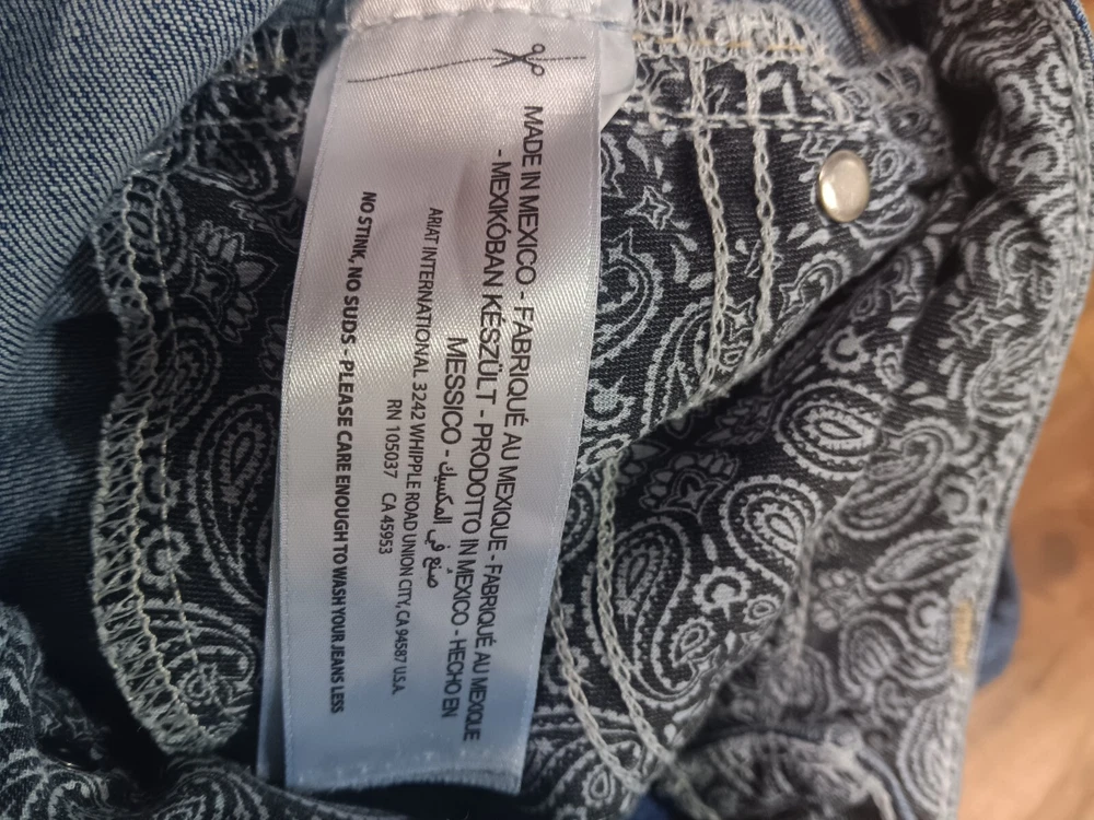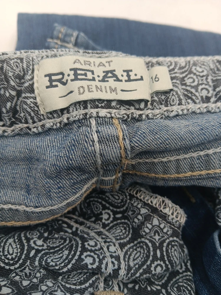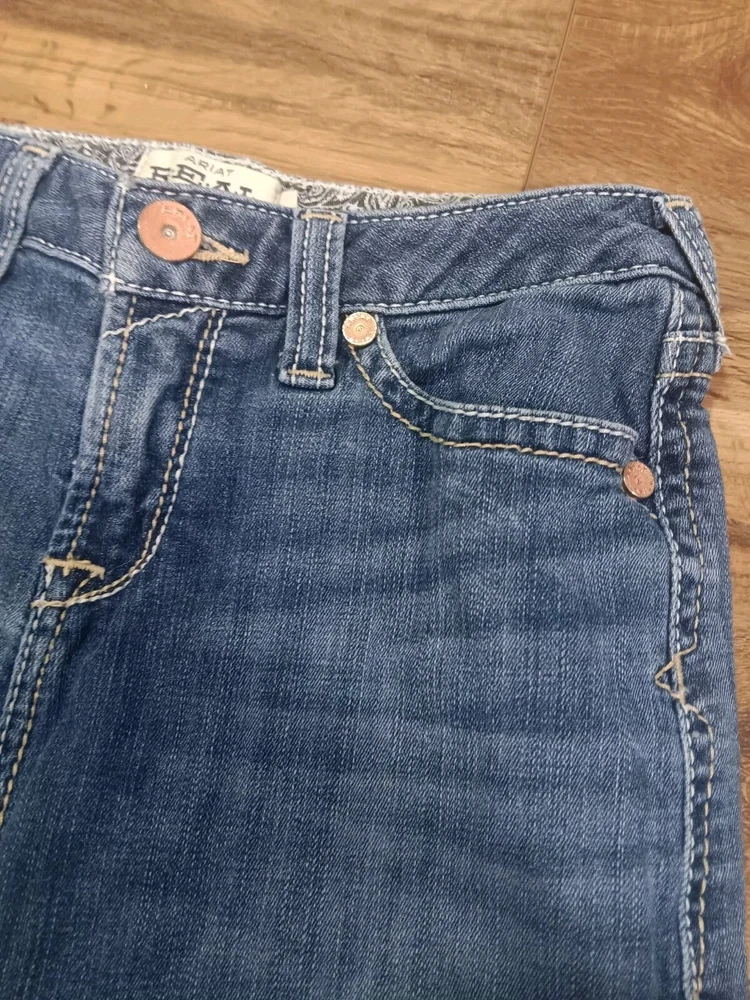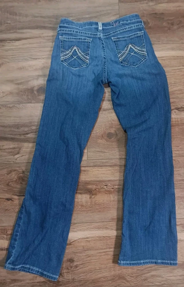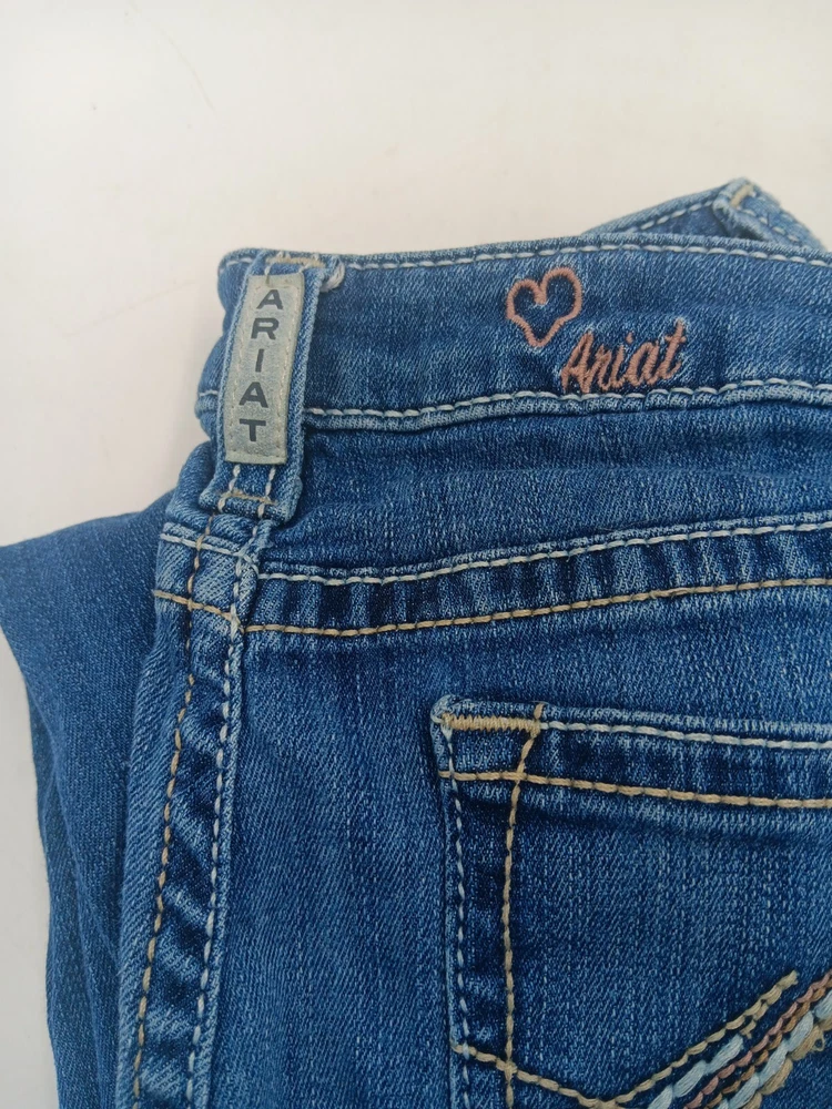 These Ariat jeans are a must-have for any stylish girl! Made with a blend of polyester, spandex, and cotton, they are comfortable and stretchy, and feature pockets for added convenience. The heavy stitch construction ensures durability, while the medium wash denim gives them a classic, timeless look. Perfect for any occasion, whether it's a party, casual outing, or formal event, these jeans have a versatile style that will complement any outfit. With a mid-rise fit and bootcut design, they are flattering and easy to wear. Whether you're walking, riding, or playing, these jeans are perfect for any activity. See pictures for best description. Inventory Sku: K