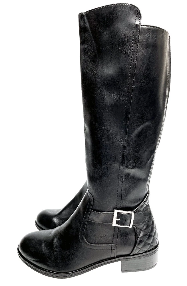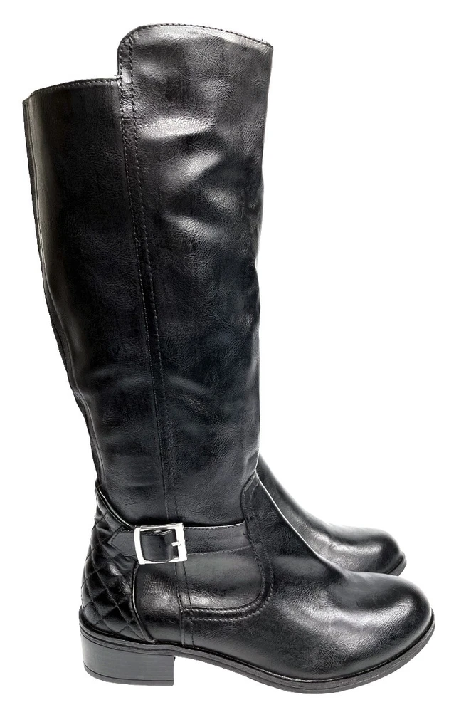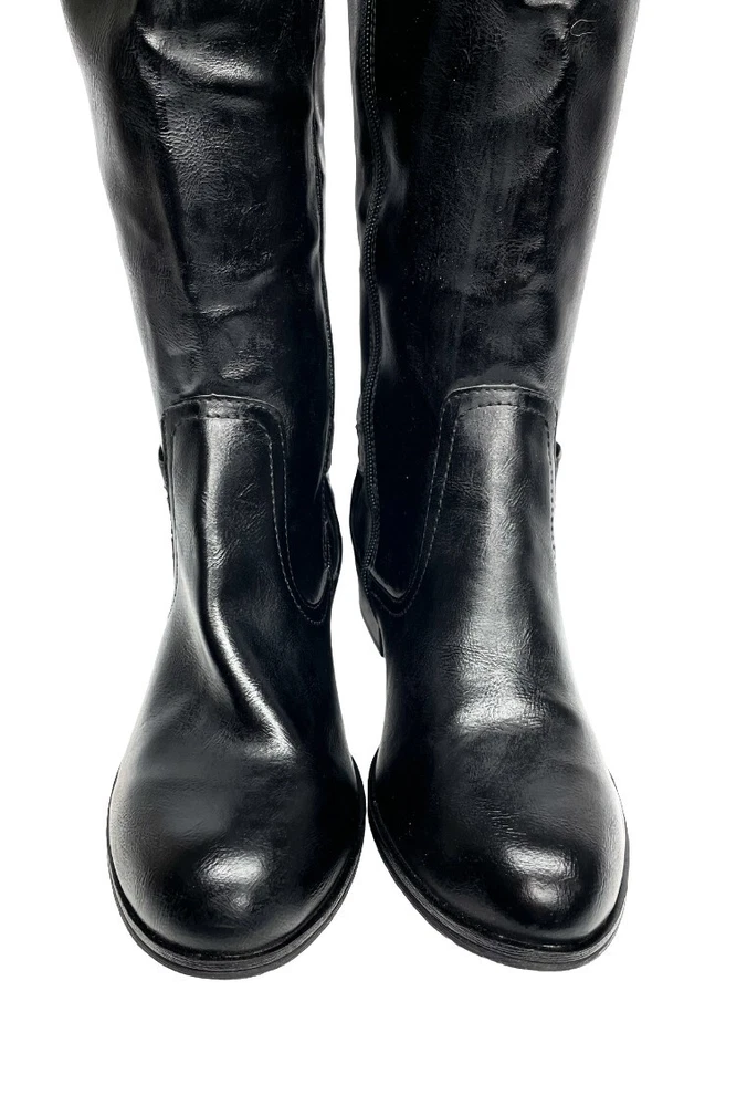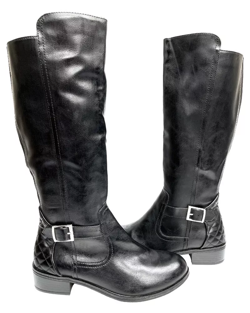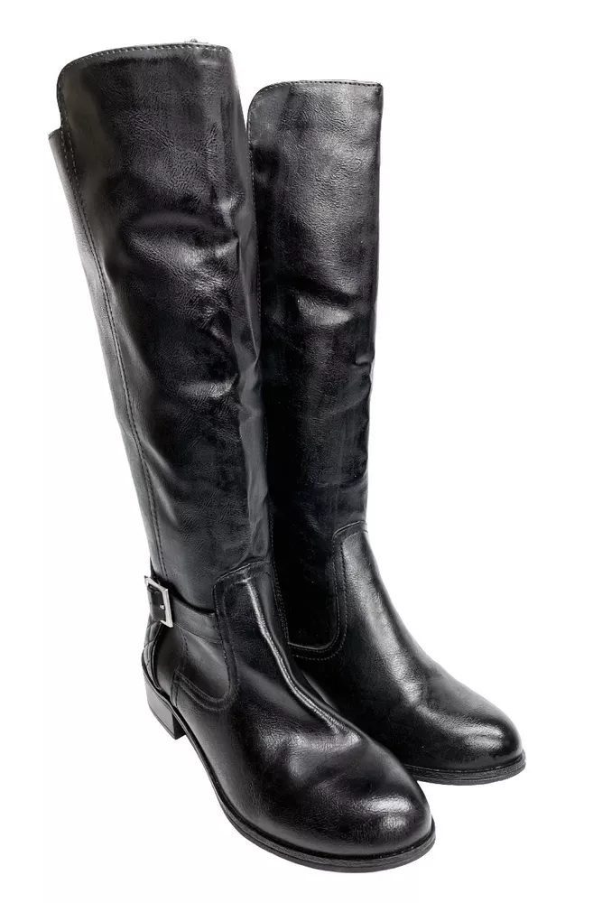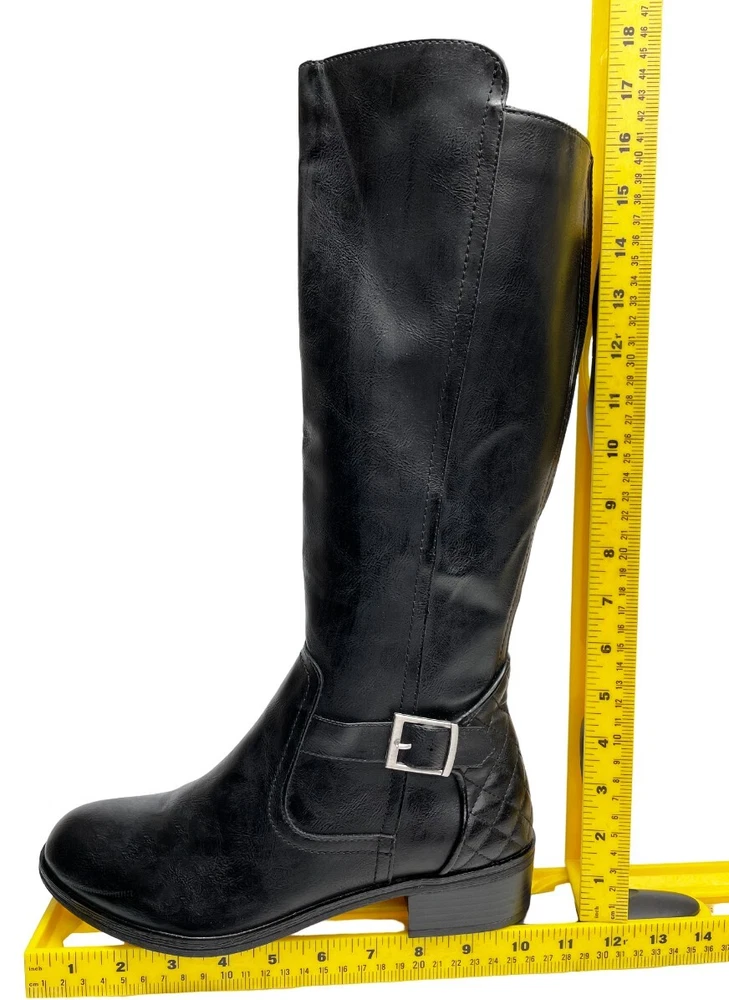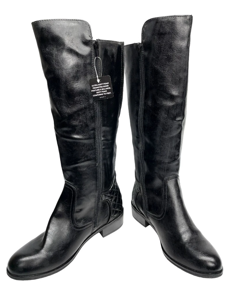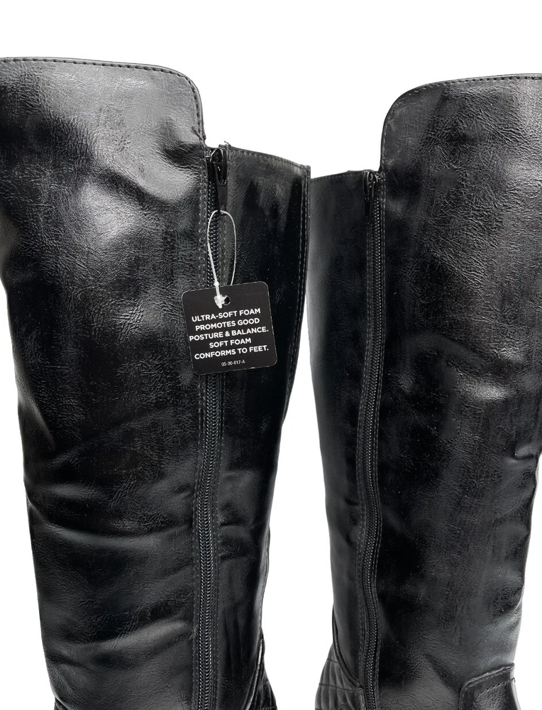 Brand: Arizona Jean Co Type: Boot Character: Boots Pattern: Solid Toe Shape: Round Toe Color: Black Closure: Zip Calf Width: Wide Heel Height: Low (1-1.9 in) Occasion: Business, Casual, Party/Cocktail, Travel, Workwear Upper Material: Faux Leather US Shoe Size: 6 Heel Style: Block Shoe Width: M Features: Comfort, Lightweight, Memory Foam Theme: American, Equestrian, Modern Style: Riding Boot Shoe Shaft Style: Knee High Model: Denver Accents: Buckle Department: Women