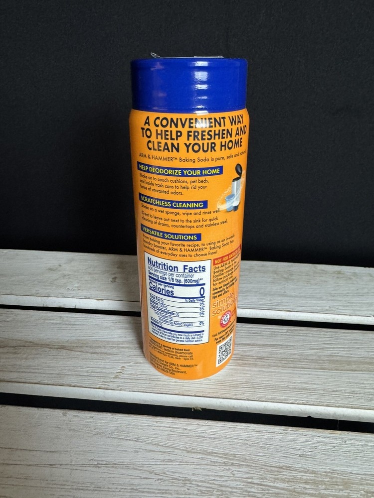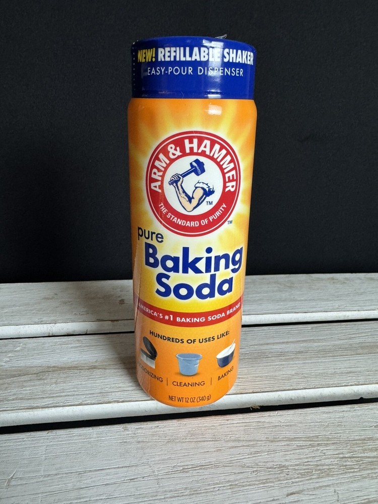This product is Arm & Hammer Pure Baking Soda in a 12 oz. refillable shaker. It is a household cleaning product in powder form, made in the United States. Perfect for various cleaning tasks around the home, this baking soda can be conveniently dispensed using the refillable shaker.