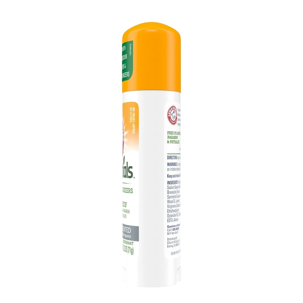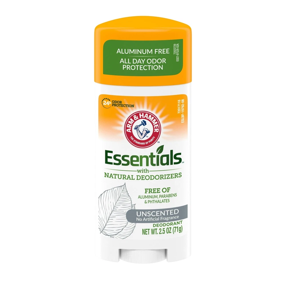 Product Description Arm & Hammer Essentials, Natural, Solid, Antiperspirant Deodorant, Unscented 2.5 Ounce (Pack Of 1) If you lead an active lifestyle, you need a deodorant that can keep up. Fight odor with the combined power of ARM & HAMMER Baking Soda and natural plant extracts. No matter what your day brings, the refreshing scents and light plant-based fragrances will keep you smelling cool. Plus, you'll have total coverage where you need it to feel confident anytime, anywhere. No aluminum, phthalates, parabens or colors means you can feel good using this deodorant all the time. And with 24 hour protection, you know you don’t have to worry about odors so you can go about your day. PURE INGREDIENTS: Made from ARM & HAMMER Baking Soda, a natural deodorizer, with no artificial 24 HOUR PROTECTION: With 24-hour odor protection, you are covered all day long. MOISTURIZE: Essential and natural ingredients help to provide odor control as well as moisturization for your under arms. FREE OF: Aluminum, parabens, phthalates, colors, artificial fragrances, and animal-derived ingredients Without parabens, With natural Deodorizers, Fight against the evil smell No, of aluminium Ingredients Propylene Glycol (Vegetable Derived), Water, Sodium Stearate, Sodium Bicarbonate, Ethylene Brassylate, Bulnesia Sarmientoi (Guaiacwood) Wood Oil, Juniperus Virginiana (Cedarwood) Oil, Ethylhexylglycerin, Octenidine HCl, Tetrasodium Edta, Allantoin