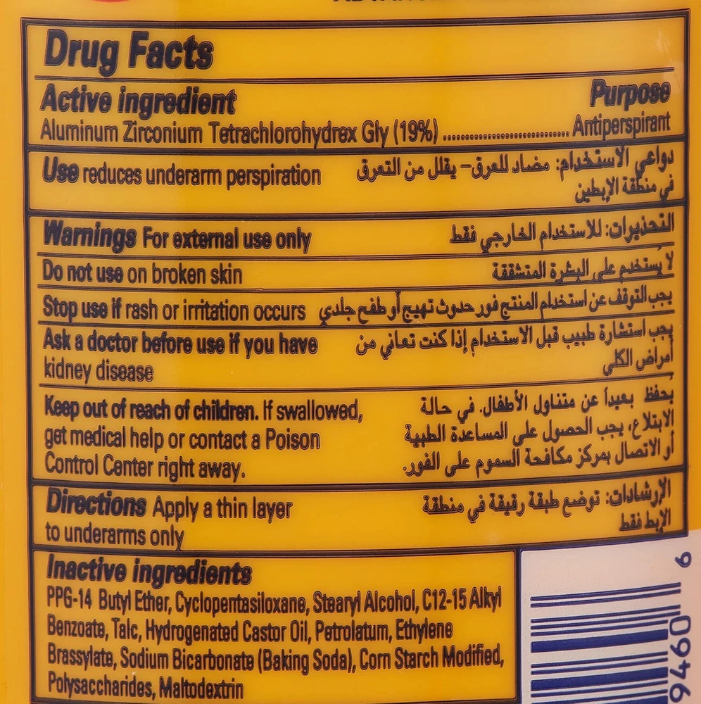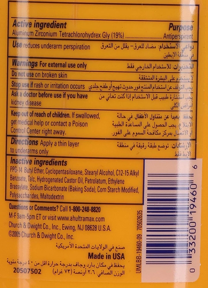 Product Description Arm & Hammer Ultra-max Antiperspirant & Deodorant, Invisible Solid, Unscented, 2.6 Ounce (Pack Of 2) ARM & HAMMER ULTRA MAX deodorant decreases underarm wetness and reduces underarm sweating due to stress. With ULTRA MAX, the natural power of baking soda helps fights odors so you can feel and smell your best and confidently go about your day. Sweat and odor can be a problem for men and women, but with ARM & HAMMER ULTRA MAX you can stay ULTRA fresh! 2.6 oz solid deodorant stick provides Unscented protection. ANTIPERSPIRANT DEODORANT: Solid deodorant stick decreases underarm perspiration POWER OF BAKING SODA: Made from ARM & HAMMER Baking Soda, a natural deodorizer, to help you feel and smell your best ODOR CONTROL: Baking Soda helps to absorb and fight odor, so you don’t have to WORKS AS HARD AS YOU DO: Reduces underarm sweat due to stress ARM & HAMMER ULTRA MAX: Protection you can count on! Combatting Underarm Wetness and Sweating: The deodorant is formulated to combat underarm wetness and excessive sweating, particularly stemming from stress-induced conditions. Utilizes Baking Soda's Potency: Harnesses the innate potency of baking soda, a natural ingredient known for its odor-neutralizing and antibacterial properties. Refreshing and Confident Aura: Aims to provide a refreshing and confident aura throughout the day by targeting and diminishing odor effectively. Shield Against Body Odor: Offers a shield against unwanted body odor, empowering individuals to move through their daily routines with assurance and comfort. Dry and Fresh Sensation: The innovative blend in Ultra Max is stated to help maintain a dry and fresh sensation, contributing to an enhanced sense of well-being. Reliability and Science-Backed Efficiency: Emphasizes reliability by combining personal care with science-backed efficiency to help users face each day with confidence and poise. Ingredients Active Ingredients: Aluminum Zirconium Tetrachlorohydrex Gly (19%) Inactive Ingredients: Cyclopentasiloxane; PPG-14 Butyl Ether; Stearyl Alcohol; Ethylhexyl Isononanoate; Hydrogenated Castor Oil; Talc; Petrolatum; Ethylene Brassylate; Sodium Bicarbonate (Baking Soda); PEG-25 Propylene Glycol Stearate; Silica; Corn Starch Modified; Polysaccharides; Maltodextrin