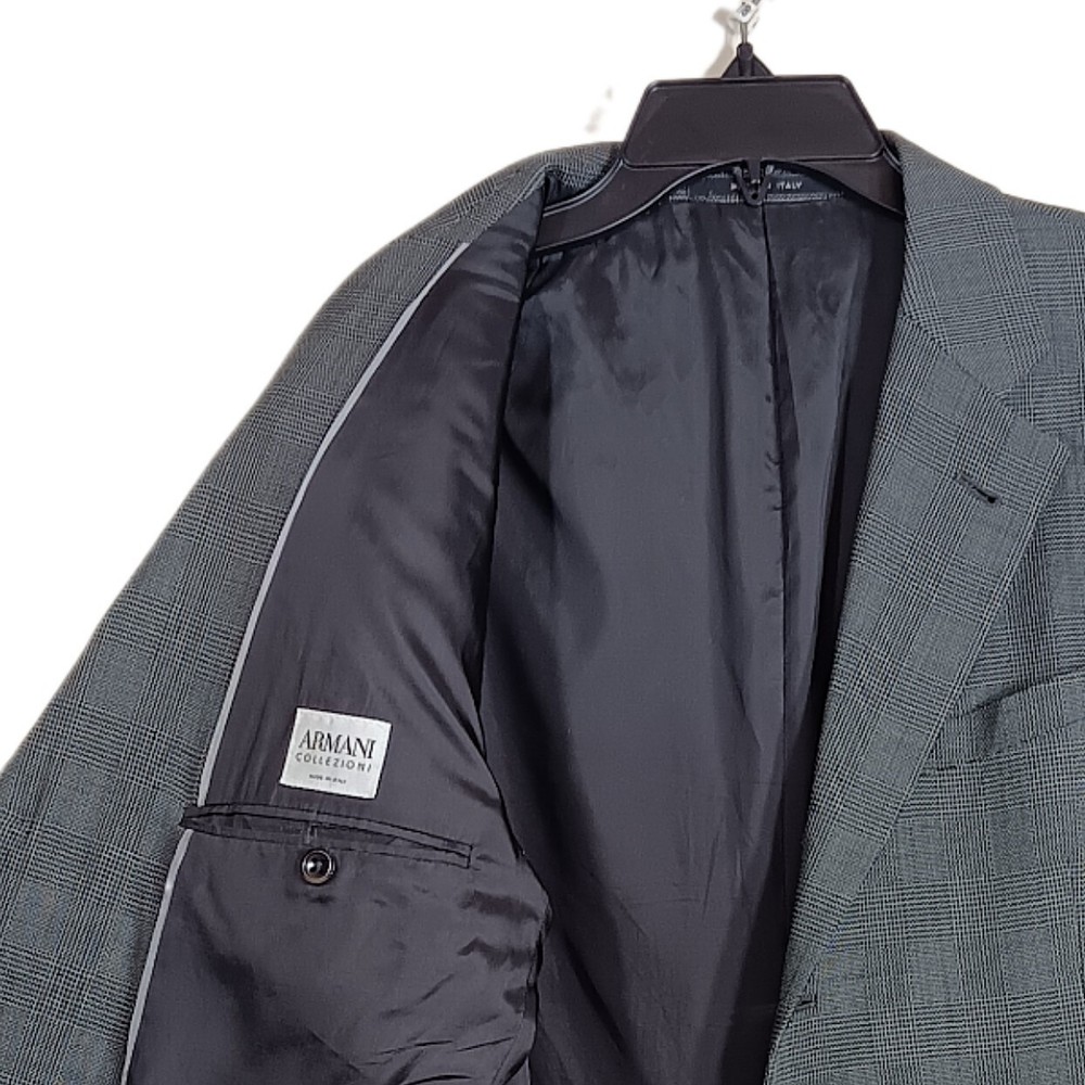 Jacket Vent Style: Ventless Jacket Cut: Single-Breasted Jacket Sleeve Button Style: Four-Button Chest Size: 42 Front Type: Flat Front Color: Gray Lining Material: Viscose/Rayon Jacket Front Button Style: Three-Button Jacket Lapel Style: Notch Jacket/Coat Length: Regular Type: Blazer Brand: Armani Collezioni Size Type: Regular Waist Size: 42 in Material: Wool Department: Men Fit: Classic Style: Blazer Size: L Features: Inner Pockets Pattern: Plaid Seller Notes: “very good, minimal if any signs of wear”