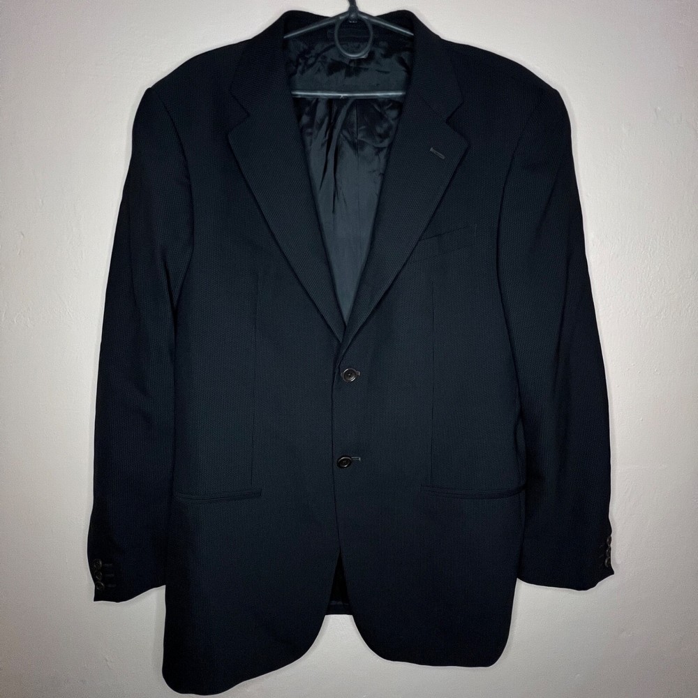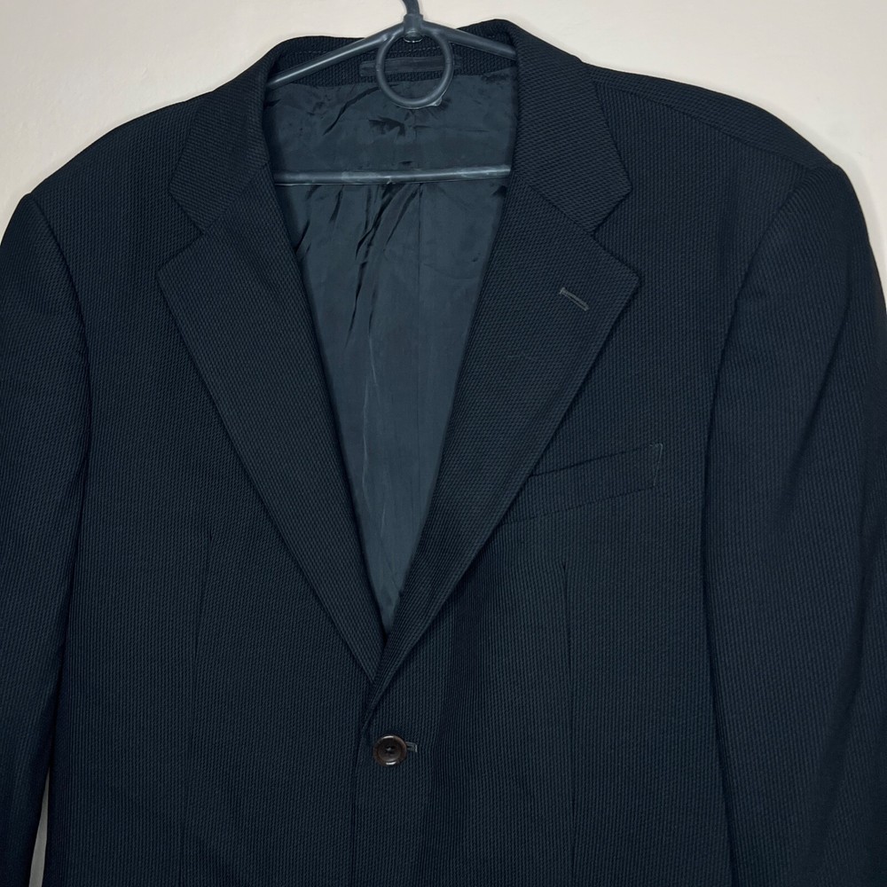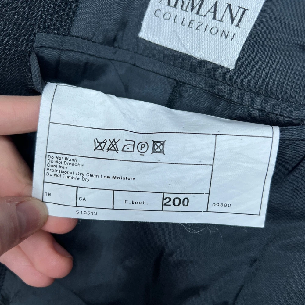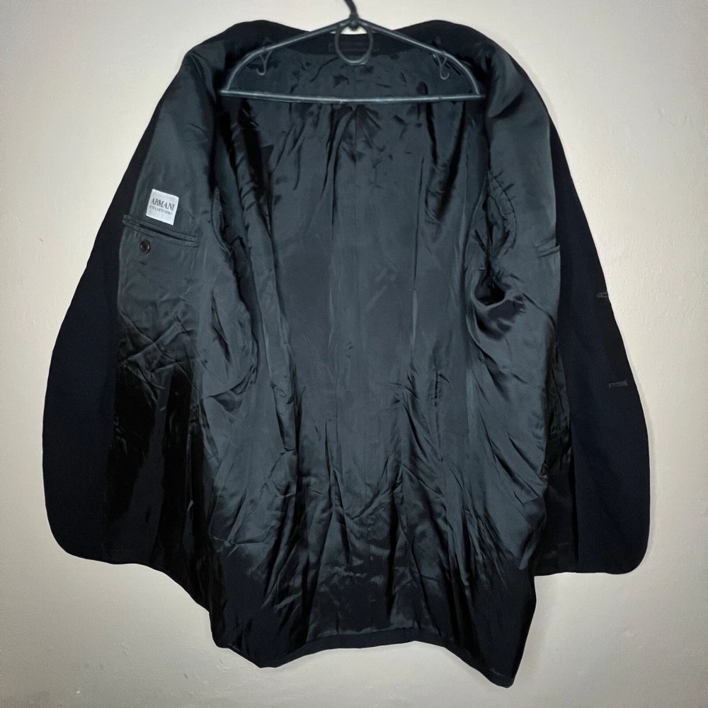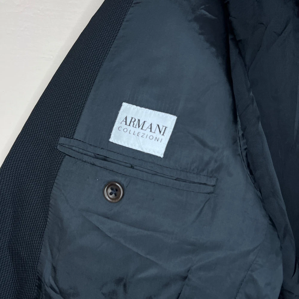 Jacket Lapel Style: Notch Number of Pieces: 2 Piece Size: L Pattern: Solid Vintage: Yes Jacket Vent Style: Double-Vented Jacket/Coat Length: Regular Size Type: Regular Country/Region of Manufacture: Italy Jacket Cut: Single-Breasted Theme: 90s, Classic, Designer Material: Wool Fit: Regular Color: Black Season: Fall, Spring, Winter Department: Men Style: 2 Piece Lining Material: Viscose/Rayon Brand: Armani Collezioni Jacket Front Button Style: Two-Button Fabric Type: Rayon Type: Blazer Jacket Sleeve Button Style: Two-Button