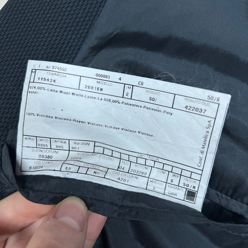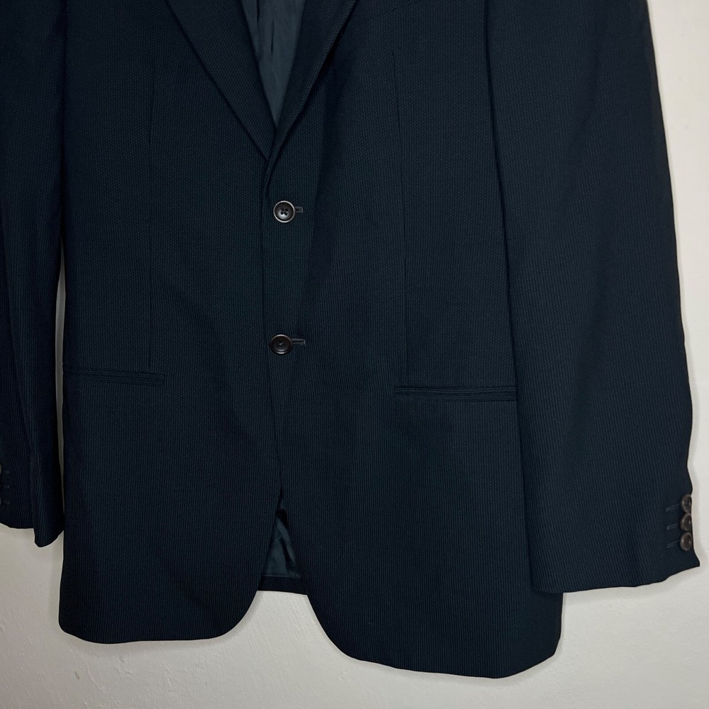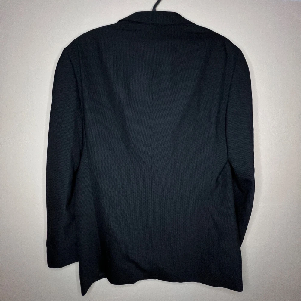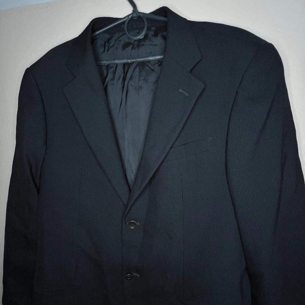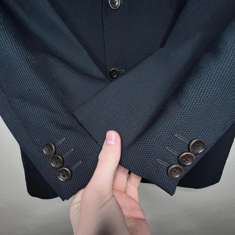Jacket Lapel Style: Notch Number of Pieces: 2 Piece Size: L Pattern: Solid Vintage: Yes Jacket Vent Style: Double-Vented Jacket/Coat Length: Regular Size Type: Regular Country/Region of Manufacture: Italy Jacket Cut: Single-Breasted Theme: 90s, Classic, Designer Material: Wool Fit: Regular Color: Black Season: Fall, Spring, Winter Department: Men Style: 2 Piece Lining Material: Viscose/Rayon Brand: Armani Collezioni Jacket Front Button Style: Two-Button Fabric Type: Rayon Type: Blazer Jacket Sleeve Button Style: Two-Button