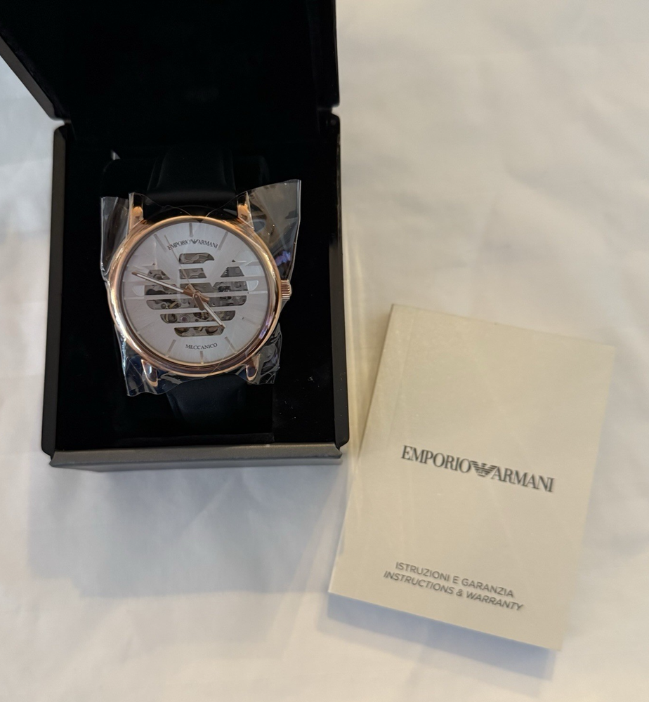 The Emporio Armani Luigi Skeleton Leather Automatic Men's Watch AR60031 is a stylish and sophisticated timepiece designed for men. This wristwatch features a sleek rose gold case color with a black leather band, making it a classic choice for formal occasions. With 21 jewels and an automatic movement, this watch offers precision and reliability. The watch comes with papers, original box/packaging, and is part of the Emporio Armani Meccanico collection, known for its elegant design and quality craftsmanship. Perfect for those looking for a dressy and functional timepiece that exudes luxury and style.