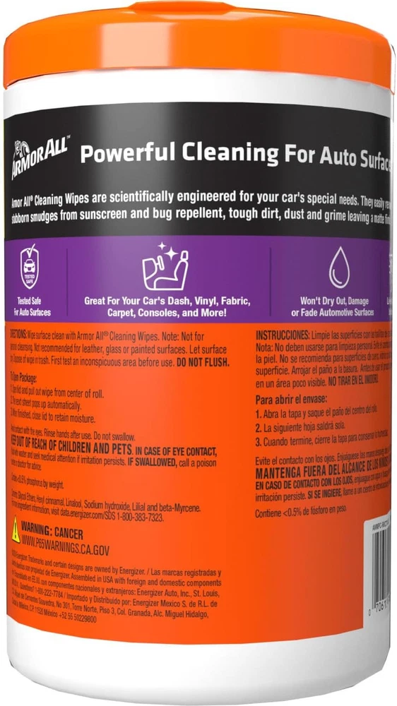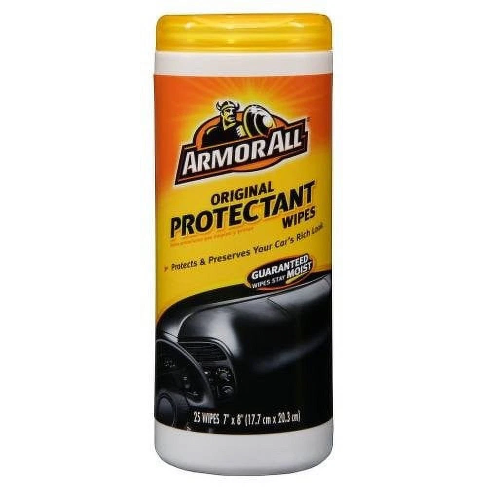 Armor All Original Formula Car Interior Cleaner, with UV Protection Wipes, 30 Count (Pack Of 8) Restore luster and shine to your dash in seconds with Armor All Original Formula Car Protectant Wipes. These disposable wipes are formulated with Armor All Protectant's proven protection for your automotive interior. Safe on vinyl, rubber and plastic, this car interior protectant not only revitalizes the look of your interior it also prevents cracking, fading, discoloration and premature aging. About this item 30 count canister of Armor All Original Formula Car Protectant Wipes for interior automotive surfaces A convenient wipe with the proven protection of Armor All Original Protectant for protection you can trust These car wipes safely clean and protect automotive interiors, including vinyl, plastic and rubber surfaces Automotive wipes help protect against UV damage to help prevent cracking, fading and premature aging Adds shine to restore the rich, deep look of your dashboard, console, door panels and vinyl seats Non-greasy and lint-free wipes feature a moisture Lock Lid to maintain freshness for up to one year As a final touch, the vinyl protectant adds gorgeous shine. These lint-free wipes leave behind an exceptional clean, So you can detail the dashboard, console, door panels and vinyl seats in record time. Other car care products may call themselves protectant, but only one can call itself Armor All! With one swipe, this car interior cleaner does double duty as a dust remover and protectant against UV damage.