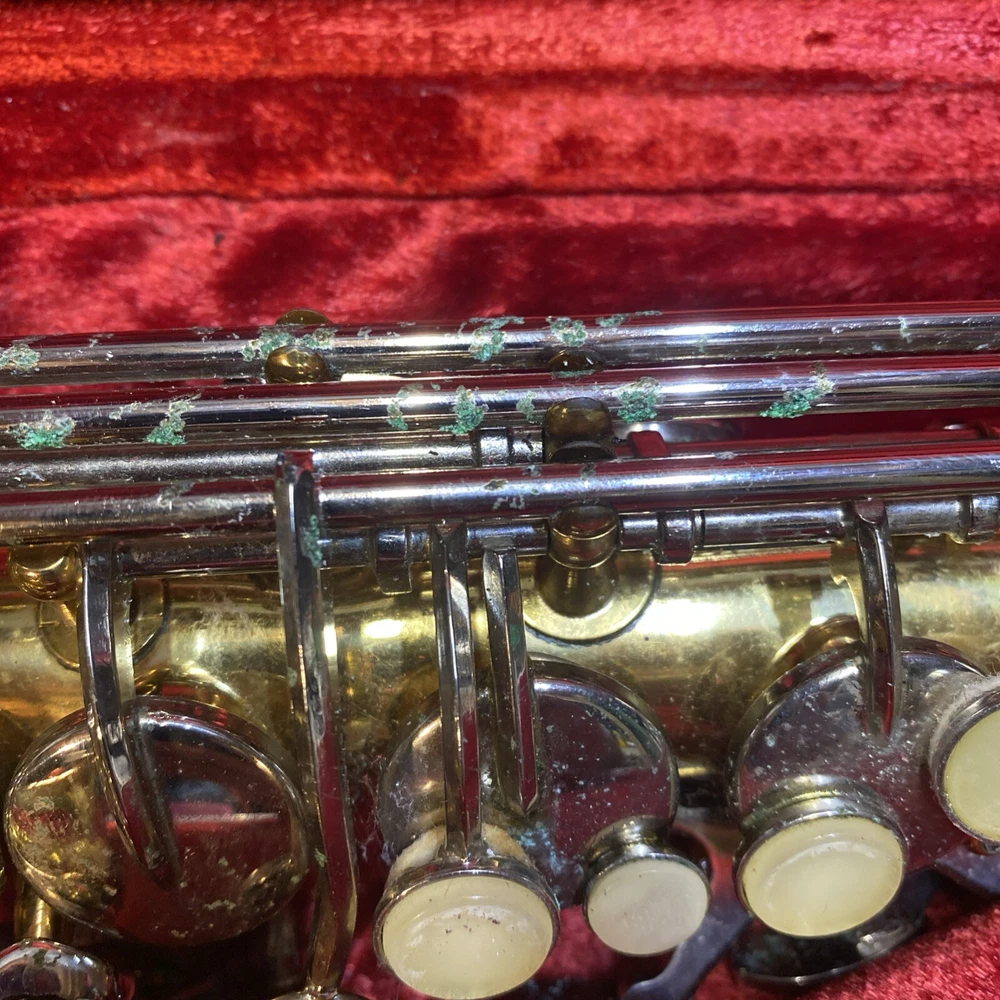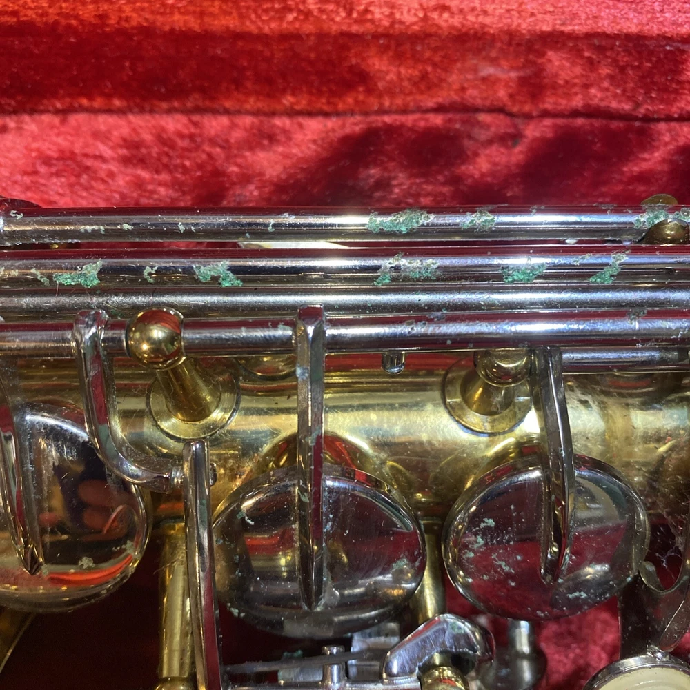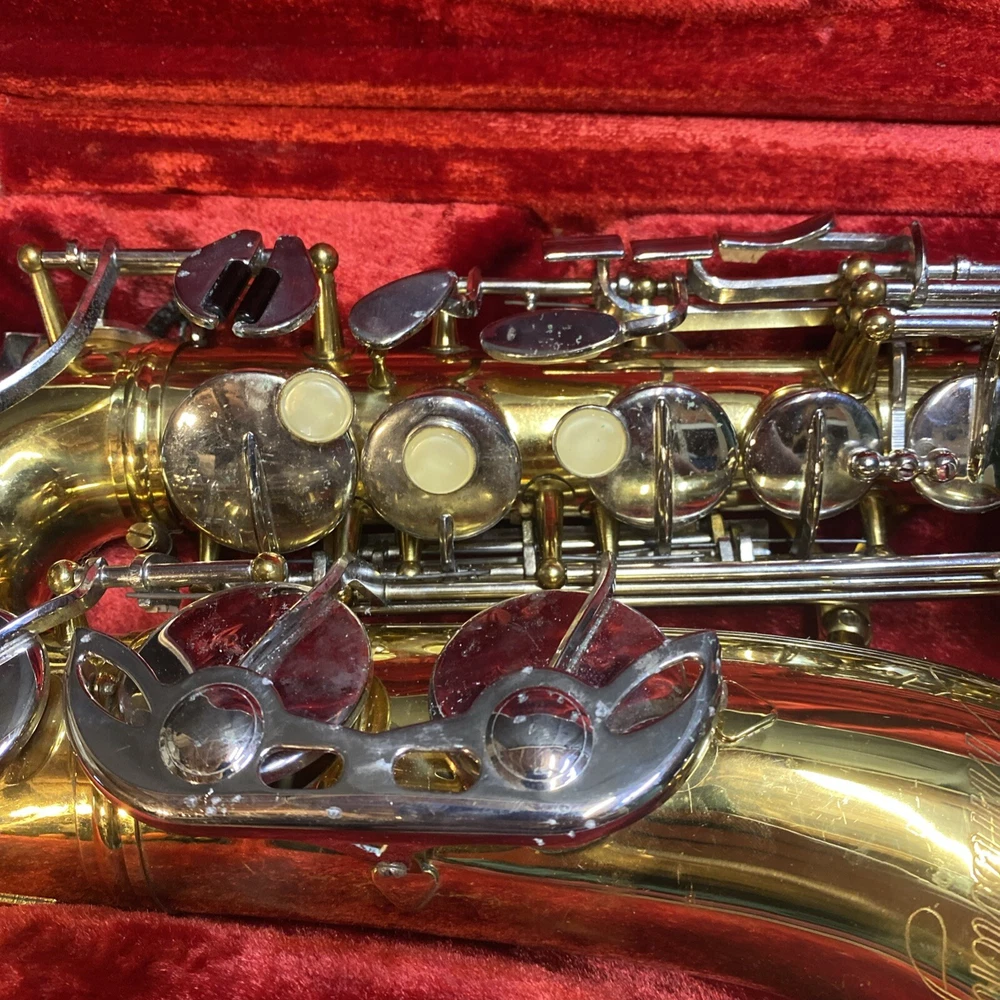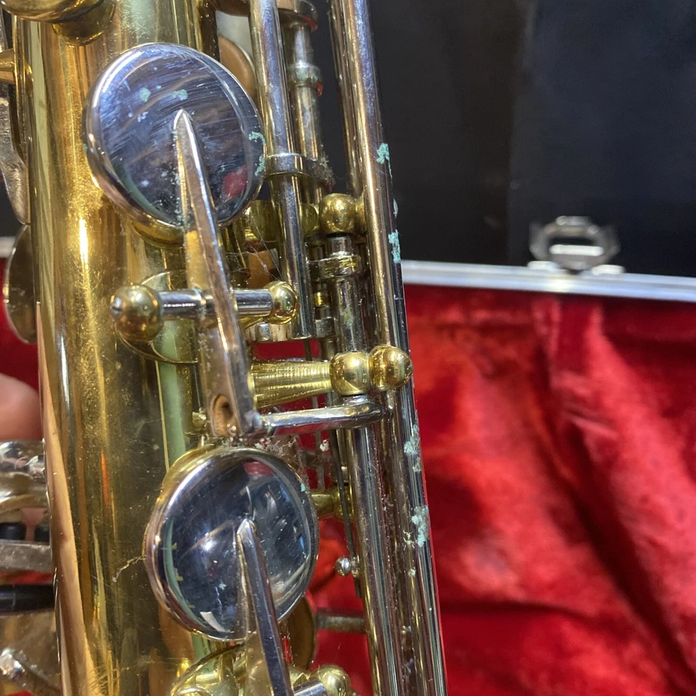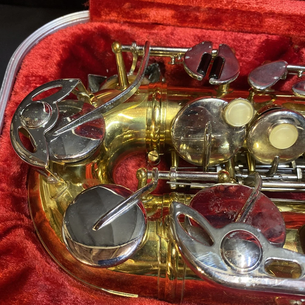This Armstrong Alto Saxophone comes in a hard case with accessories and is perfect for beginners. The body is made of brass with a beautiful gold color. The instrument is made in the United States and is ideal for use in a band or orchestra. The package includes a case and other accessories, making it easy to transport and protect your instrument while on the go. Whether you're a beginner or an experienced player, this saxophone is a great choice for anyone looking for a high-quality instrument. Has scratches and w ear and some small dents to finish has some oxidation/pitting/green marks on the chrome metal area areas . Case itself has scratches/wear/scuff marks but overall in good usable condition