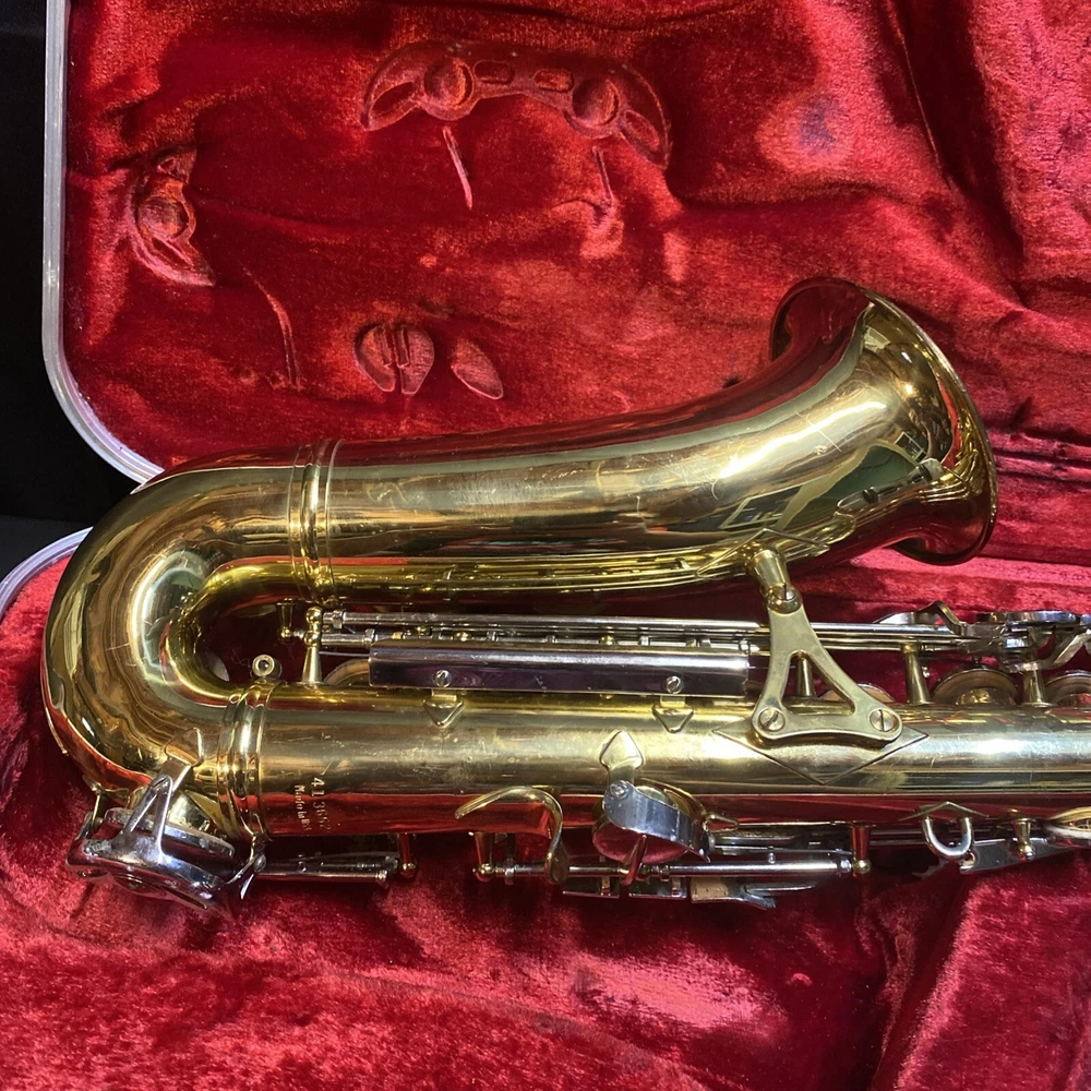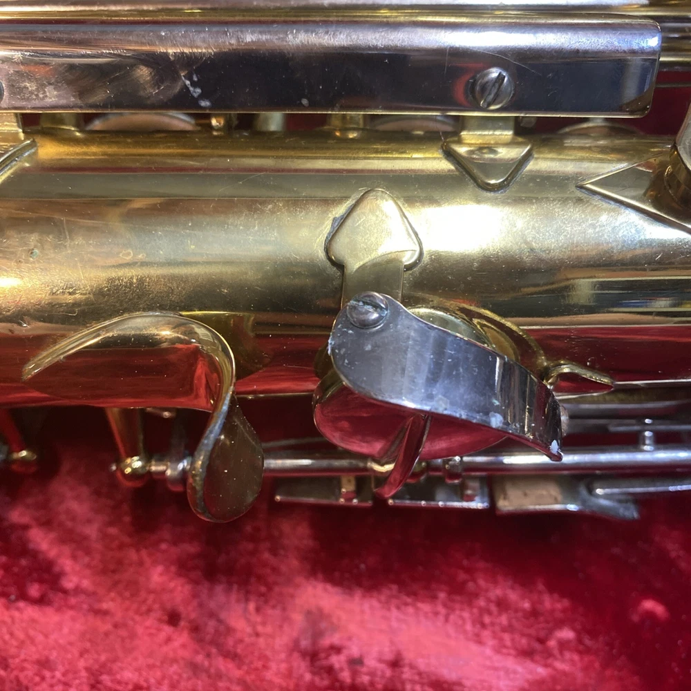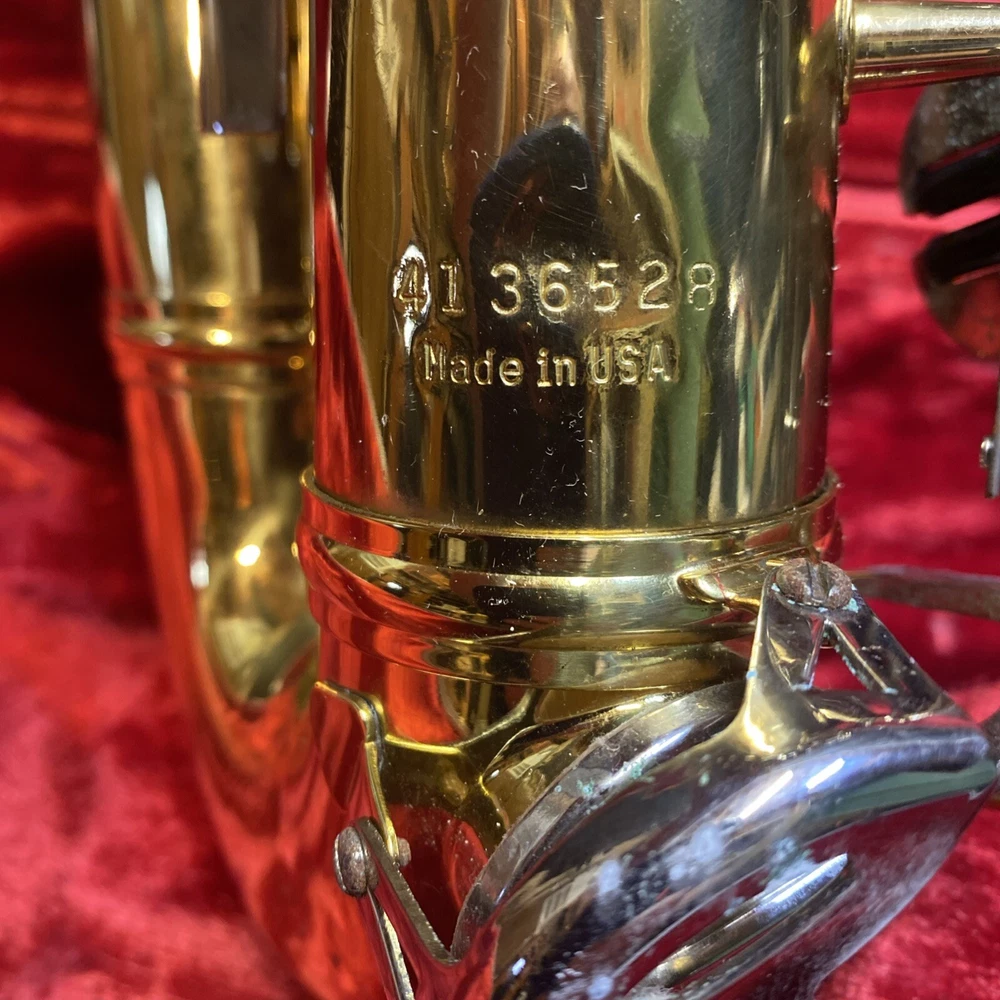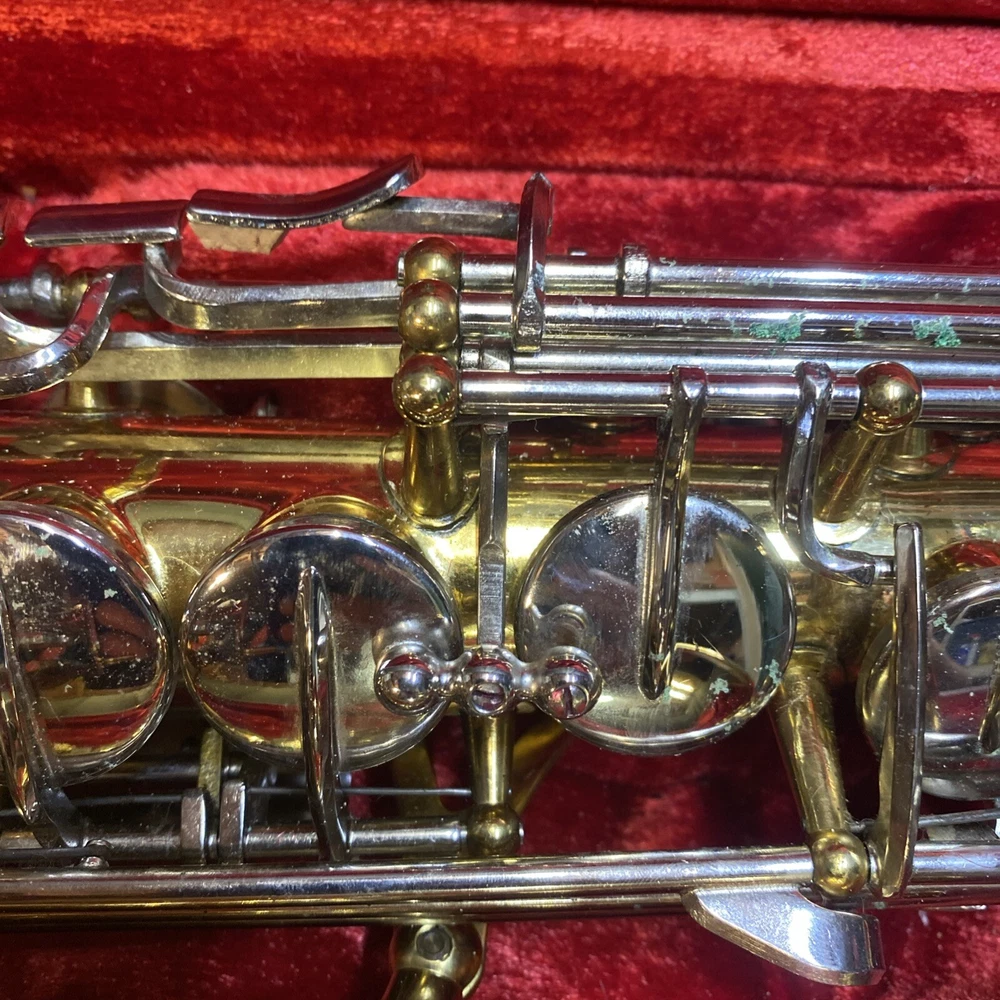 This Armstrong Alto Saxophone comes in a hard case with accessories and is perfect for beginners. The body is made of brass with a beautiful gold color. The instrument is made in the United States and is ideal for use in a band or orchestra. The package includes a case and other accessories, making it easy to transport and protect your instrument while on the go. Whether you're a beginner or an experienced player, this saxophone is a great choice for anyone looking for a high-quality instrument. Has scratches and w ear and some small dents to finish has some oxidation/pitting/green marks on the chrome metal area areas . Case itself has scratches/wear/scuff marks but overall in good usable condition