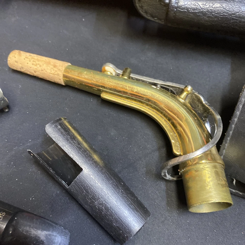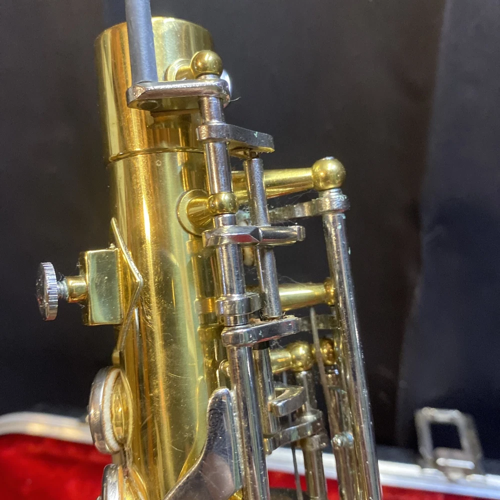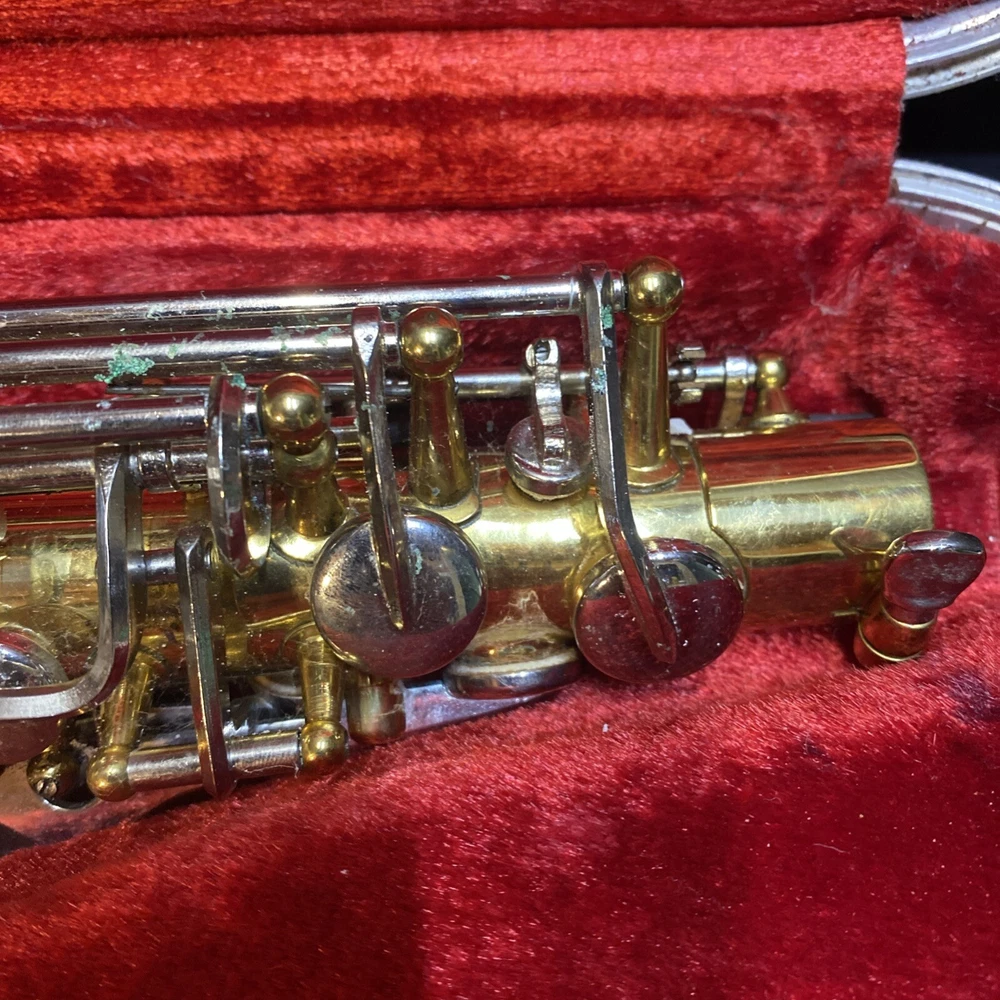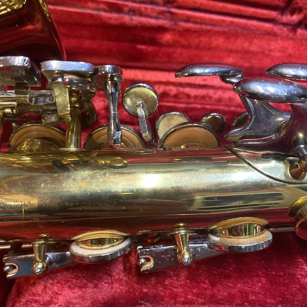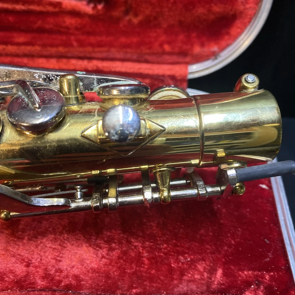 This Armstrong Alto Saxophone comes in a hard case with accessories and is perfect for beginners. The body is made of brass with a beautiful gold color. The instrument is made in the United States and is ideal for use in a band or orchestra. The package includes a case and other accessories, making it easy to transport and protect your instrument while on the go. Whether you're a beginner or an experienced player, this saxophone is a great choice for anyone looking for a high-quality instrument. Has scratches and w ear and some small dents to finish has some oxidation/pitting/green marks on the chrome metal area areas . Case itself has scratches/wear/scuff marks but overall in good usable condition