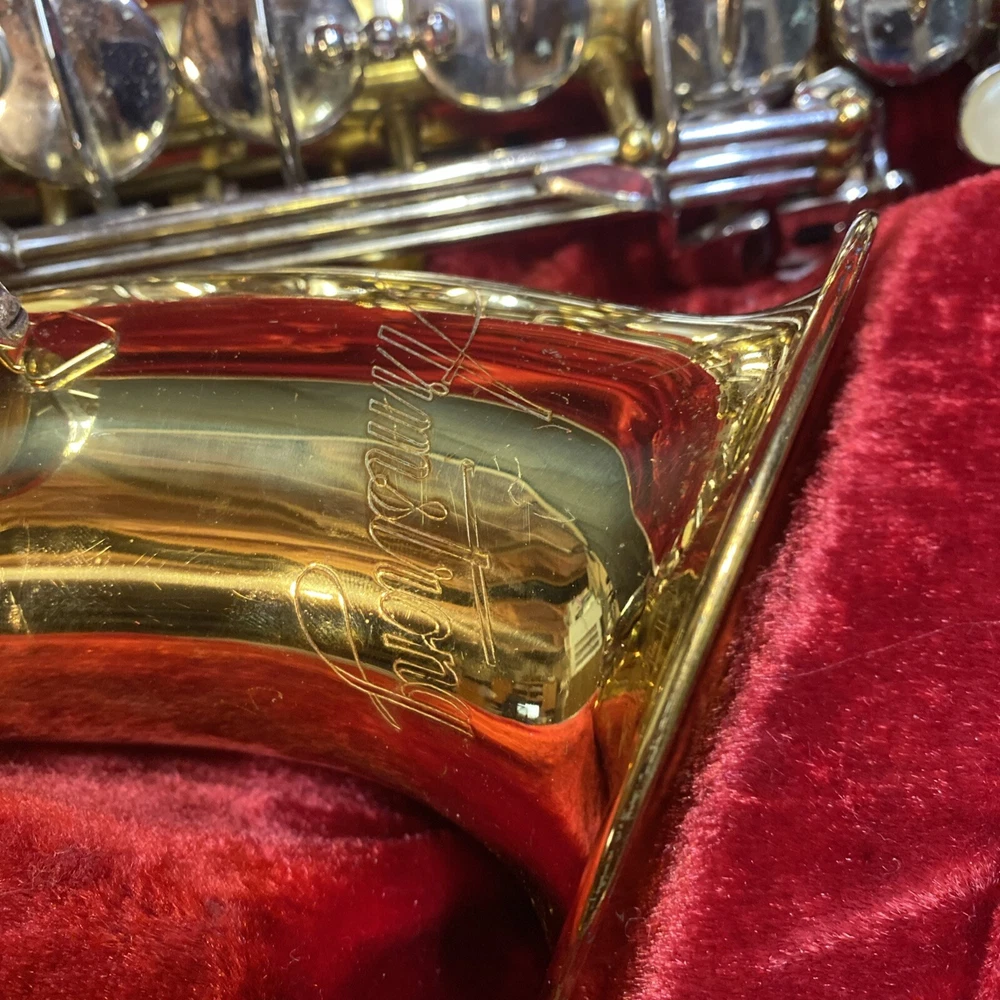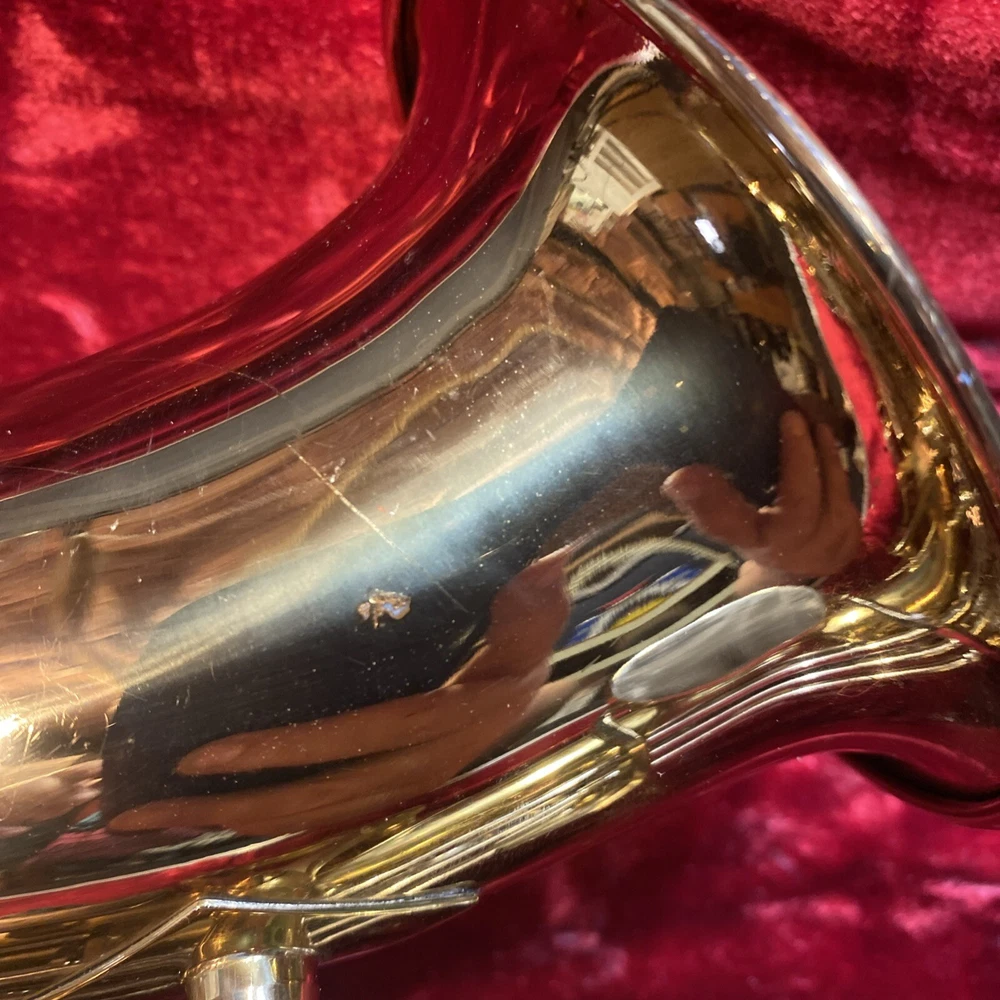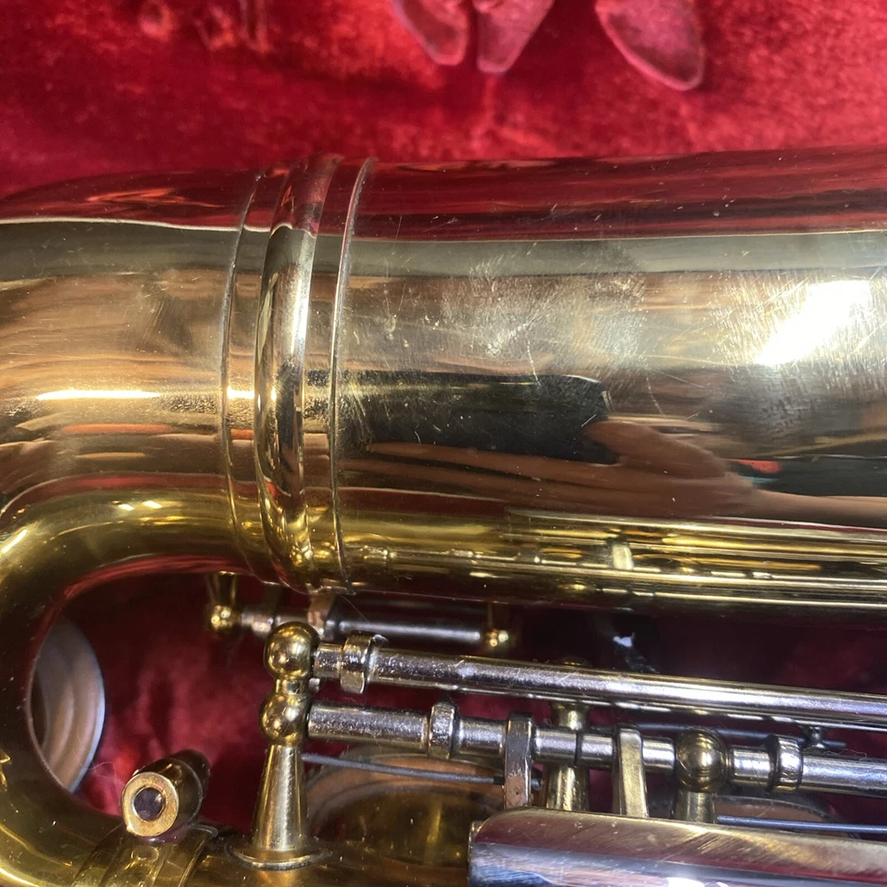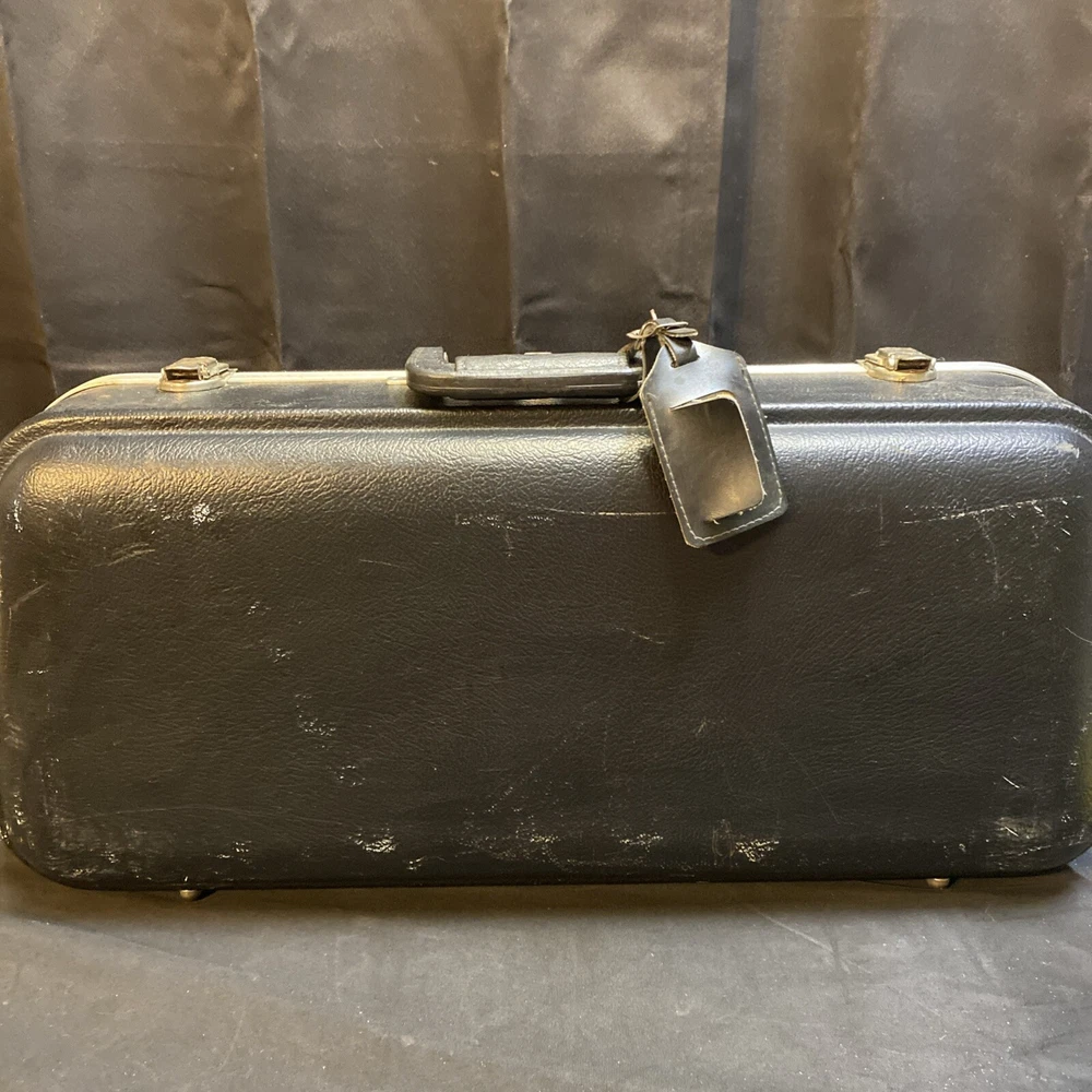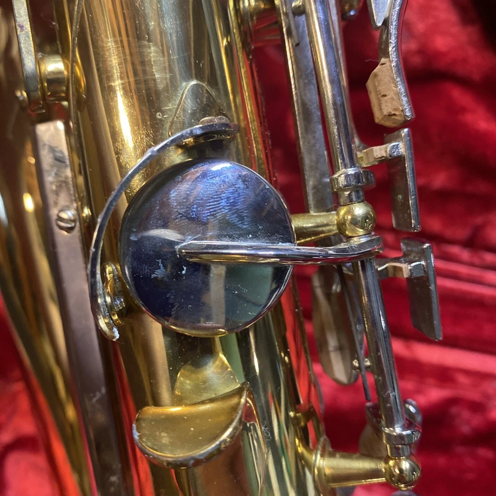 This Armstrong Alto Saxophone comes in a hard case with accessories and is perfect for beginners. The body is made of brass with a beautiful gold color. The instrument is made in the United States and is ideal for use in a band or orchestra. The package includes a case and other accessories, making it easy to transport and protect your instrument while on the go. Whether you're a beginner or an experienced player, this saxophone is a great choice for anyone looking for a high-quality instrument. Has scratches and w ear and some small dents to finish has some oxidation/pitting/green marks on the chrome metal area areas . Case itself has scratches/wear/scuff marks but overall in good usable condition