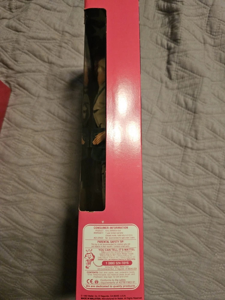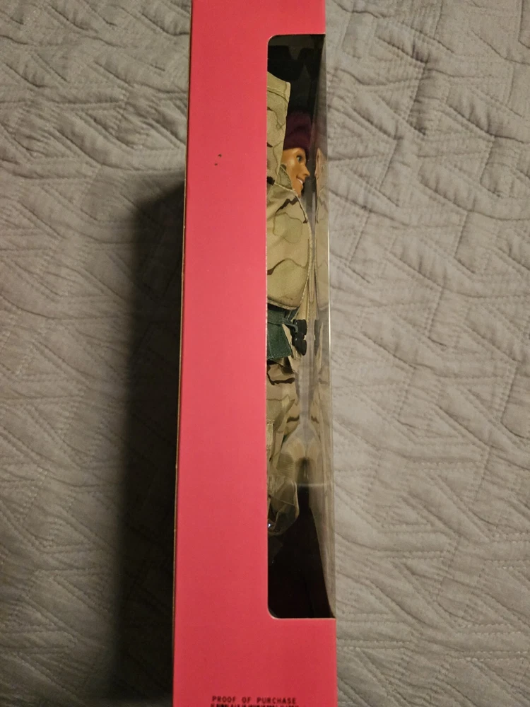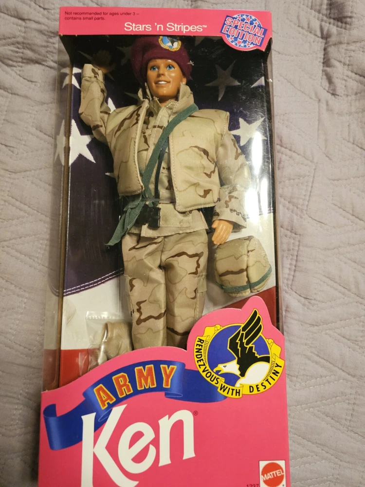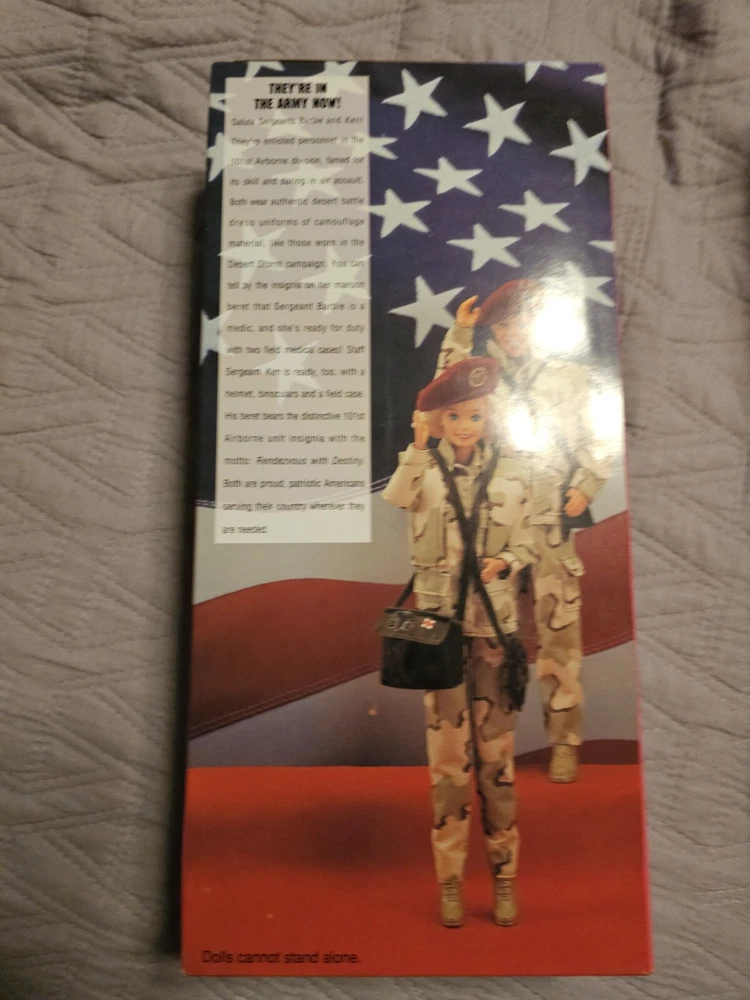 This is a vintage Barbie doll set from the Stars and Stripes product line, manufactured in 1992. The set includes an Army Barbie doll with blonde hair and blue eyes, along with her boyfriend Ken. The dolls come in their original, unopened packaging and are in special edition format. This set is an original, licensed reproduction from the 1990-1999 time period and features Barbie's classic fashion doll design. The dolls are of Caucasian ethnicity and the set includes only the dolls themselves. In perfect condition!