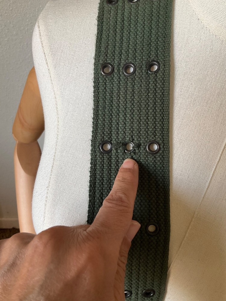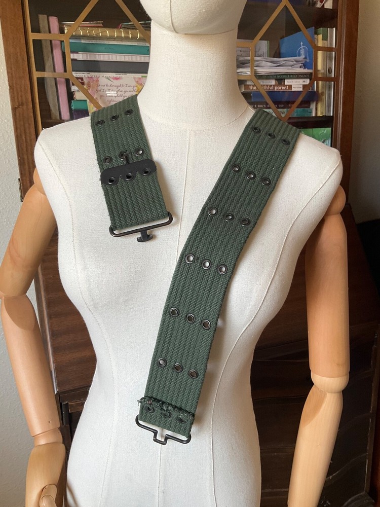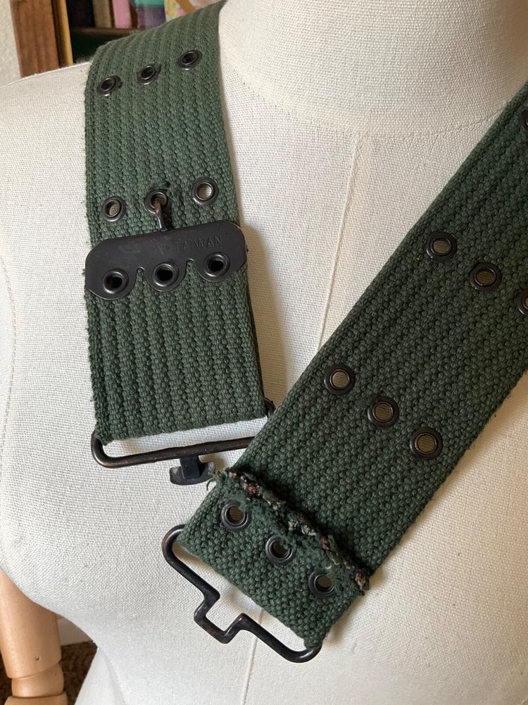 The Army Green Canvas Belt is a heavy-duty military-themed accessory designed for men in size 38. Made from cotton canvas, this belt features a two-hole design with a width of 1.75 inches, providing a stylish and functional addition to any outfit. With its military/webbed and fashion belt styles, this versatile accessory is perfect for adding a rugged touch to casual or outdoor attire. For men or women. One hole has direct look at pictures sold as is. No returns