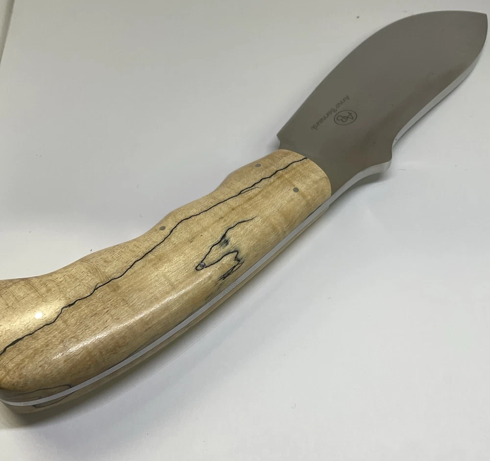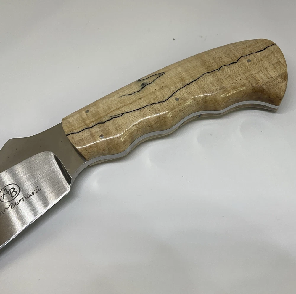 The Arno Bernard Hippo Giant Fixed Blade Hunting Skinner Knife is a handmade hunting knife designed by the brand Arno Bernard in South Africa. The blade is made of N690 stainless steel with a full tang construction, making it durable for hunting tasks. The handle is crafted from bone material, giving it a traditional and rustic look. With a blade length between 4.1 to 5 inches, this knife is suitable for skinning and other hunting needs. Its ambidextrous design allows for easy handling by both left and right-handed users.
