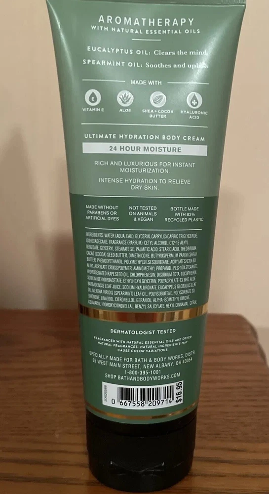 Skin Type: All Skin Types UPC: 667558209714 Set Includes: Daily Use Type: Daily Use Color: White Active Ingredients: Aloe Vera, Hyaluronic Acid, Shea Butter, Cocoa Butter, Vitamin E, Eucalyptus Sun Protection Factor (SPF): SPF 0 MPN: NA Product Line: Bath and body works Country/Region of Manufacture: United States Manufacturer: Bath and Body Works Formulation: Cream UVA Protection: NA Ingredients: Aloe Vera, Cocoa Butter, Shea Butter, Hyaluronic Acid, Vitamin E, Eucalyptus gtin13: 667558209714 Body Area: Full Body Features: Animal Cruelty-Free, Hydrating, Eucalyptus Brand: Bath & Body Works Volume: 8 fl oz Department: Unisex Size: Regular Scent: Eucalyptus, Spearmint Main Purpose: Stress Relief, Christmas, New Years, Hanukkah, Valentine’s Day, Birthday gift