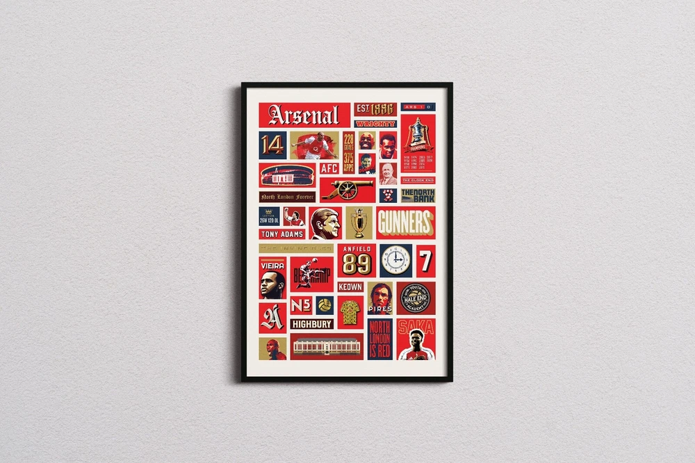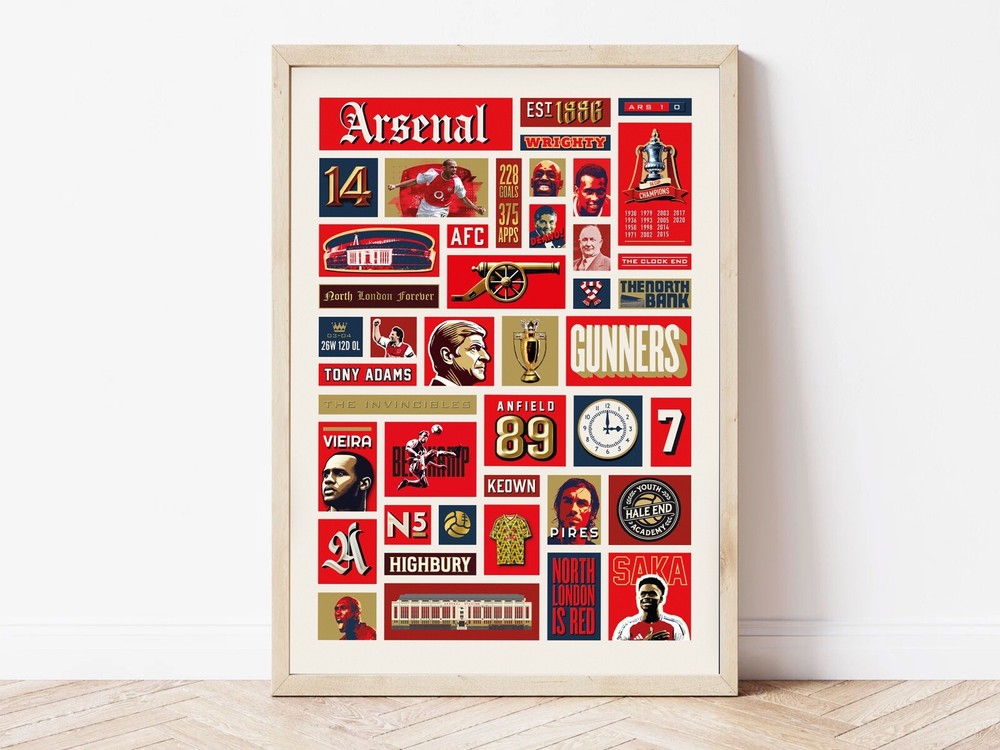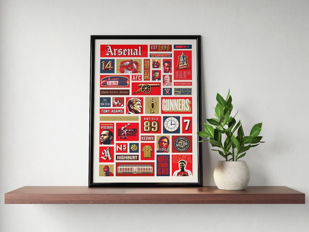 A graphical poster featuring famous characters, achievements and events in Arsenal's history. This poster print would make the perfect gift for any Arsenal supporter, whether it be your dad, your boyfriend or a best friend. It features legendary figures of the club such as Arsene Wenger, Herbert Chapman, Patrick Vieira, and record goal-scorer Thierry Henry. The print celebrates iconic moments in the past such as the The Invincibles and their old home Highbury Stadium, as well as popular Arsenal phrases such as 'The Clock End' and 'The North Bank'. This is a piece of Arsenal Wall Decor packed with important fan references. You will receive a high-quality Arsenal print on a lustre finish 260gsm fine art paper, which was carefully selected to elevate the vibrant colours featured in each design. Prints are made using professional Canon Pro printing equipment, which gives much smoother gradient transitions and a wider colour gamut. In other words, more depth and richness to the final print, which helps to create stunning vibrant artwork with amazing reproduction. A Giclée print is highly durable and will last a lifetime without any fading or bronzing. Framed Prints: Crafted from durable pine wood, the sturdy black frame is built to last and features shatterproof plexiglass to protect your print for years to come. The frames come pre-packed with corners and wrap and then packed in a box with strong edges to protect the frames. I-beams are used in addition, to give the package additional sturdiness. Postage & Packaging: A4 only prints will be delivered flat in rigid board backed envelopes. A3, A2 & A1 prints will be rolled into sturdy cardboard tubes.