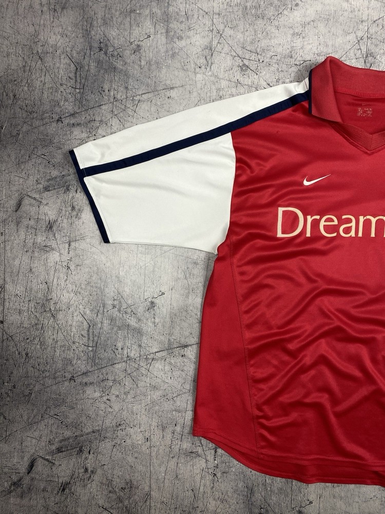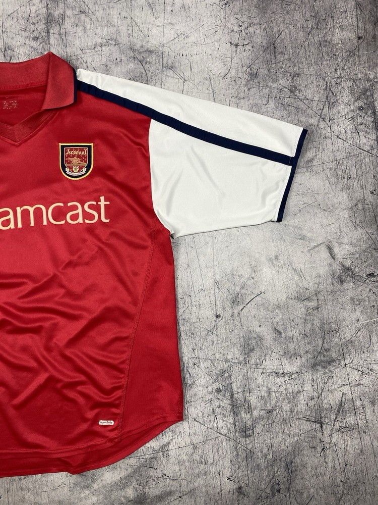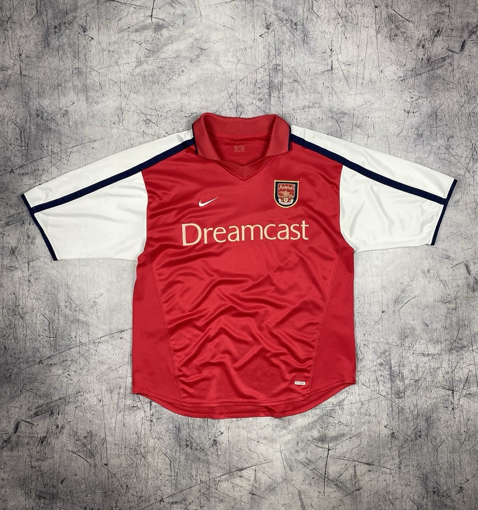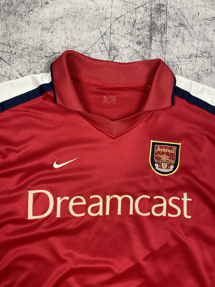 Arsenal FC Home Shirt 2000–2002 – Nike Dreamcast Iconic Arsenal jersey from the Dreamcast era. Original Nike production, adult size XL. Measurements: • Shoulders: 53 cm / 20.9 in • Chest: 58 cm / 22.8 in • Length: 75 cm / 29.5 in Condition: good vintage. Sponsor print has cracking on letter “M” – typical for age, please see photos. 100% authentic. Worldwide shipping with tracking.