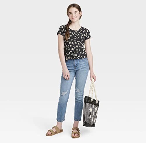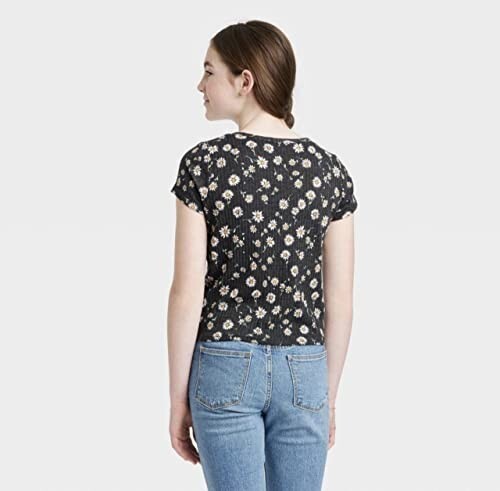 Art Class Girls Button-Front T-Shirt Short Sleeve Pullover Button Front Ribbed Tee Black Floral Girls Large (10-12) Model wears size L and is 5'2" Breathable cotton-blend fabric Allover daisy print on a ribbed backdrop Crew neckline with button-down front Length: At Hip, Contemporary fit 60% Cotton, 40% Polyester Add fun floral prints to her warm-weather wear with this Button-Front T-Shirt from art class. The short-sleeve pullover is made from a breathable cotton-blend fabric to let them breeze through the day in comfort, while an allover daisy print on a ribbed backdrop will help her look stand out. It's tailored in a contemporary-fit silhouette with a button-down front for easy wear. Your kid is sure to reach for this ribbed floral top to create tons of cute ensembles with all of their fave shorts, skorts, jeans and skirts.