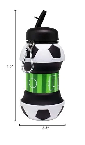 Food Silicone – Our soccer-ball-shaped water bottle consists of BPA-free silicone that has no harsh chemicals Includes a Carrying Clip – The secure clip at the top of the BPA-free water bottle allows you to carry it hands free Large Capacity Water Bottle – With 18 ounces of capacity, will have plenty of water on hand for playing soccer, hiking or attending school Collapsible Design – When extended, either end of the water bottle looks like half a soccer ball, and when fully collapsed, the bottle takes on a round soccer ball shape Leak Proof Drinking Spout – won’t spill the water while they’re drinking, thanks to the secure lid and the drinking spout mechanism